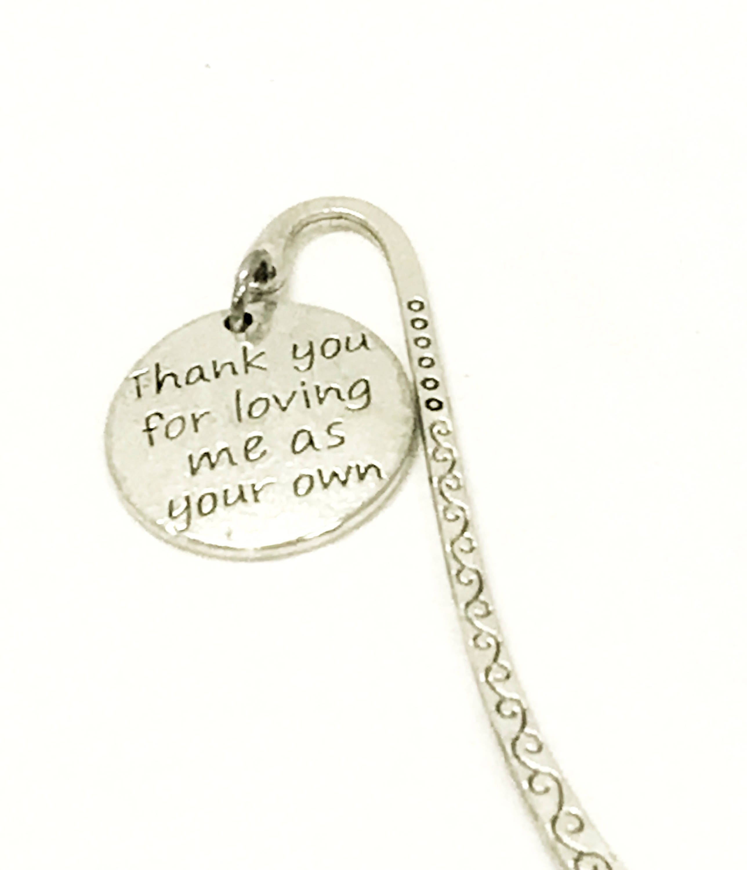 This is a great bookmark gift. It is a bookmark with a charm that has "Thank you for loving me as your own" on it. The bookmark measures approx. 3.3 Inches in length and would be a great bookmark for smaller paperbacks or smaller, compact planners or bibles.