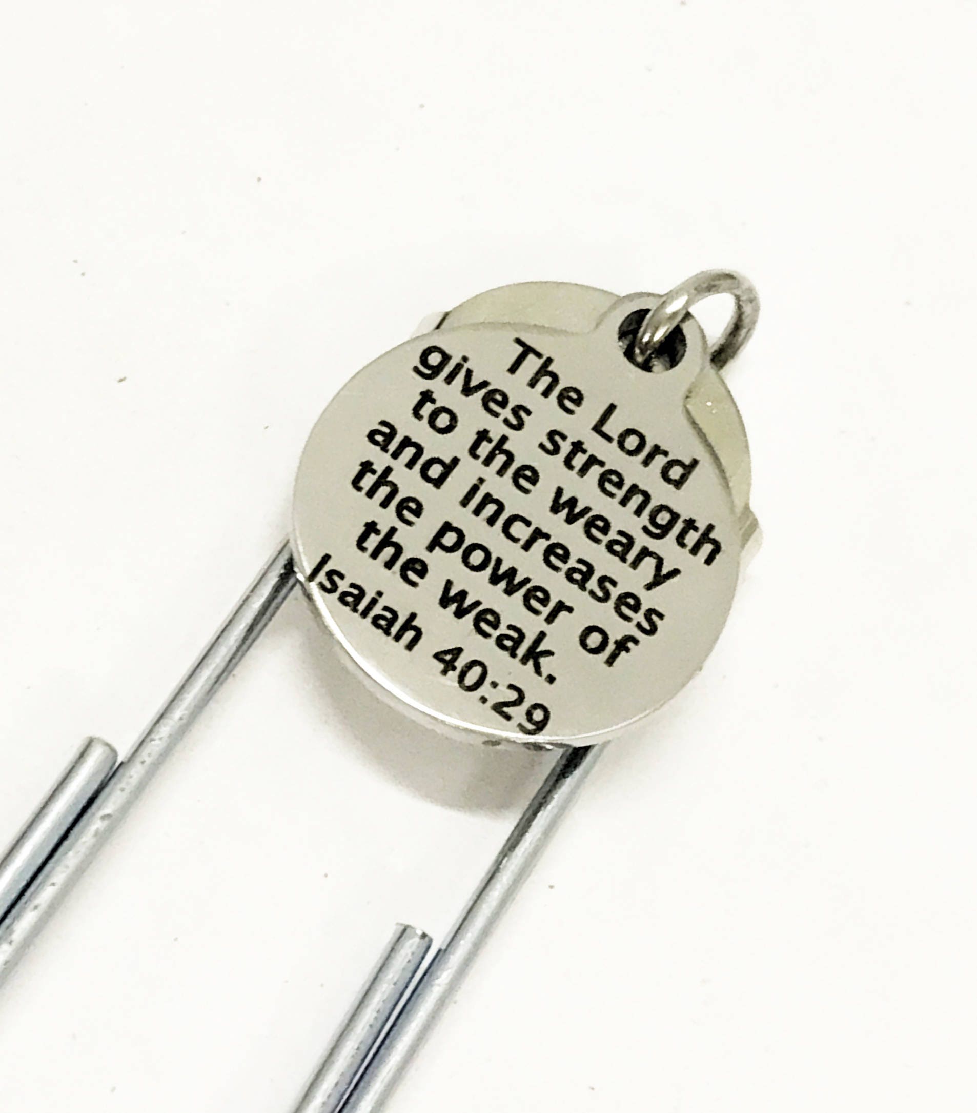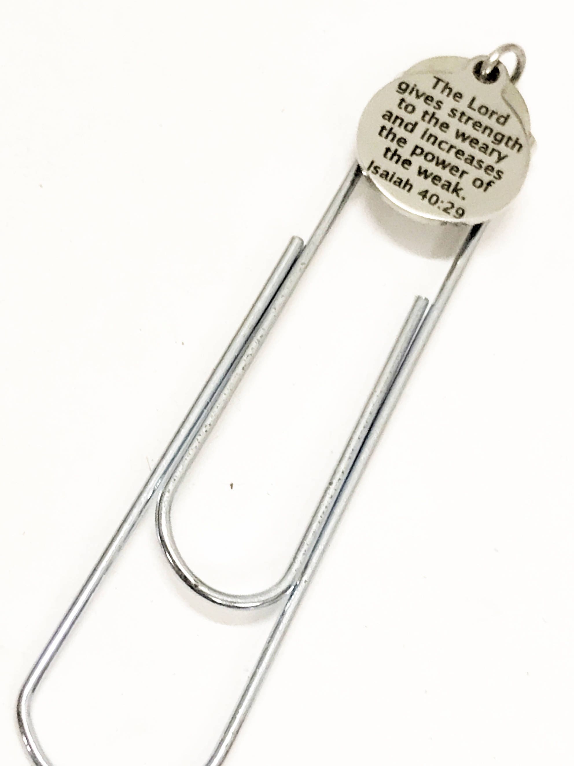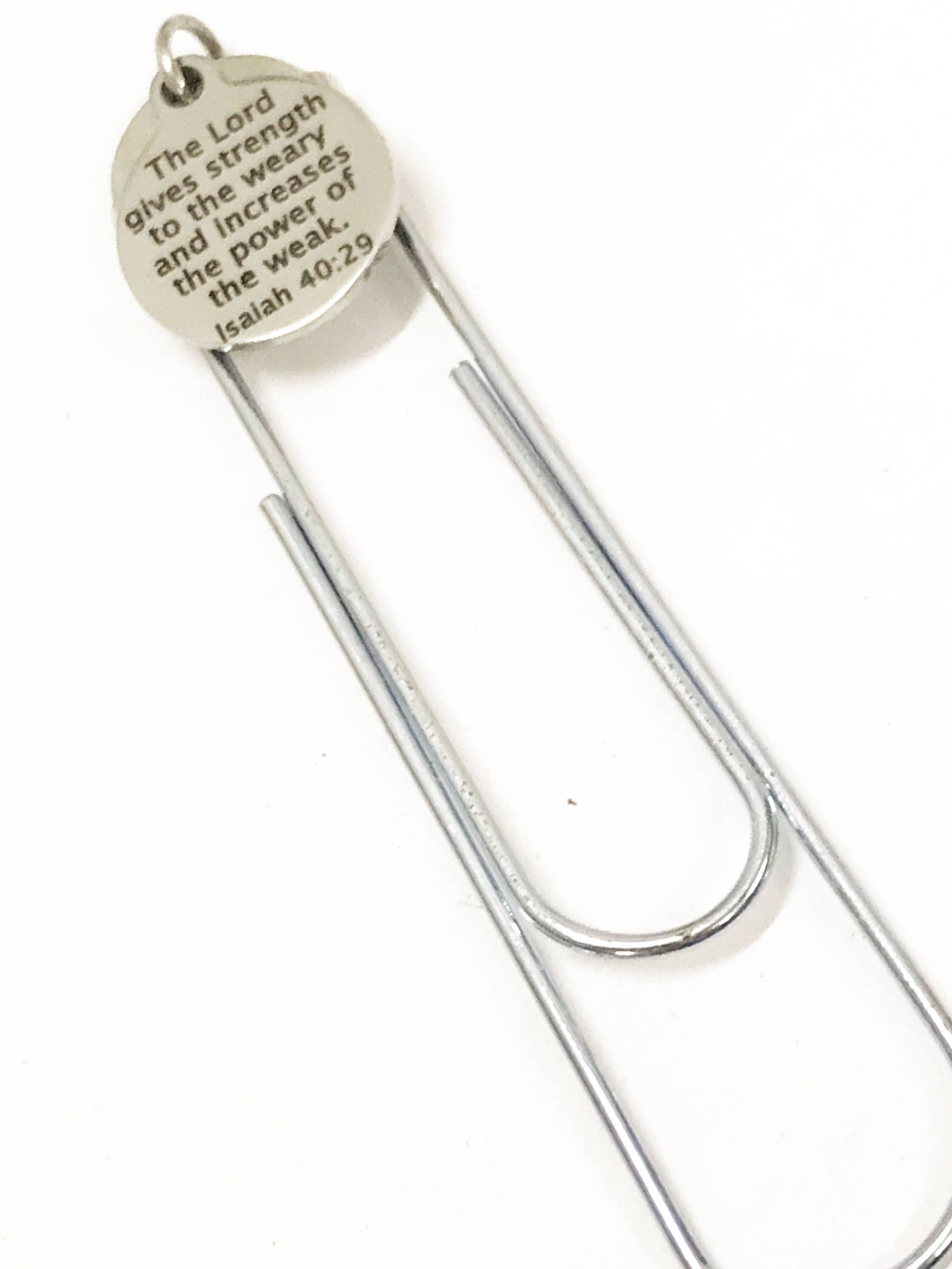 This is a great Christian encouragement bookmark. This paper clip bookmark has a stainless steel laser engraved charm with the Bible verse of Isaiah 40:29 “The Lord gives strength to the weary and increases the power of the weak” on it. It can be used as a bookmark, page marker, or planner book mark.