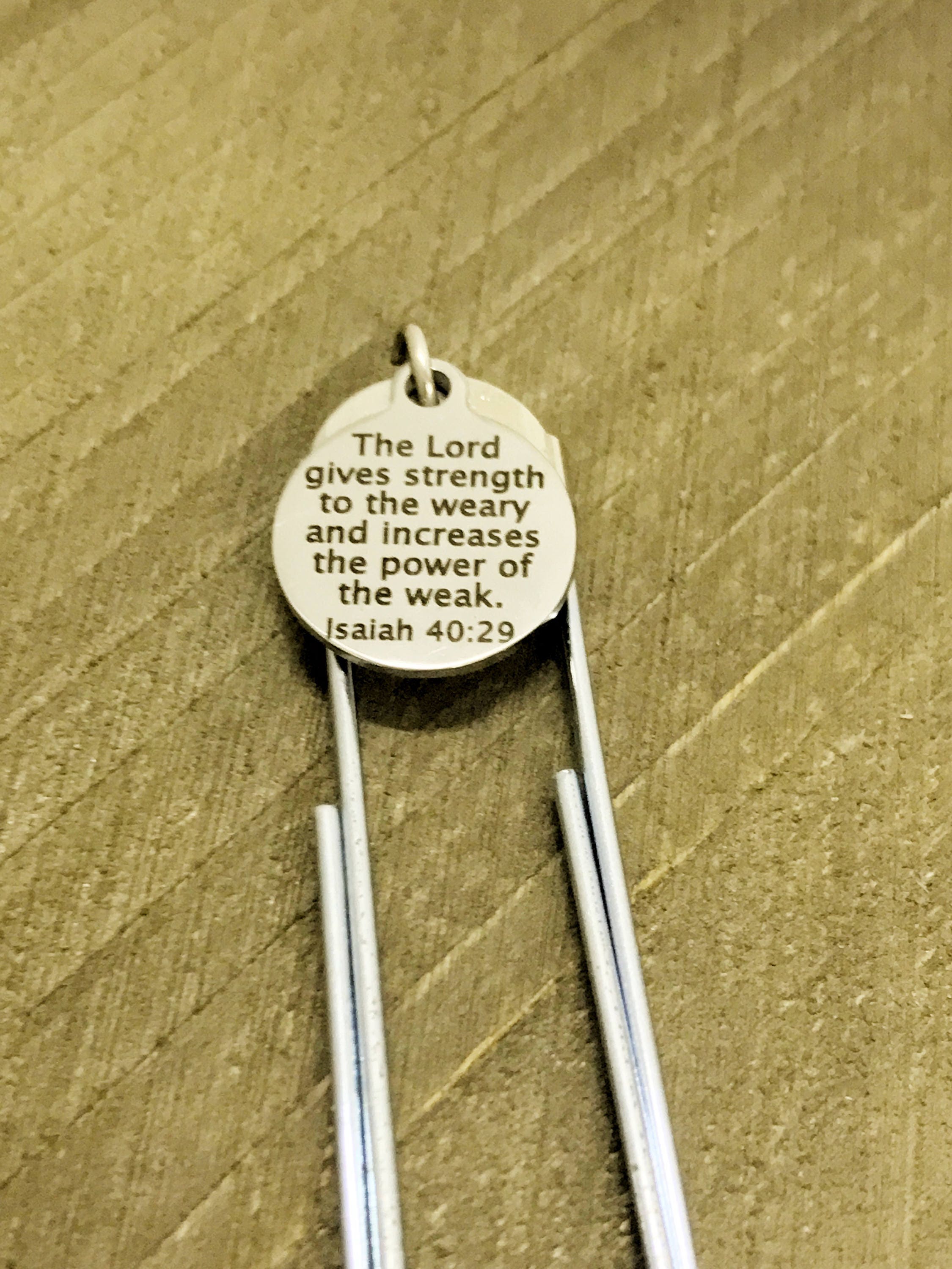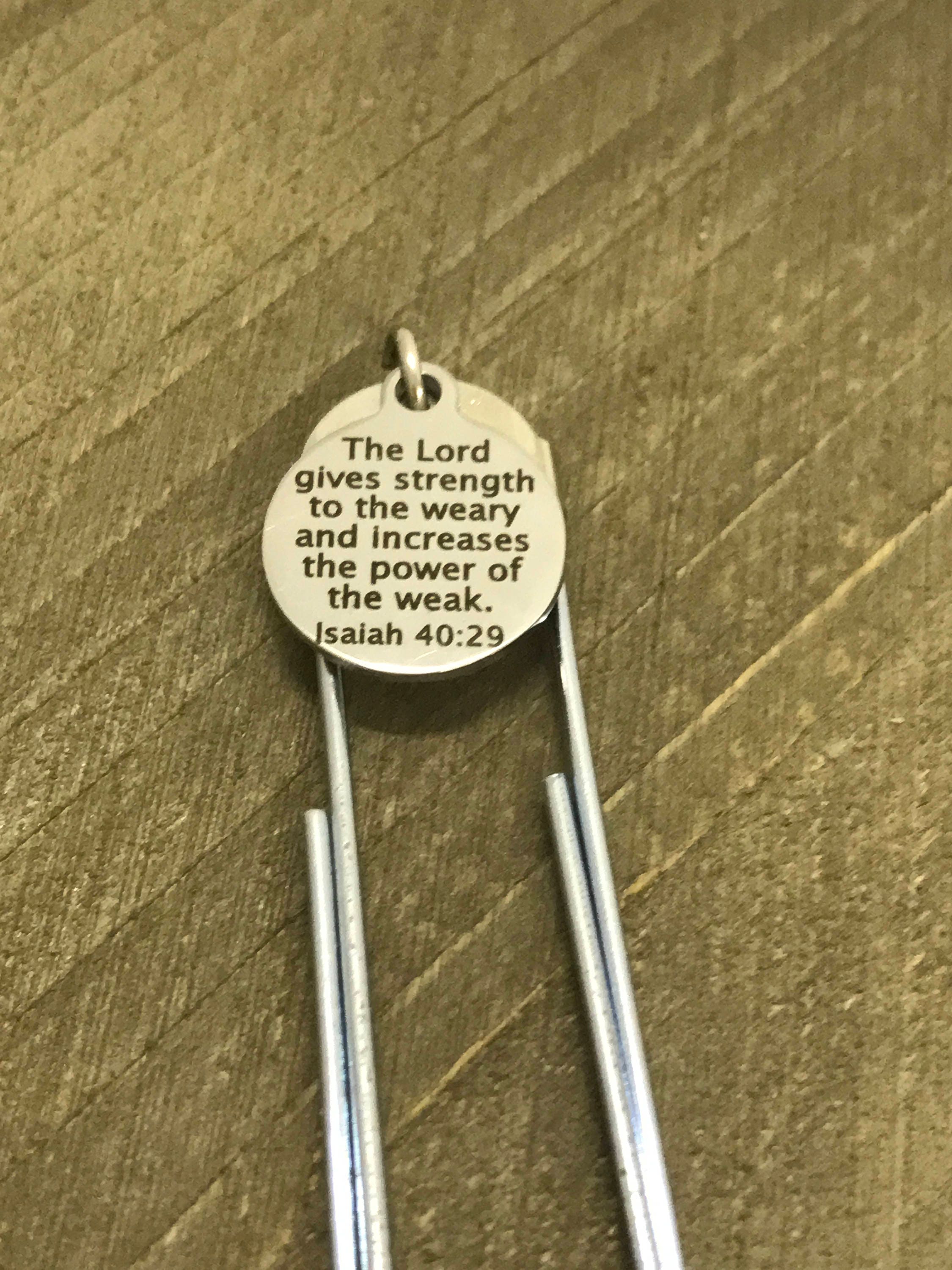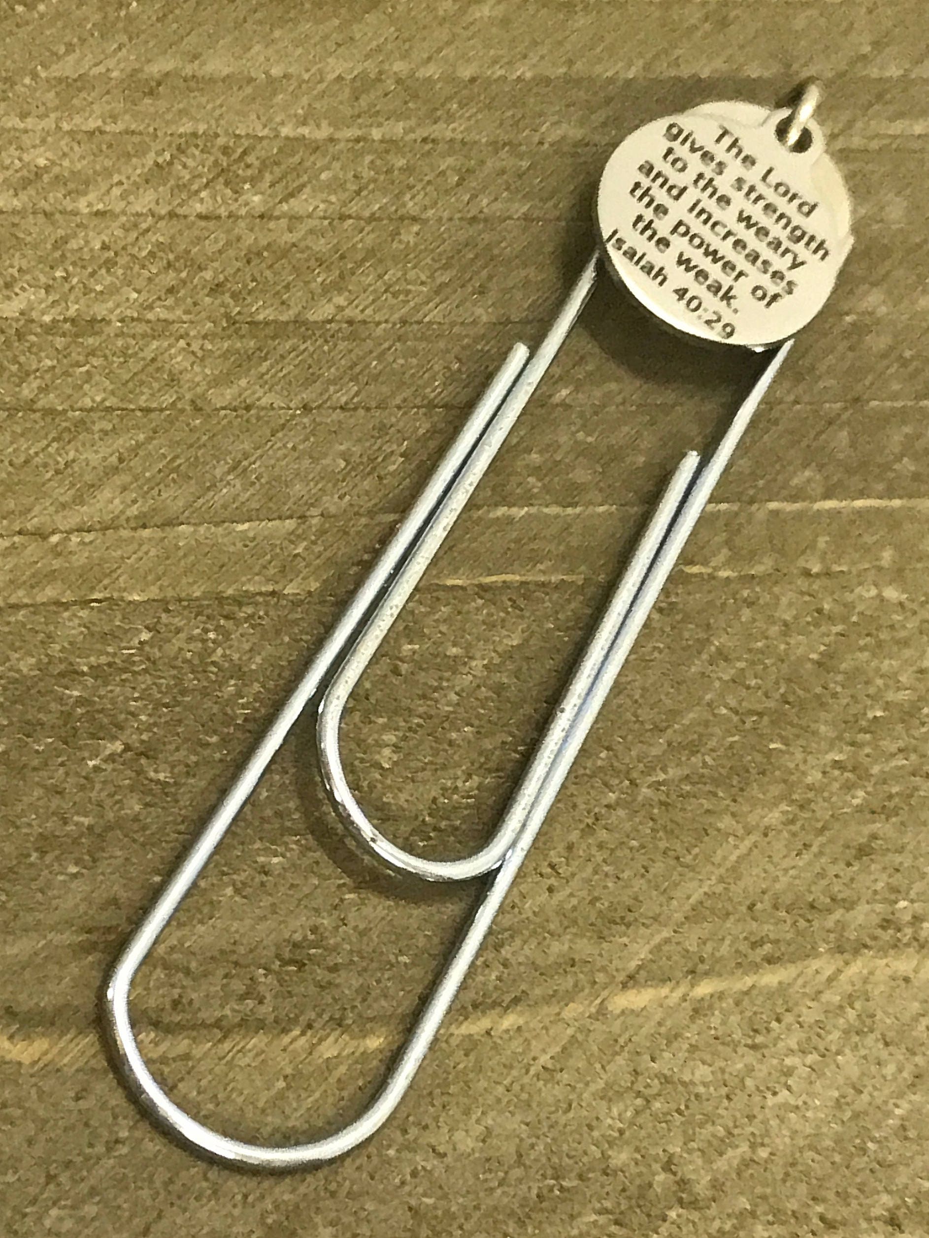 This is a great Christian encouragement bookmark. This paper clip bookmark has a stainless steel laser engraved charm with the Bible verse of Isaiah 40:29 “The Lord gives strength to the weary and increases the power of the weak” on it. It can be used as a bookmark, page marker, or planner book mark.