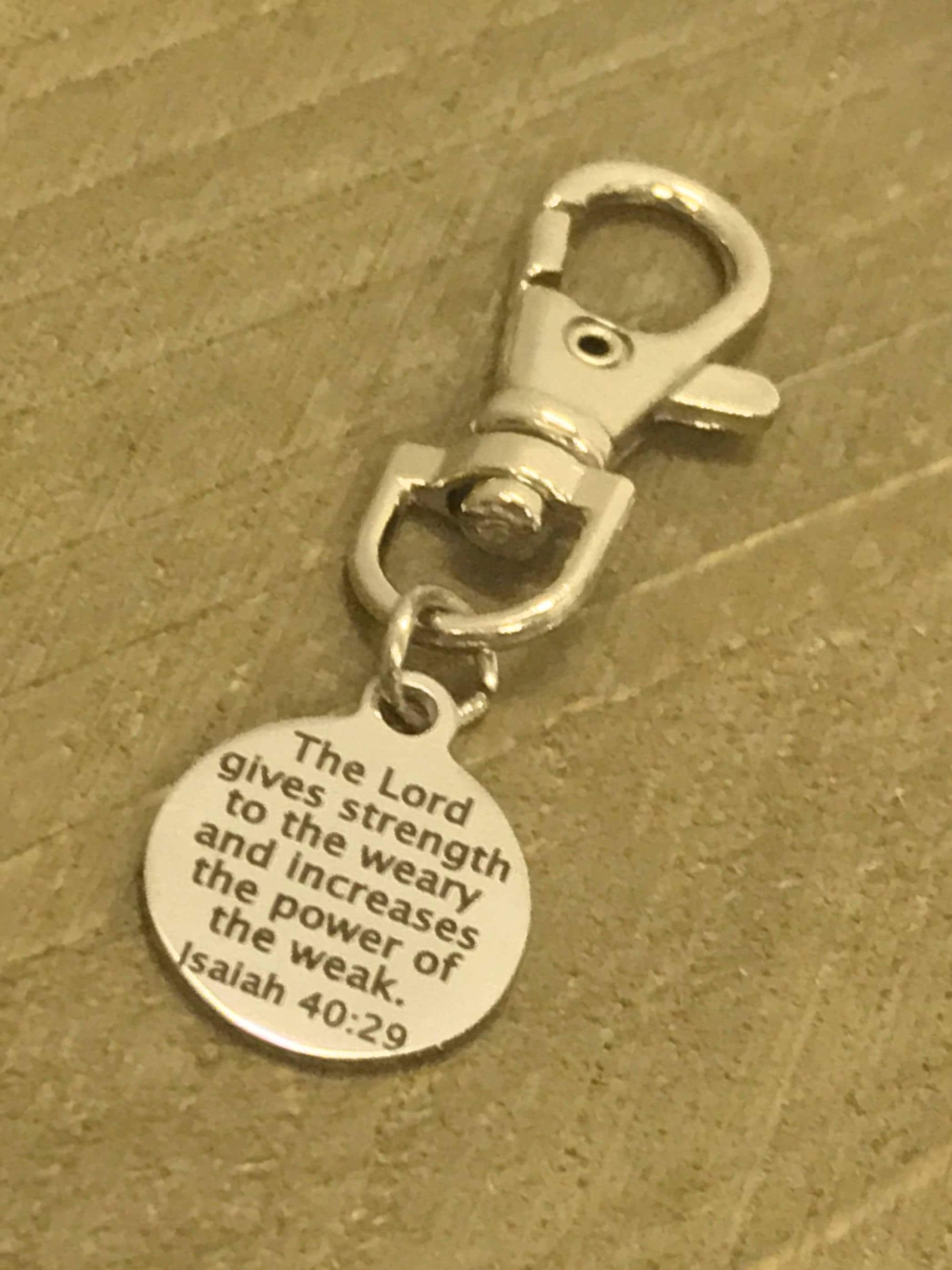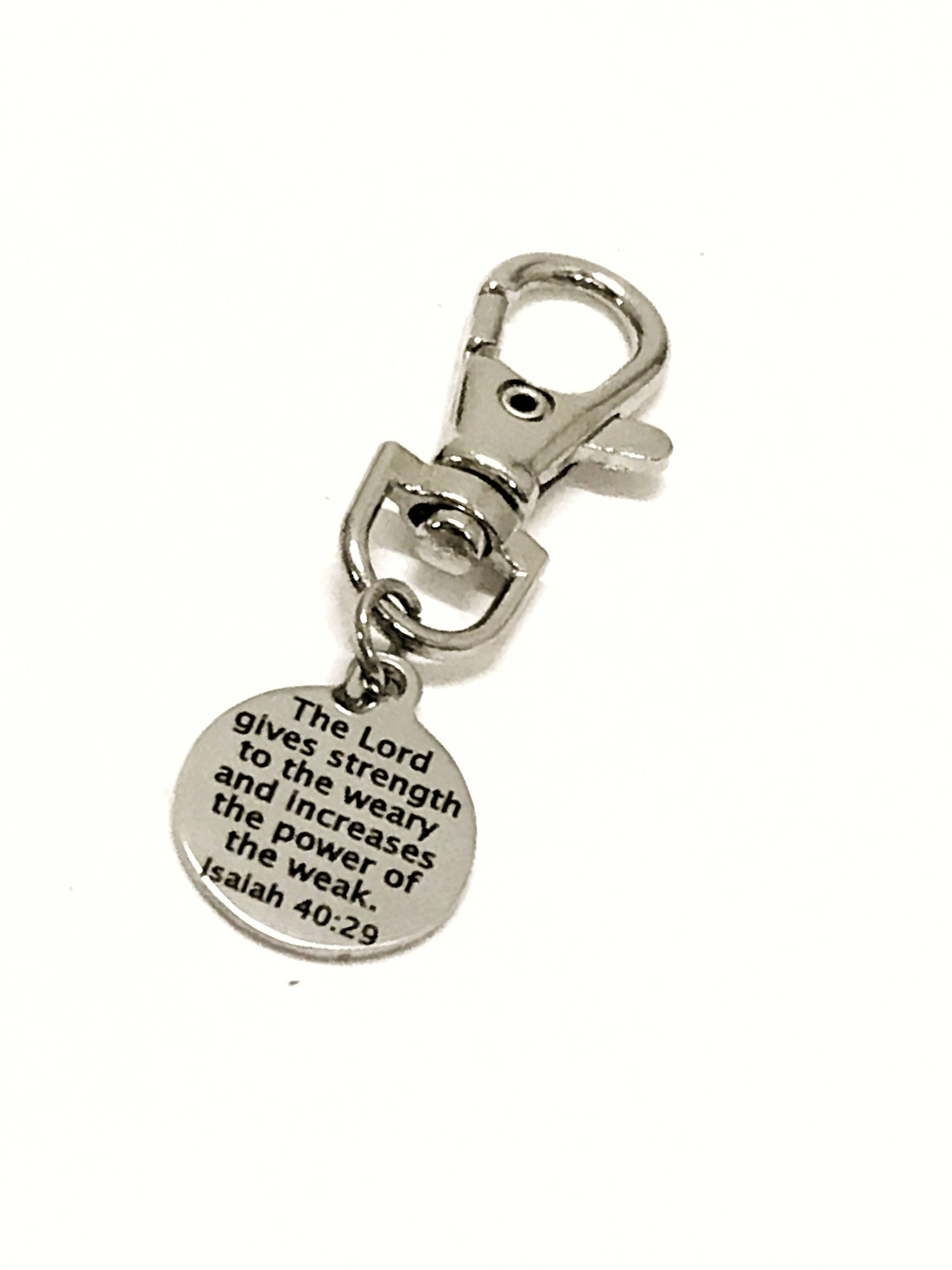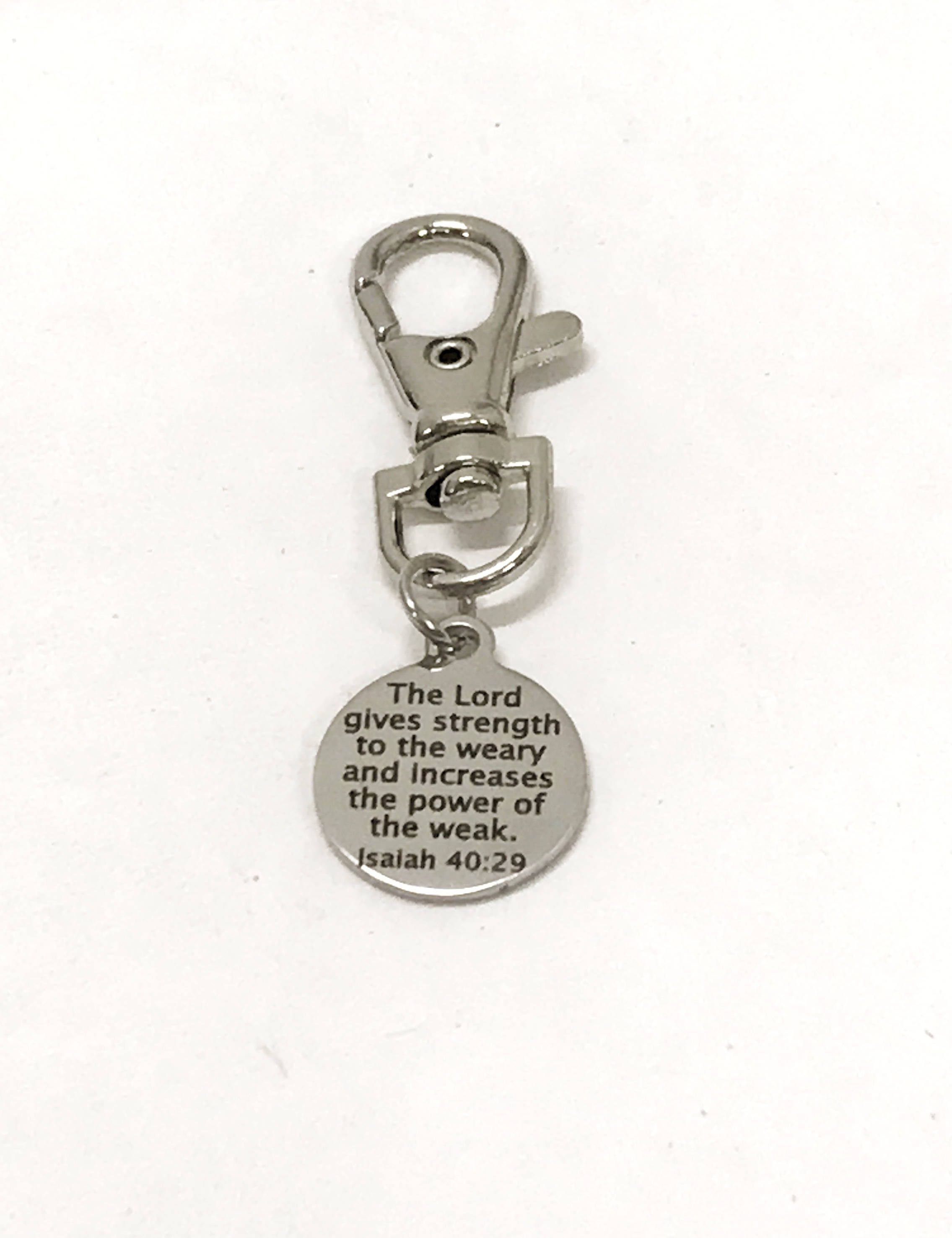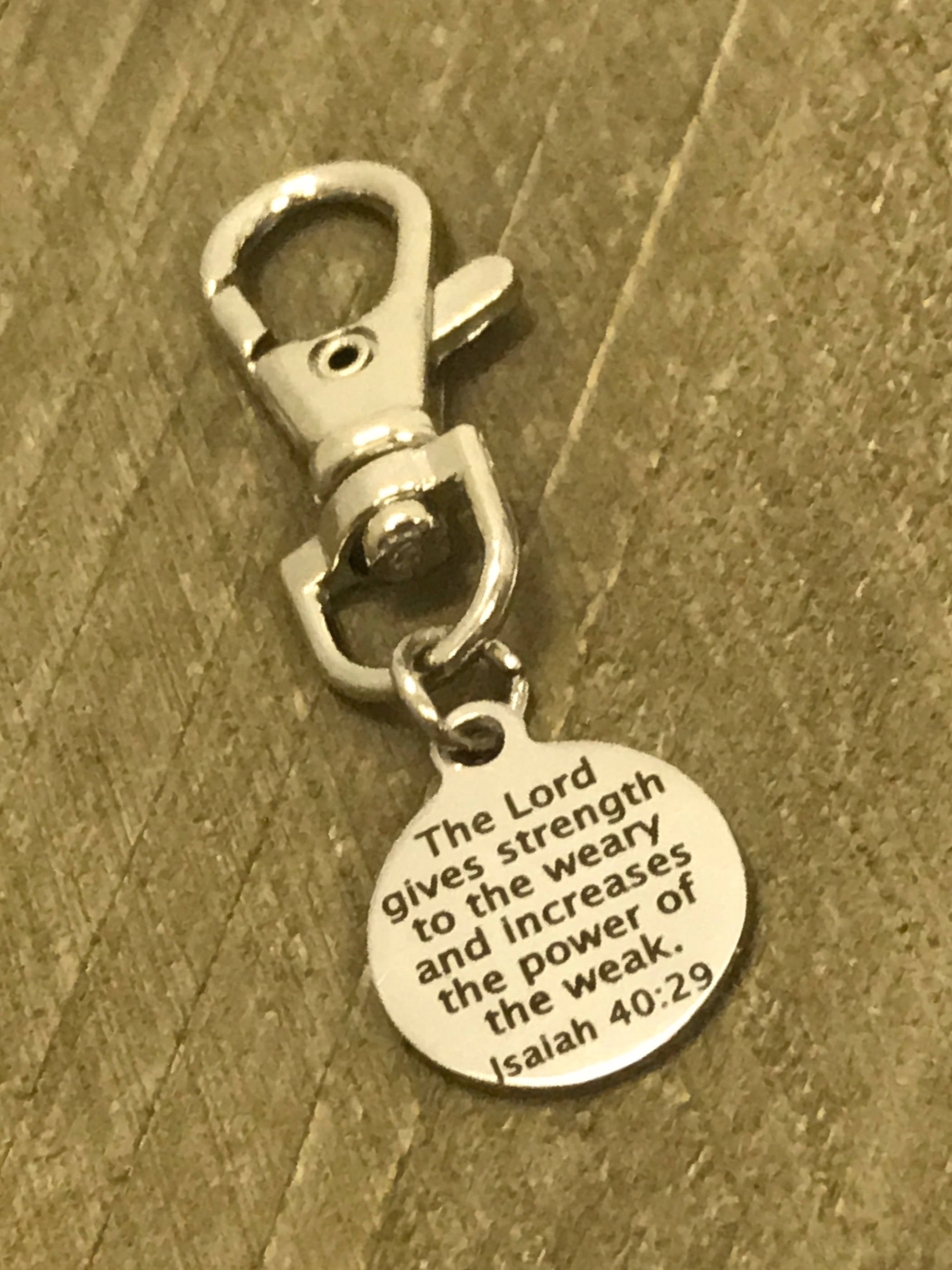 This is a zipper pull which includes a stainless steel laser engraved charm with the Bible verse of Isaiah 40:29 on it.