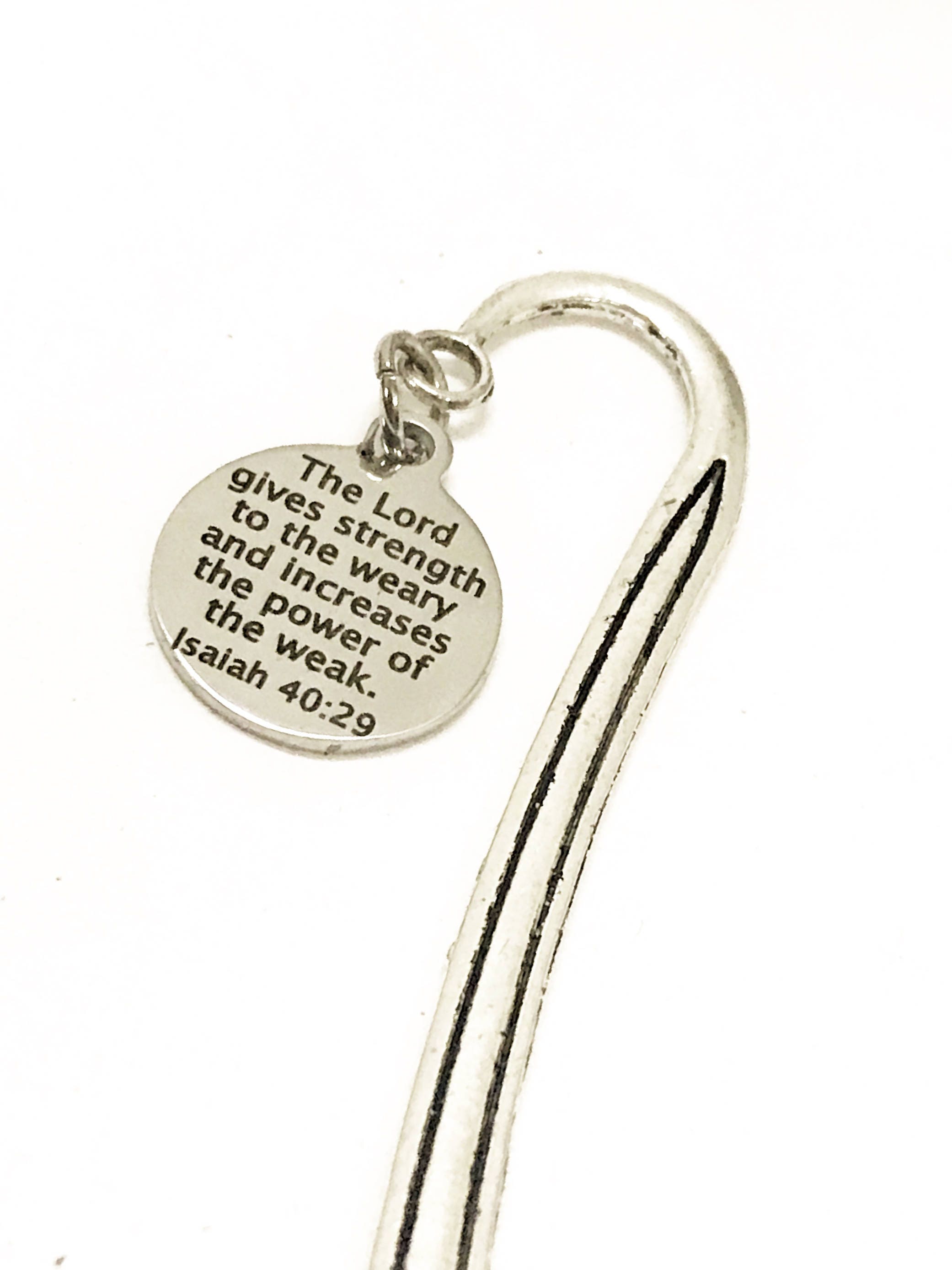 This bookmark would make a great Christian reader gift, Bible bookmark or planner bookmark. It has a charm that has a stainless steel laser engraved charm with the Bible Verse of Isaiah 40:29 on it.