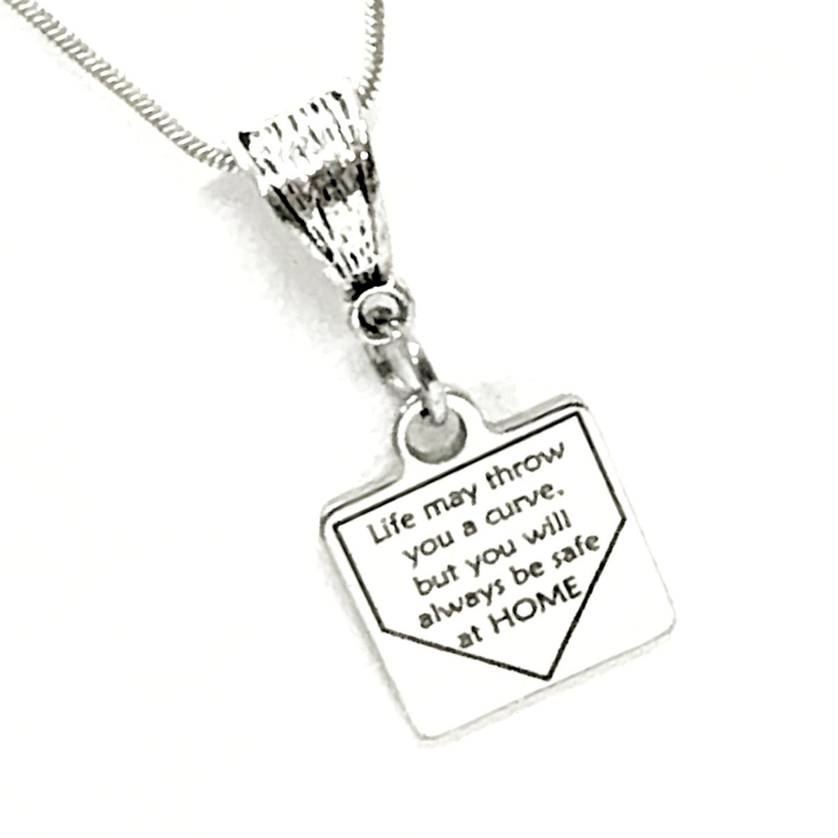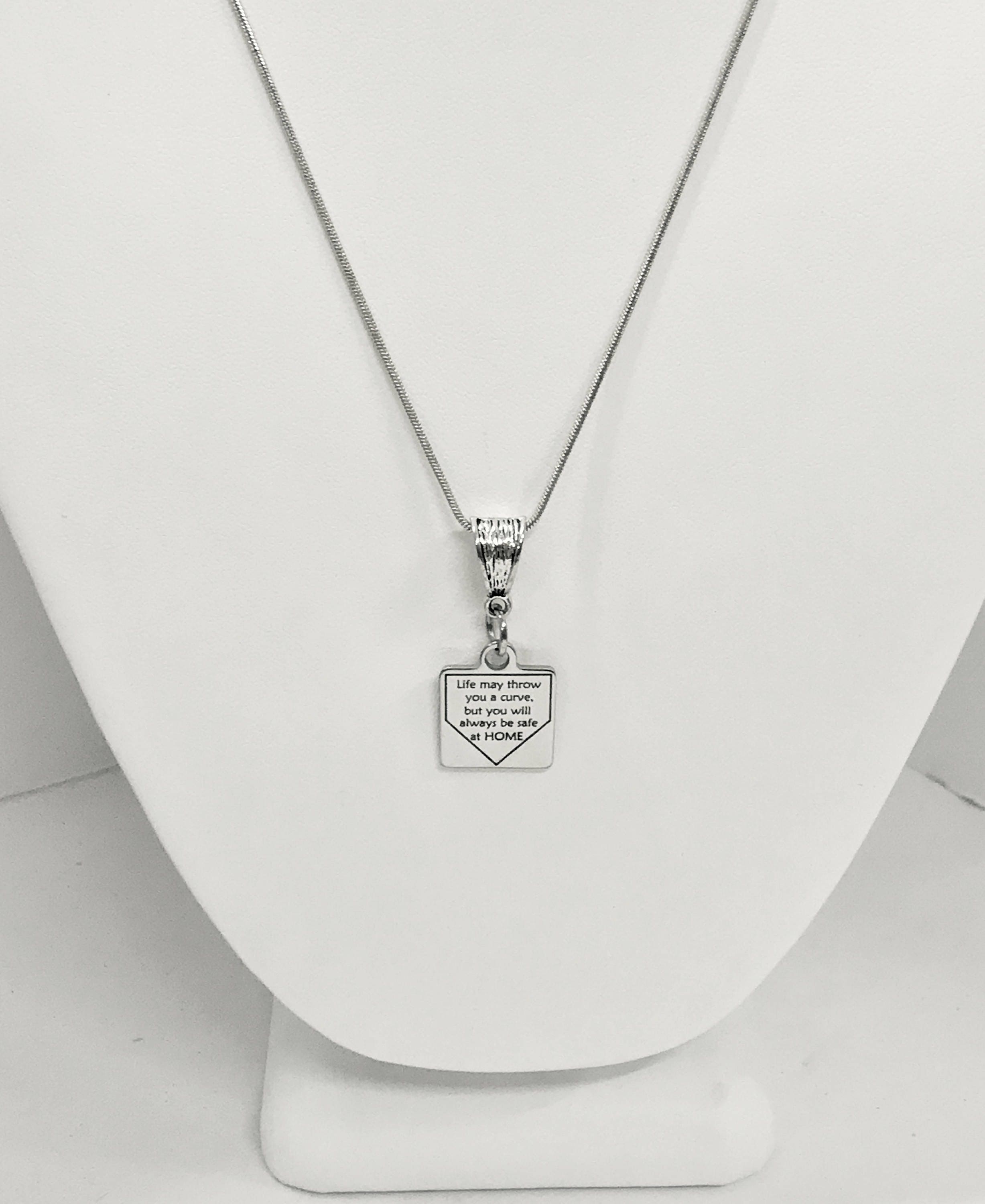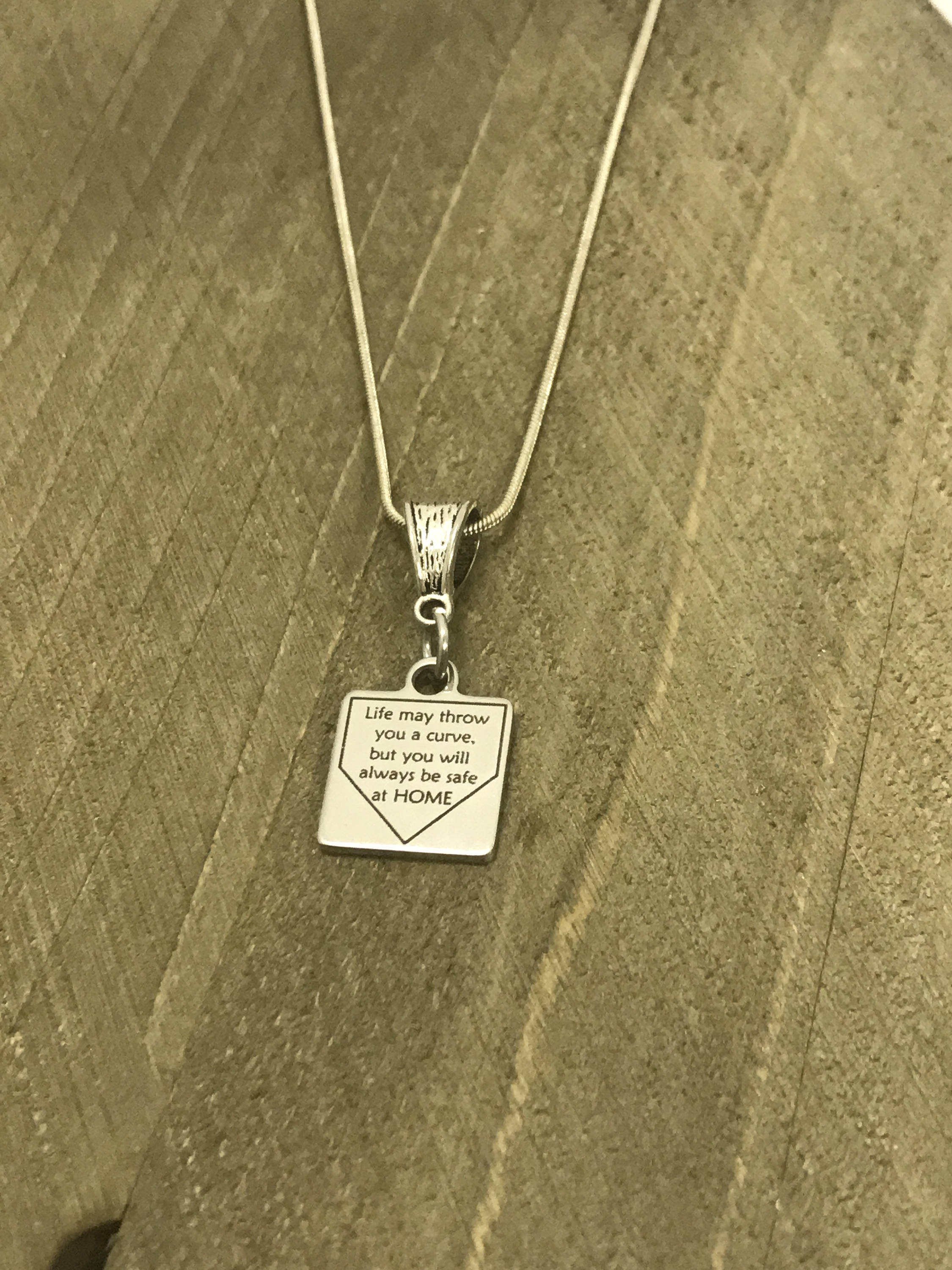 This is a beautiful necklace for your favorite softball player. It has a stainless steel laser engraved charm with "Life may throw you a curve, but you will always be safe at HOME" on it.