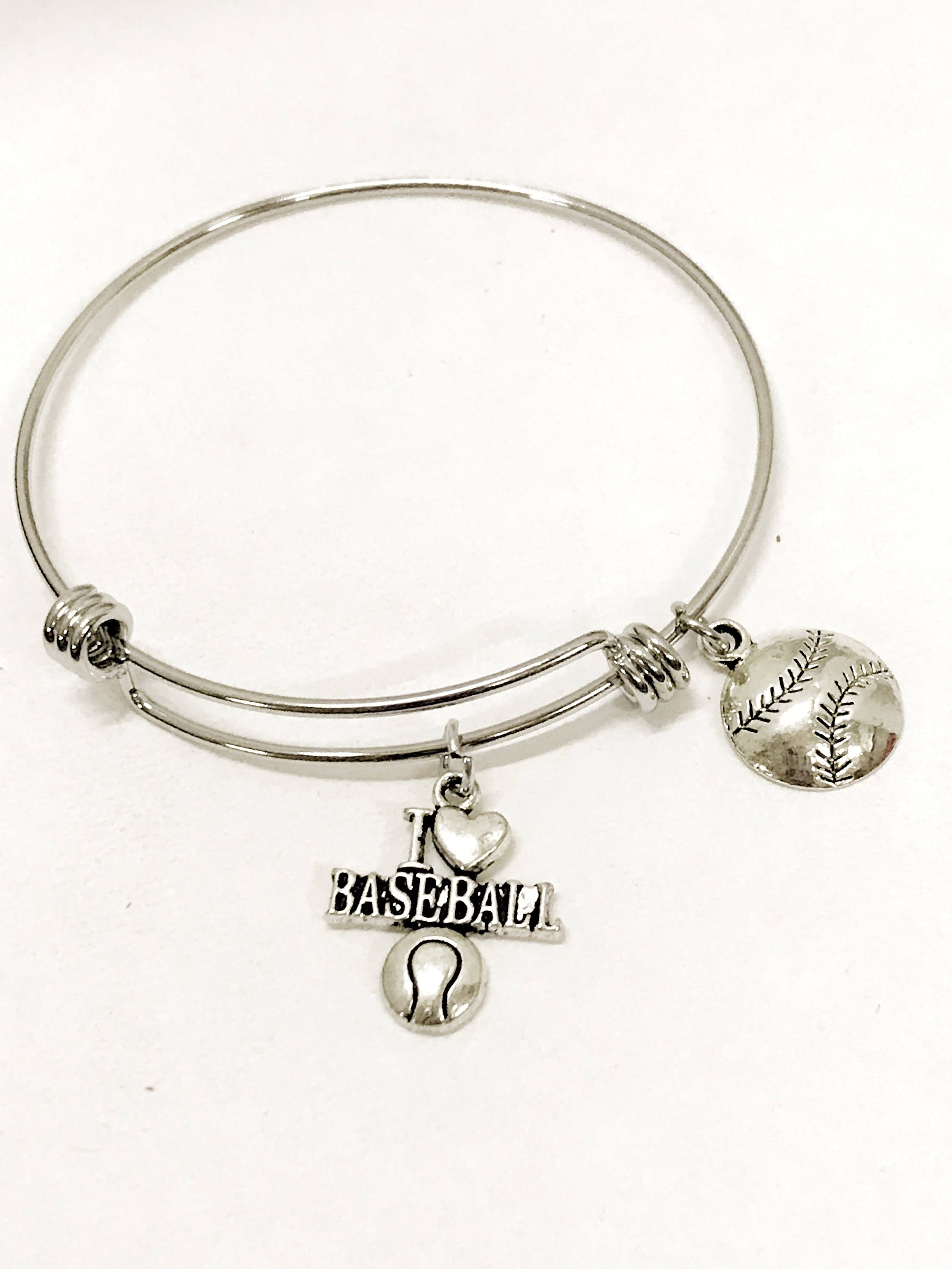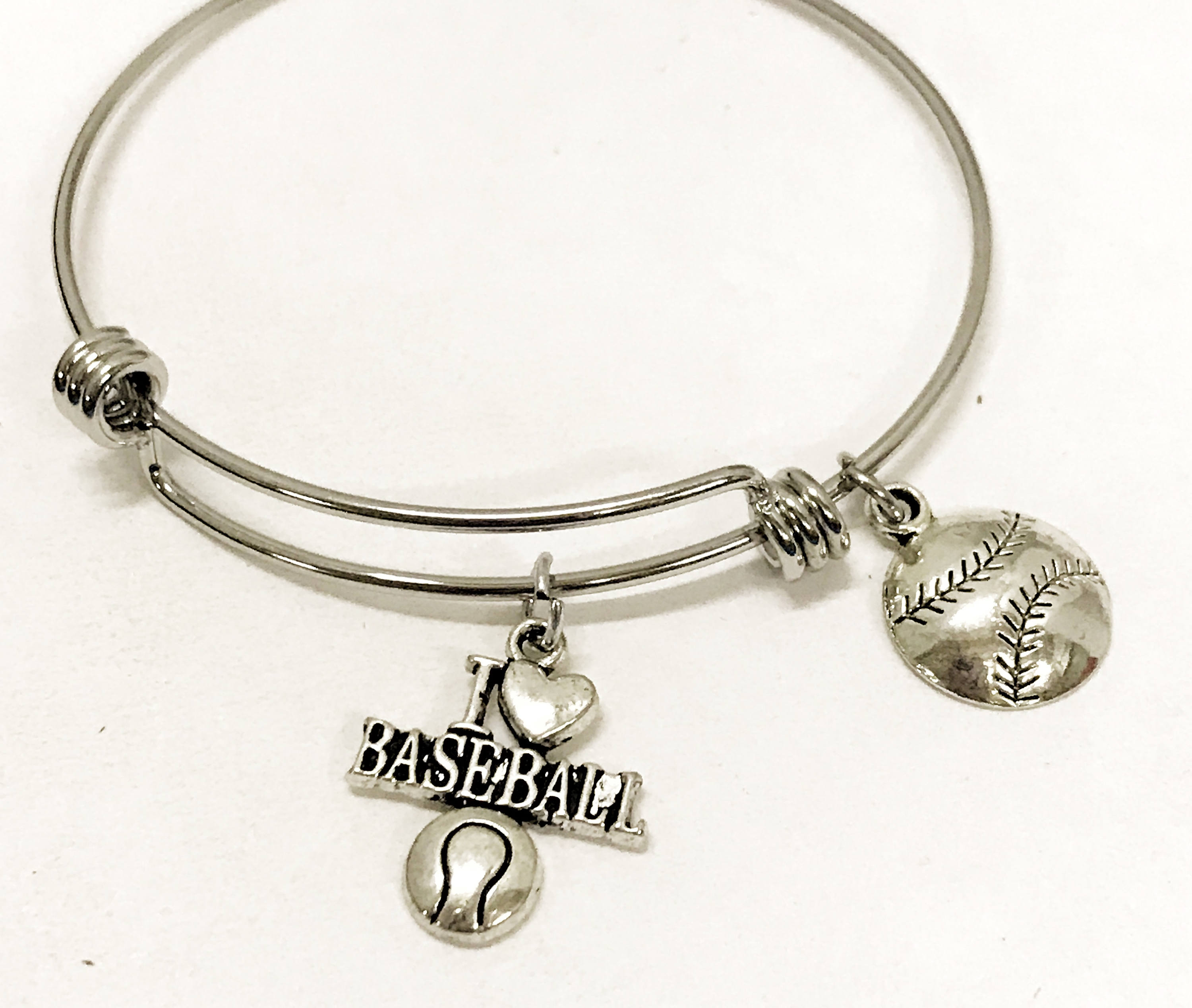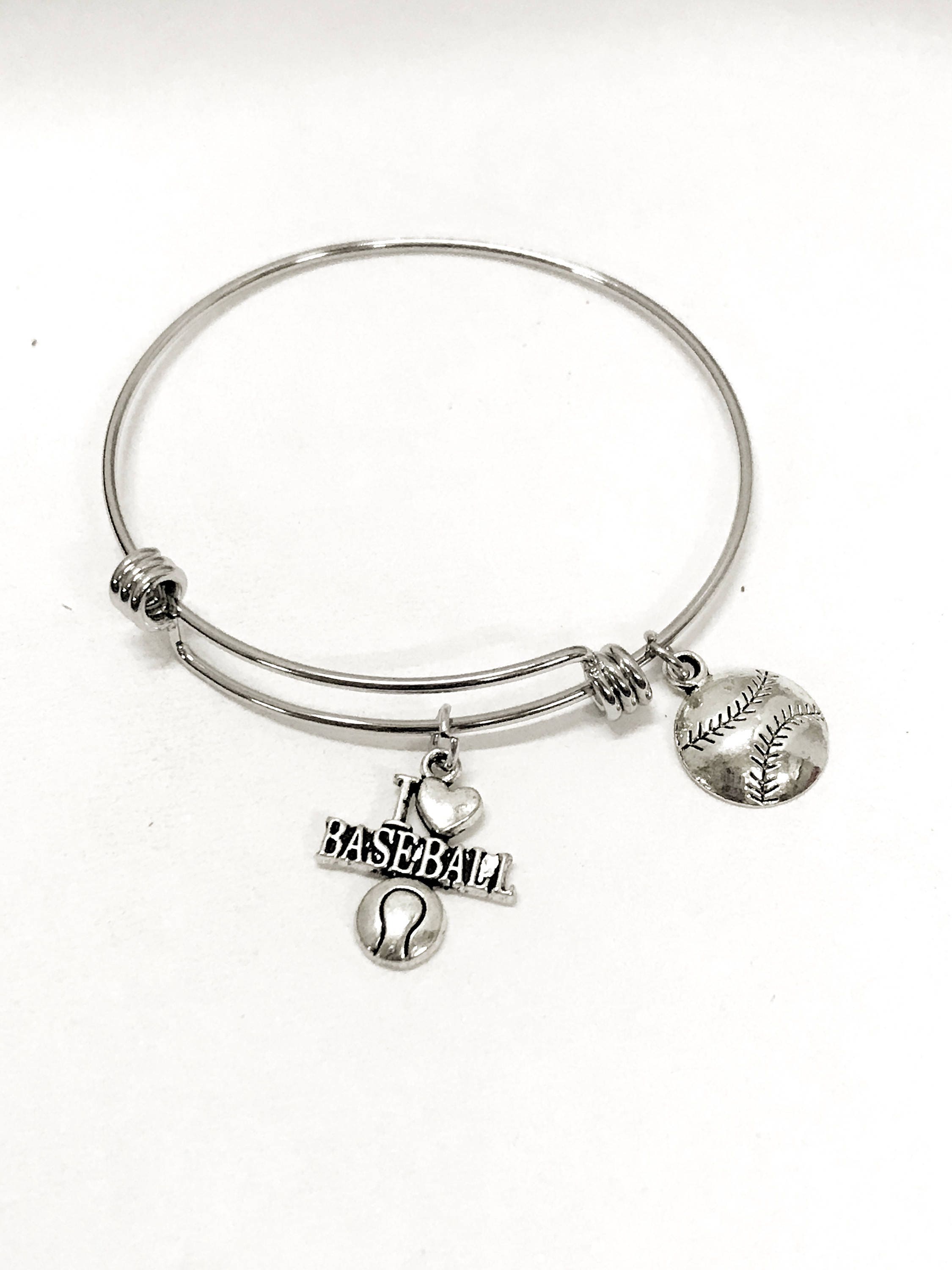 These bangles can be stacked to show your love for various items in your life. It can also be worn individually for a minimalist look. This stainless steel bracelet has a silvertone charms to express your love for baseball on it. It would be a great gift to give the baseball fan in your life.