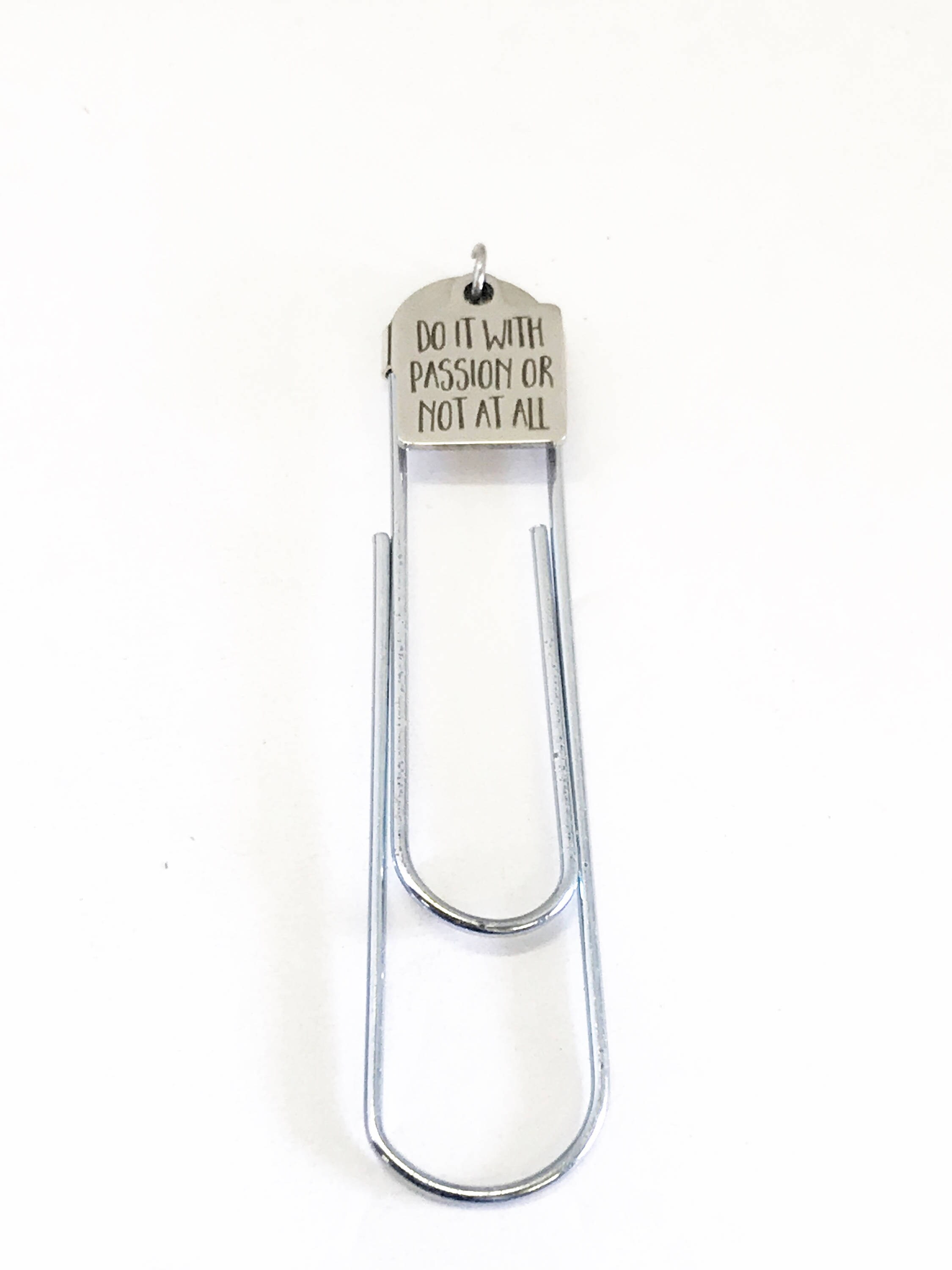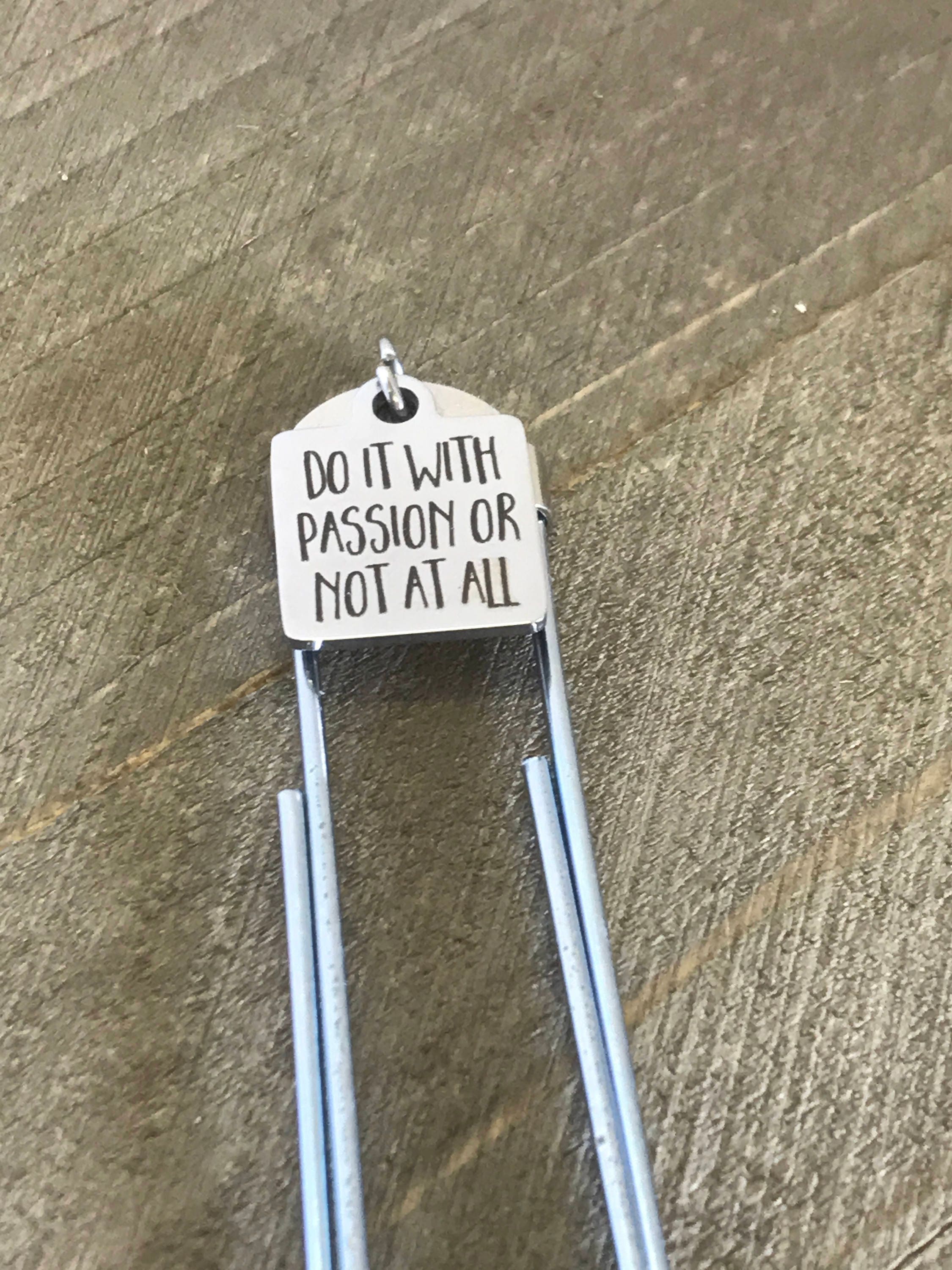 This is a great encouragement bookmark. This paper clip bookmark has a stainless steel laser engraved charm with "Do it with passion or not at all" on it. It can be used as a bookmark, page marker, or planner book mark.