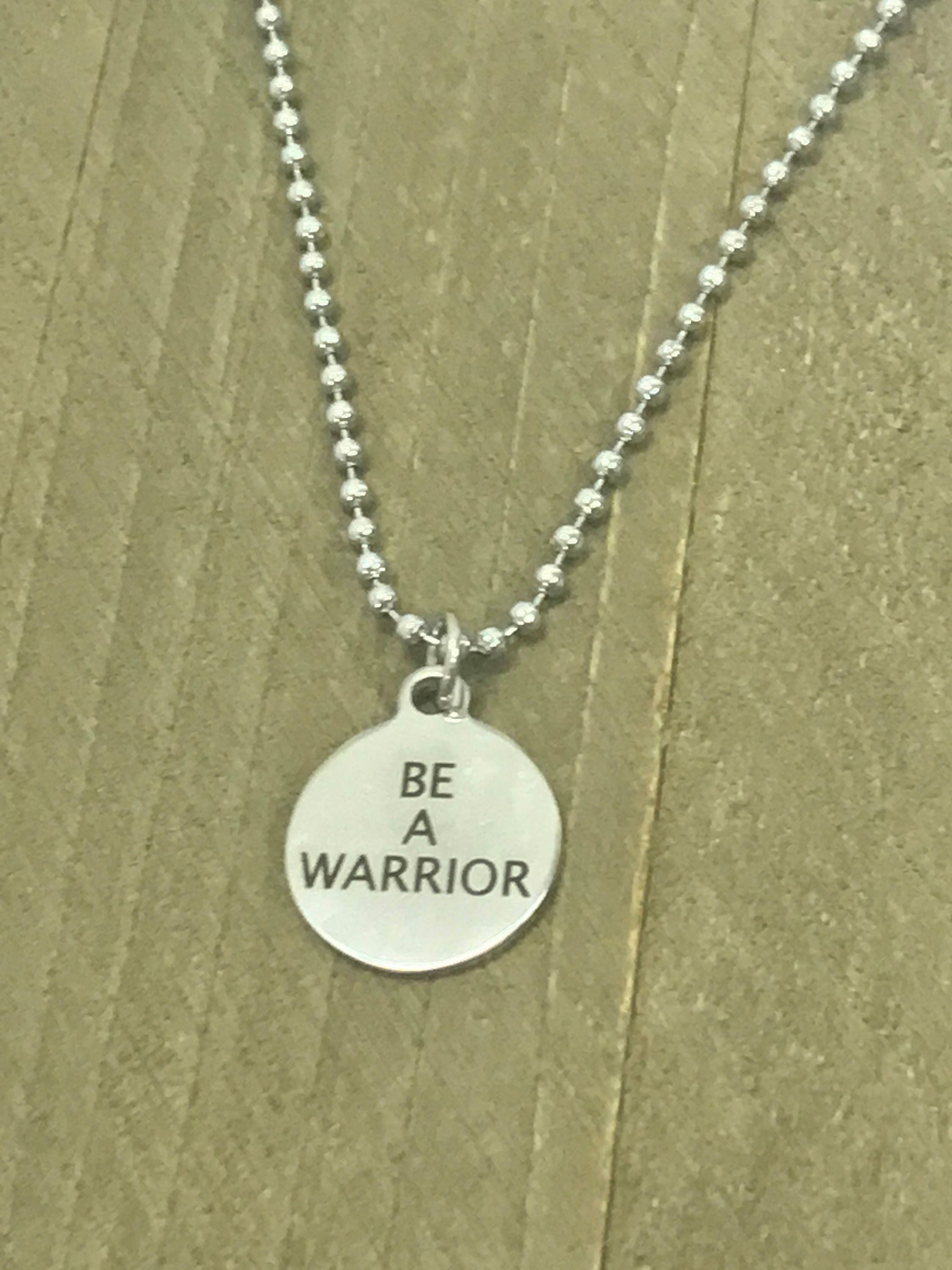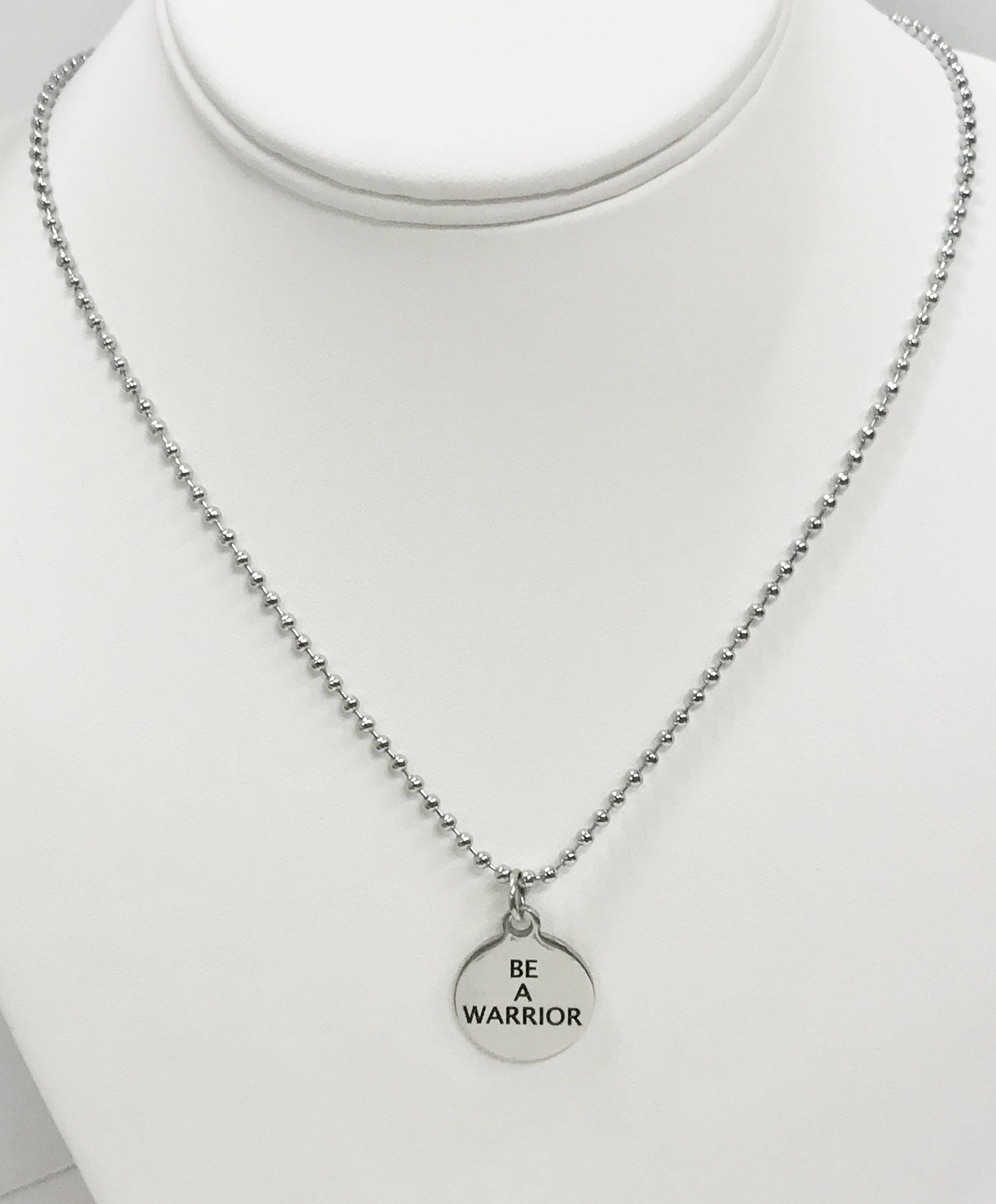 The pendant is a laser engraved charm on a 24 inch stainless steel ball chain. The charm has "Be A Warrior" on it.