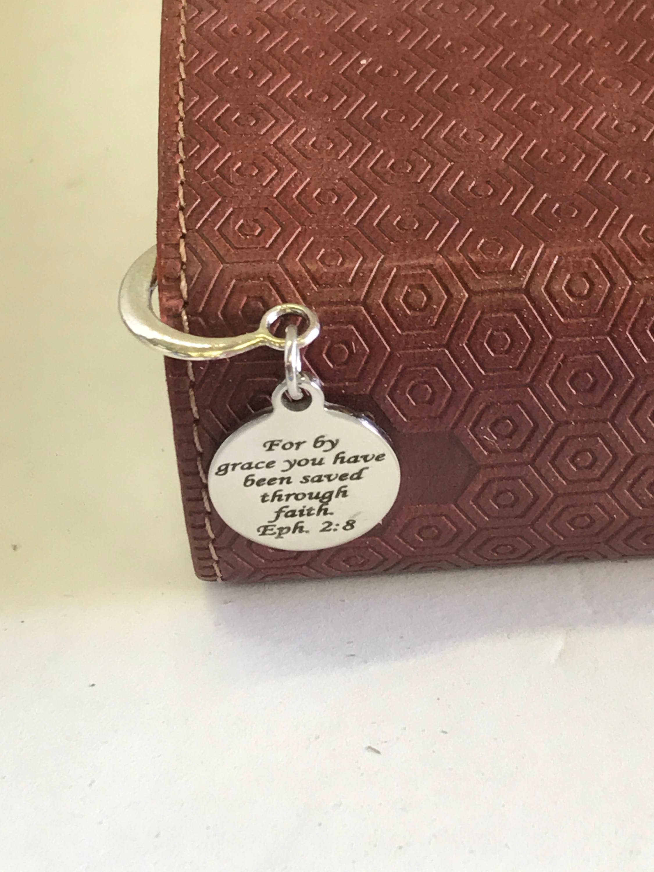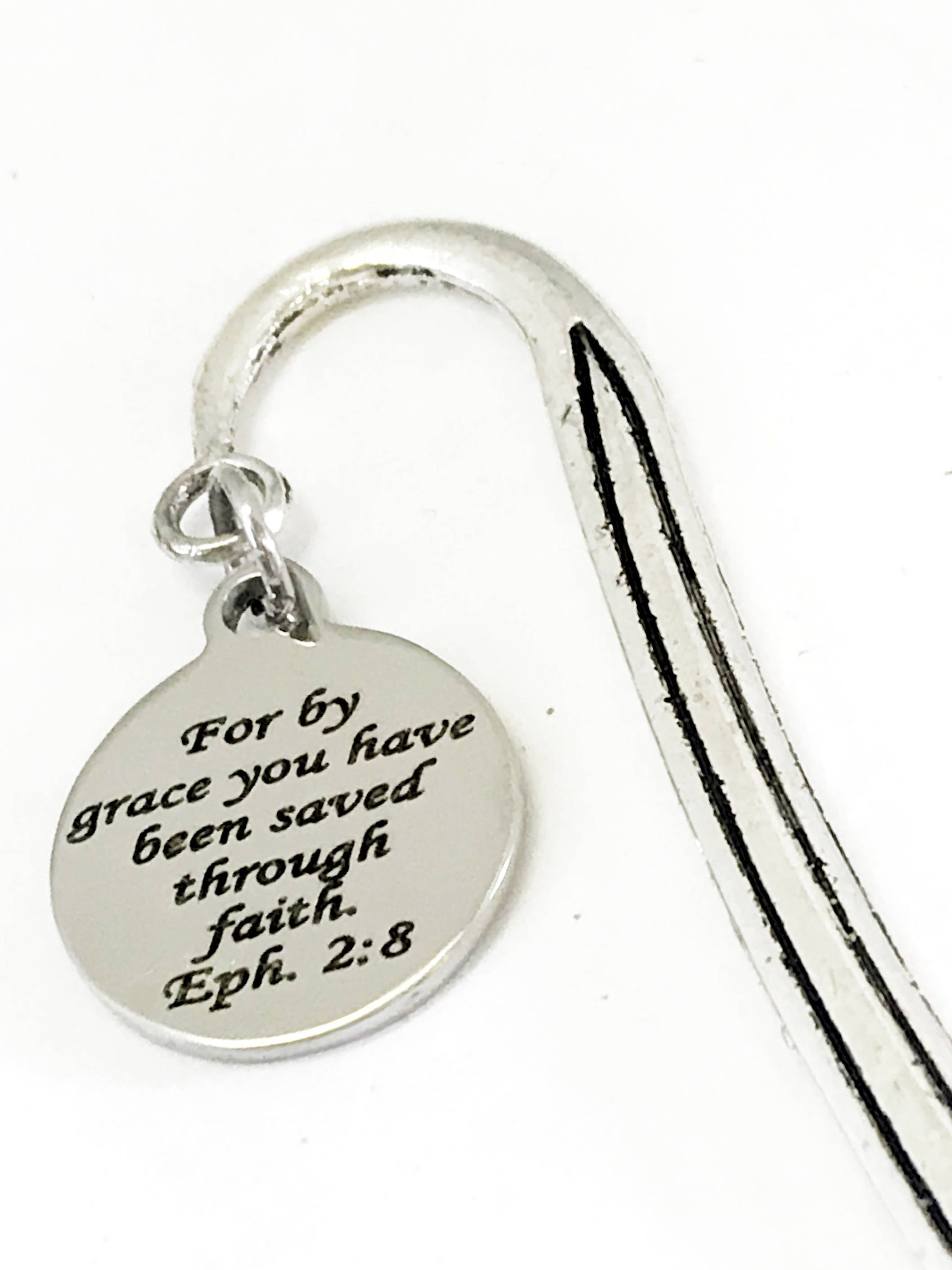 This religious gift bookmark would make a great student athlete gift, reader gift, Bible bookmark or planner bookmark. It has a charm that has a stainless steel laser engraved charm with "For by grace you have been saved through faith" from Ephesians 2:8 on it.