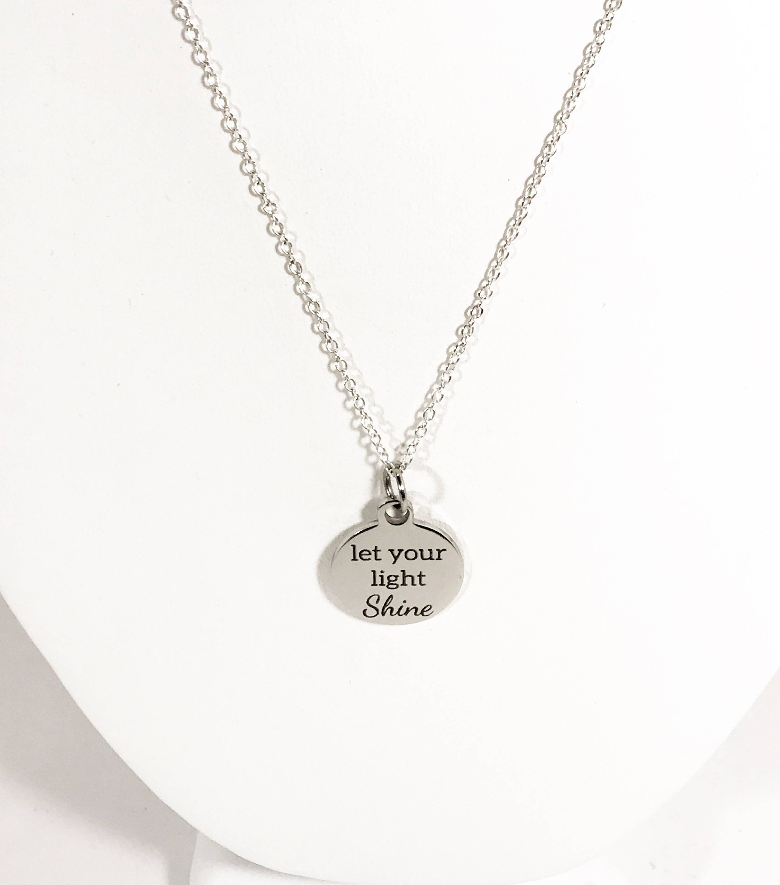 This silver necklace is a simple but beautiful encouragement gift. The stainless steel laser engraved pendant has "Let your light shine" on it.