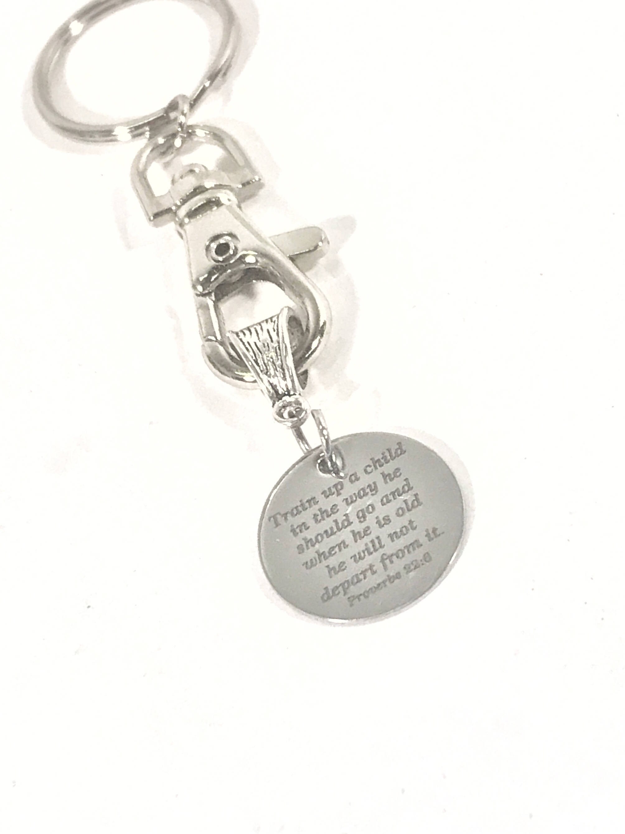 This is a beautiful keychain to serve as a reminder of the Proverbs 22:6 Bible verse to "Train up a child in the way he should go and when he is old he will not depart from it." The charm is a stainless steel laser engraved charm.