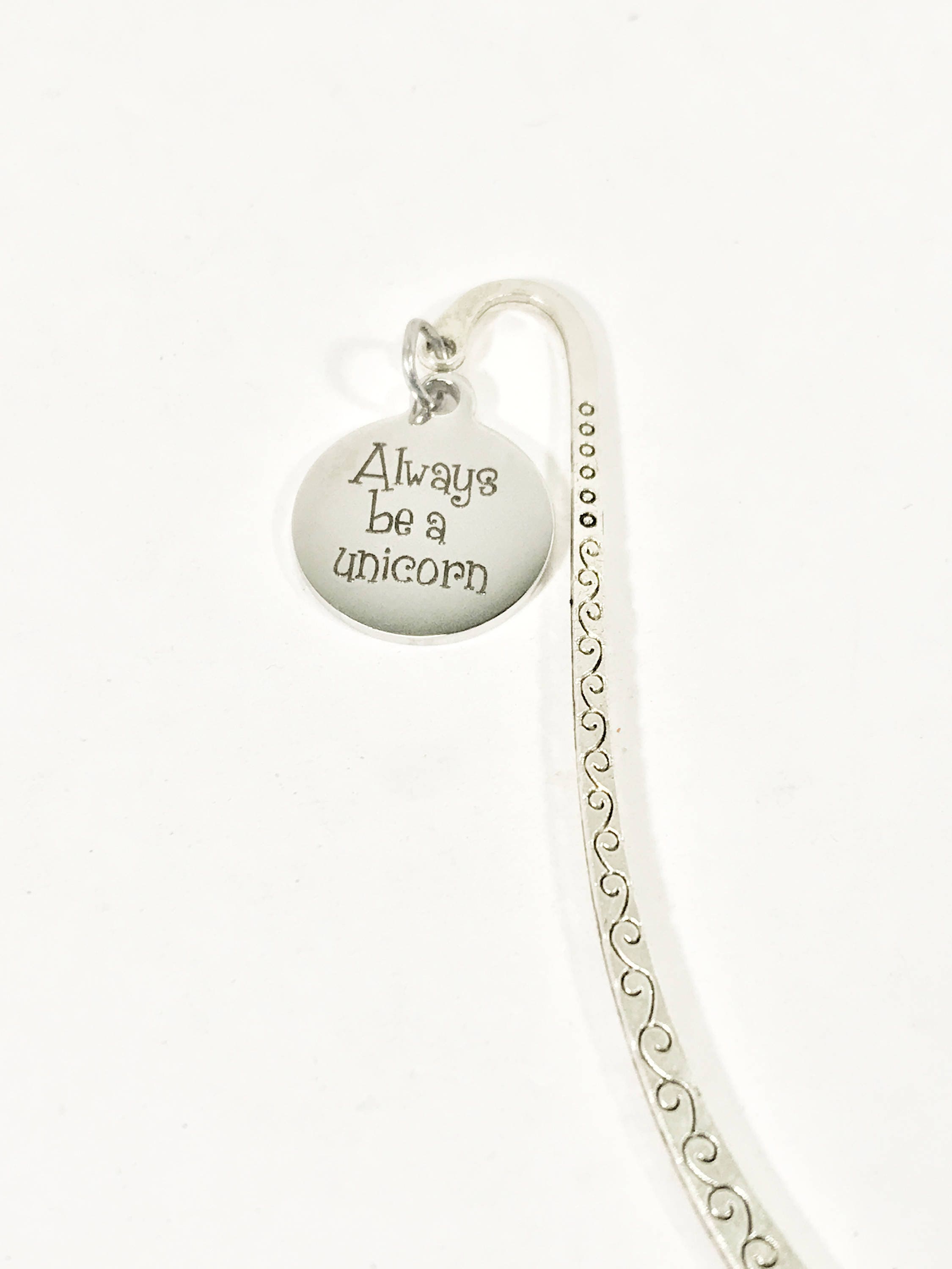 This is a great encouraging reader gift. It is a bookmark with a stainless steel laser engraved charm that has "Always Be.A Unicorn" on it. The bookmark measures approx. 3.3 Inches in length and would be a great bookmark for smaller paperbacks or smaller, compact bibles.