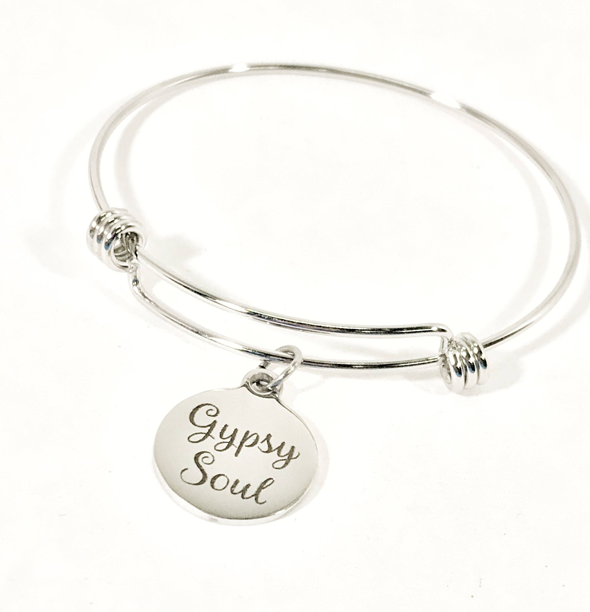 This is a fun bracelet with a stainless steel laser engraved charm on it. The charm has "Gypsy Soul" on it.