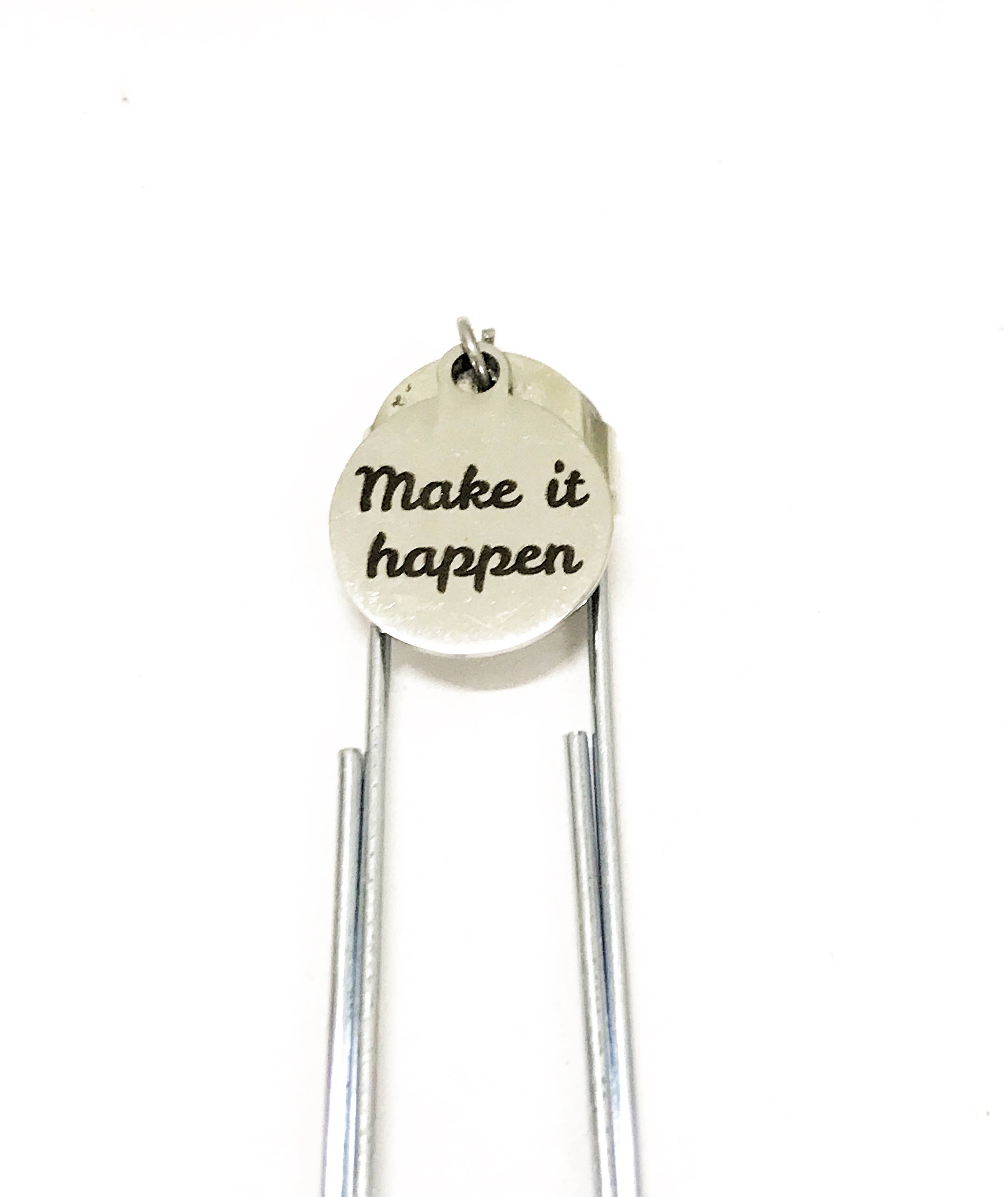 This is a great large paper clip style bookmark that has a stainless steel laser engraved charm with "Make It Happen" on it. It can be used as a bookmark, page marker, or planner book mark.
