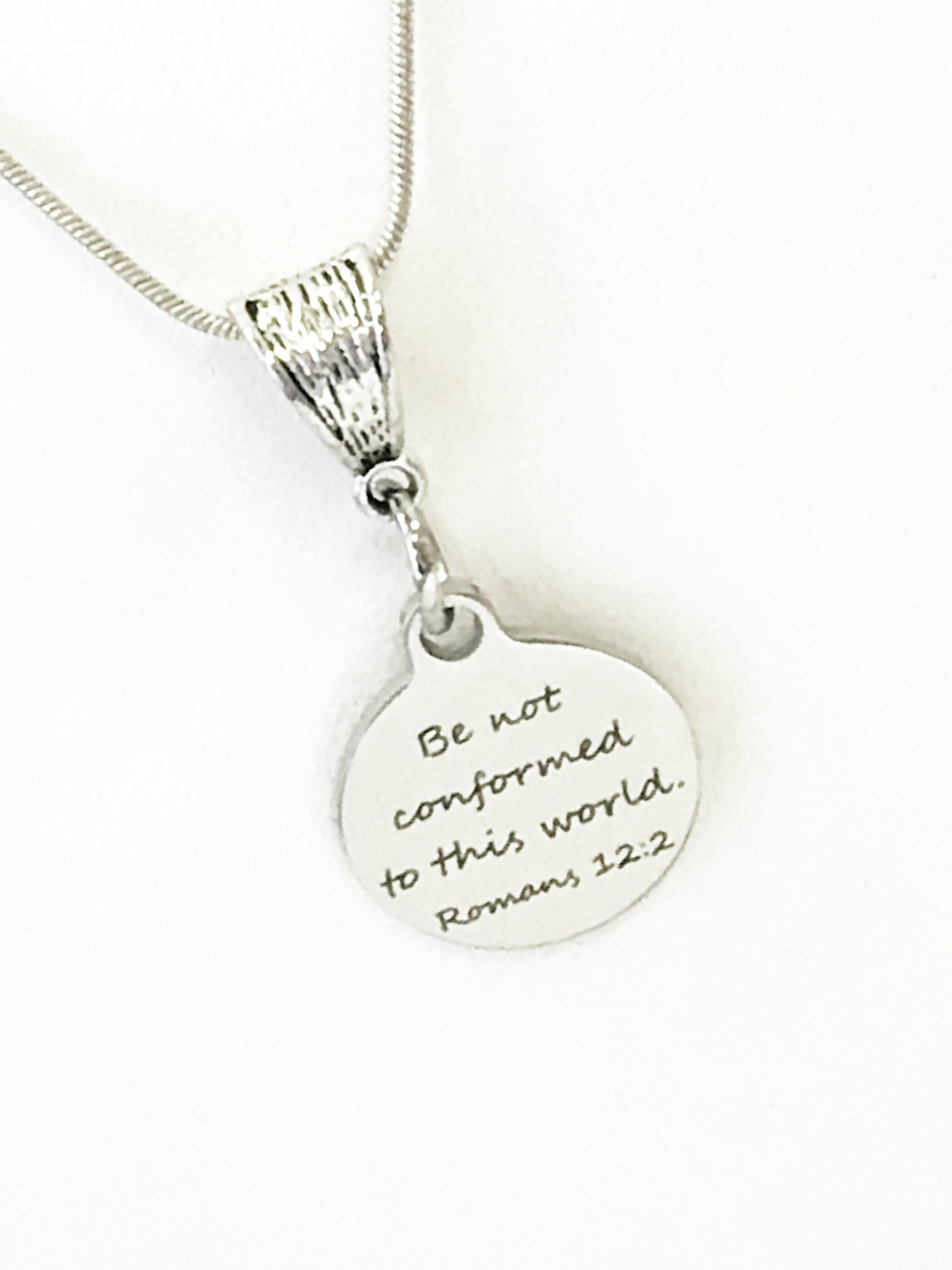 This is a beautiful Christian necklace jewelry gift. It has a stainless steel laser engraved charm with "Be not conformed to this world" from Romans 12:2 on it.
