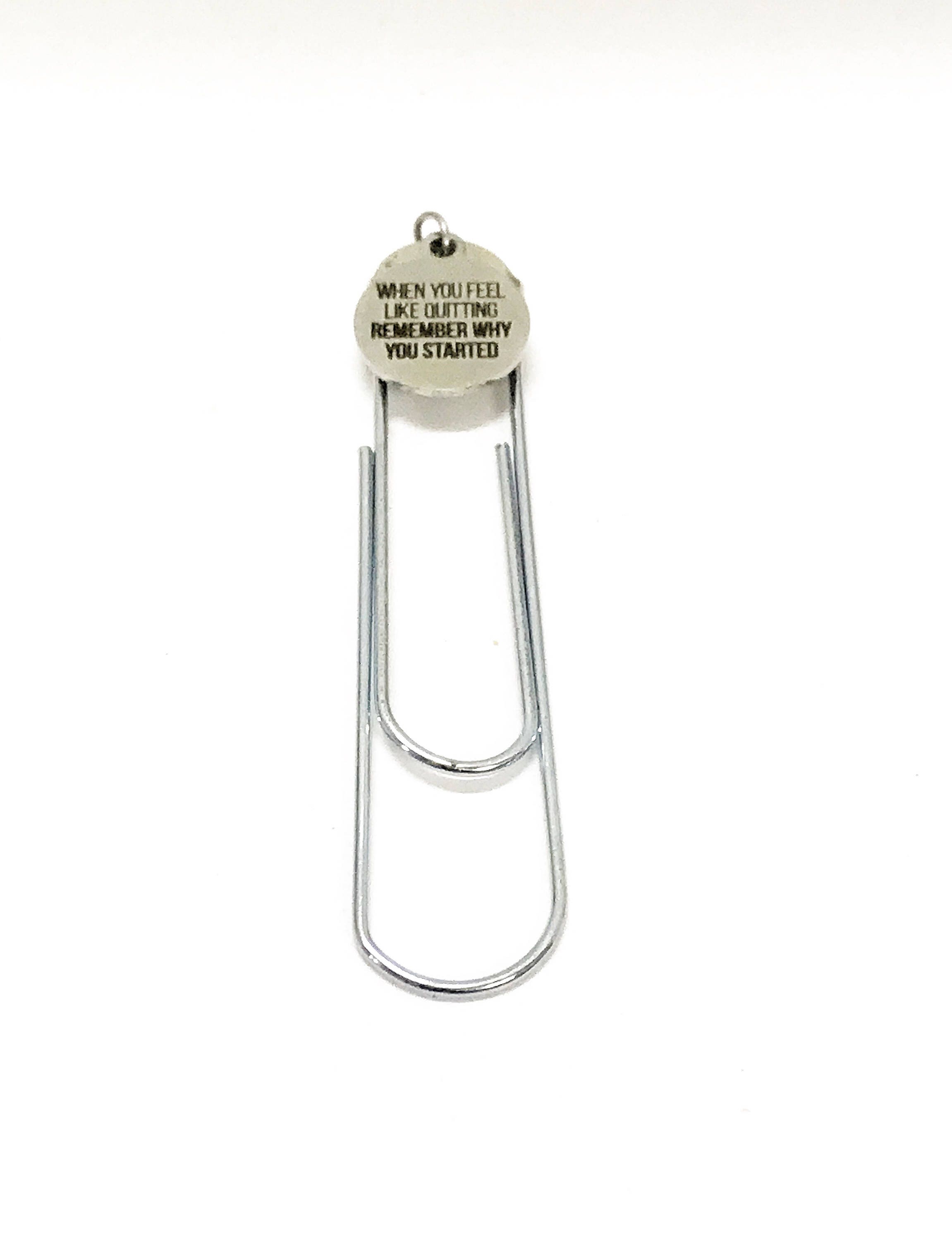 This is a great large paper clip style bookmark that has a stainless steel laser engraved charm with "When you feel like quitting remember why you started" on it. It can be used as a bookmark, page marker, or planner book mark.
