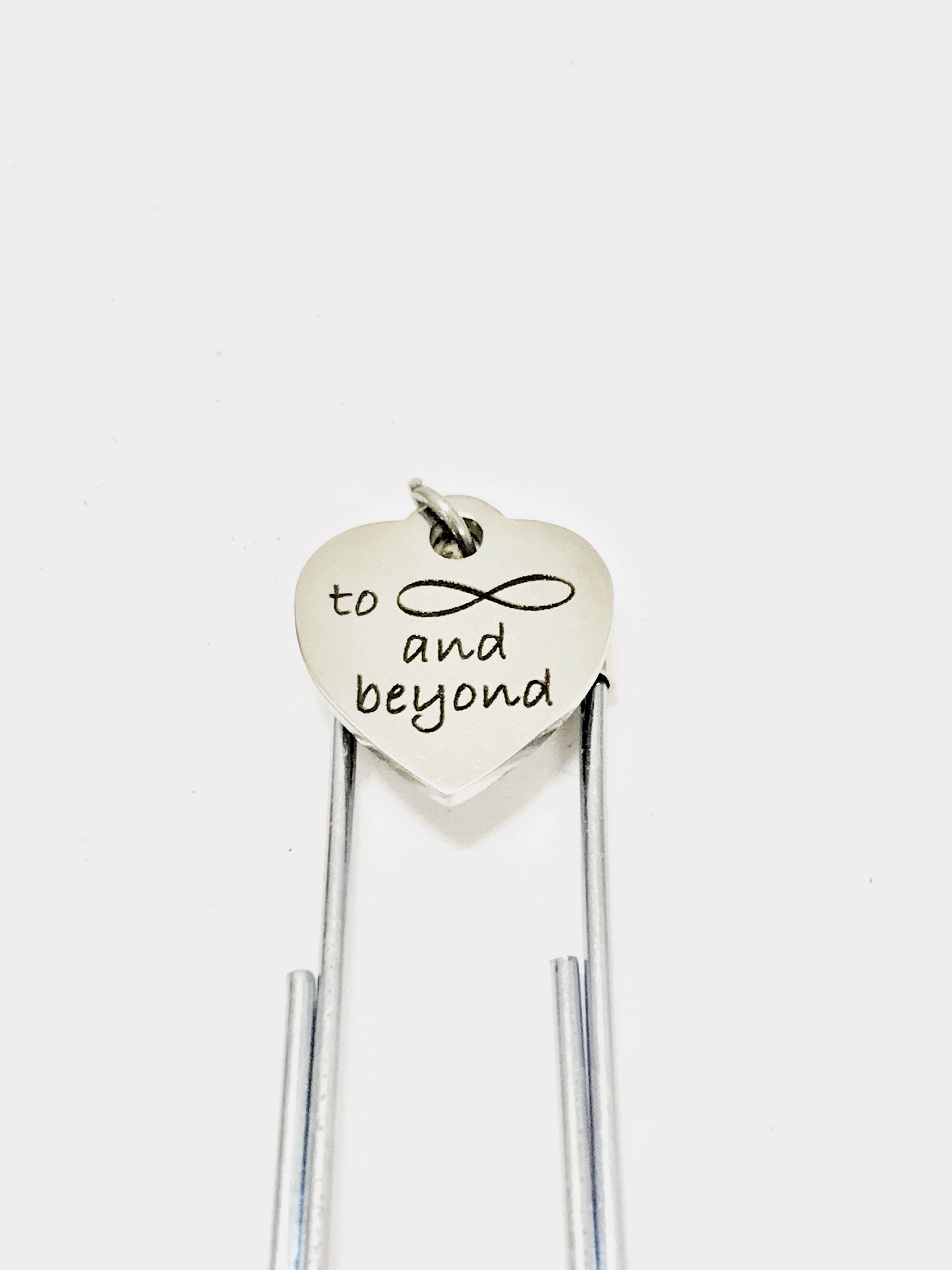 This is a great large paper clip style bookmark that has a stainless steel laser engraved charm with "To infinity and beyond" on it. It can be used as a bookmark, page marker, or planner book mark.