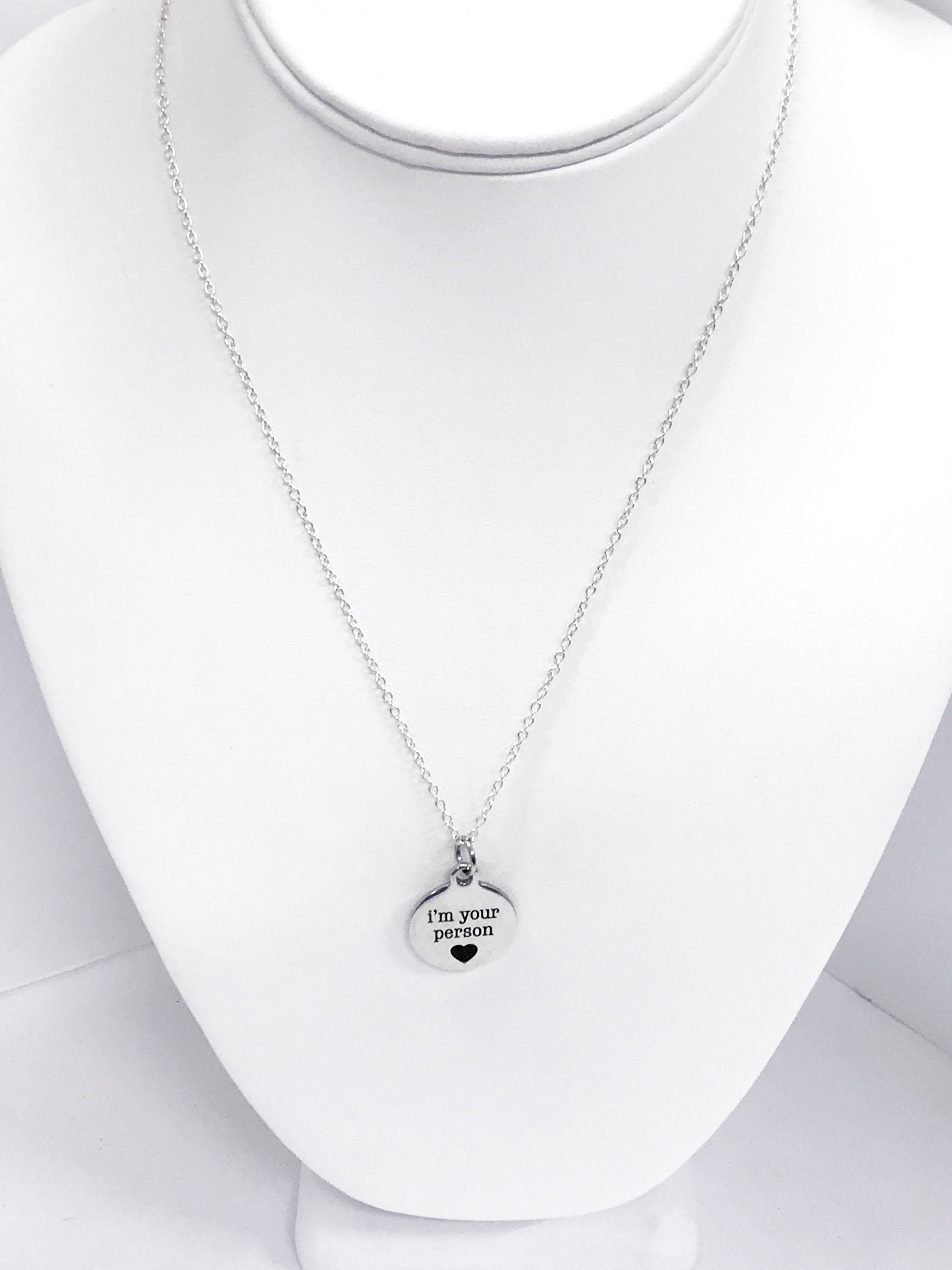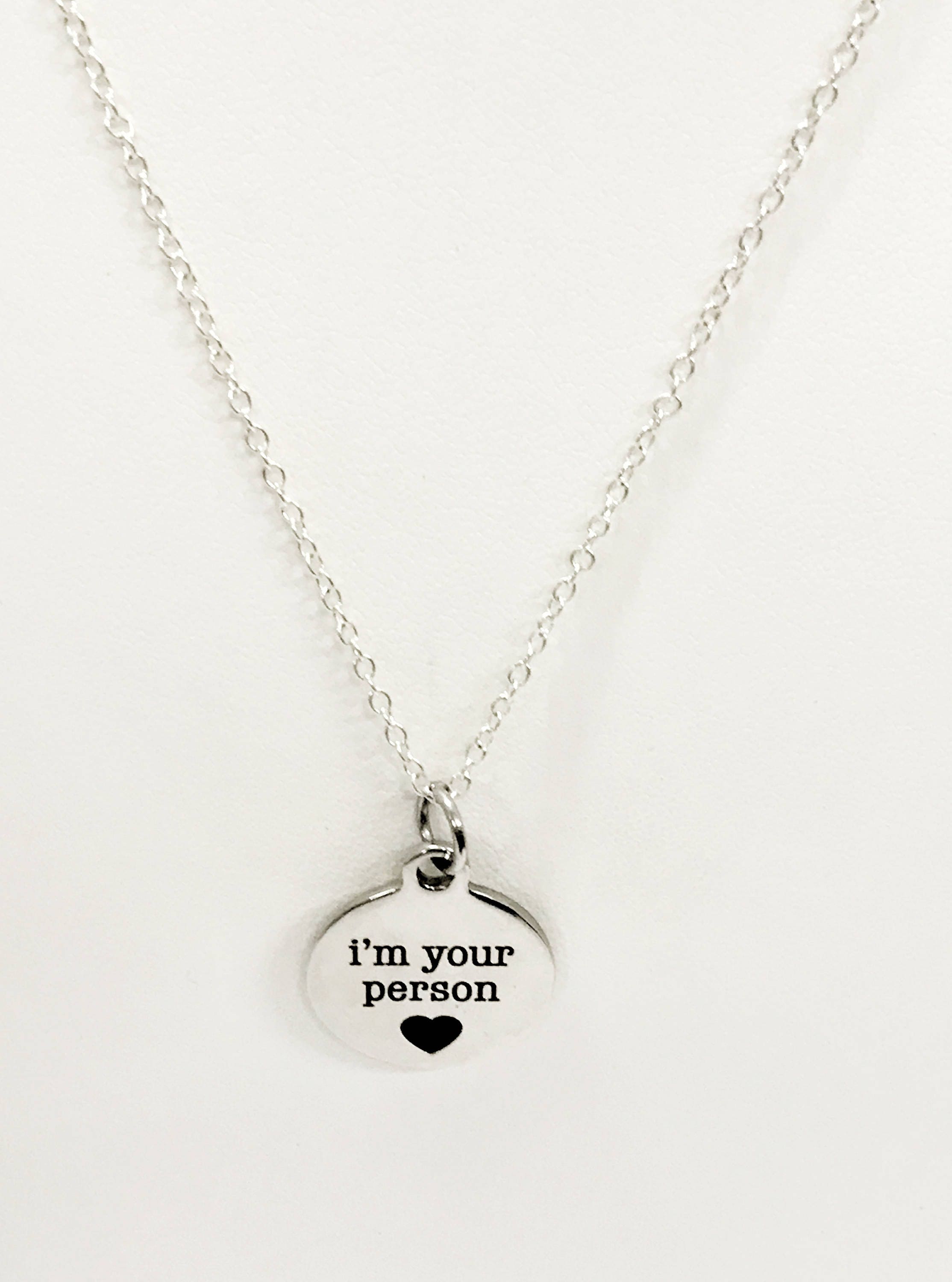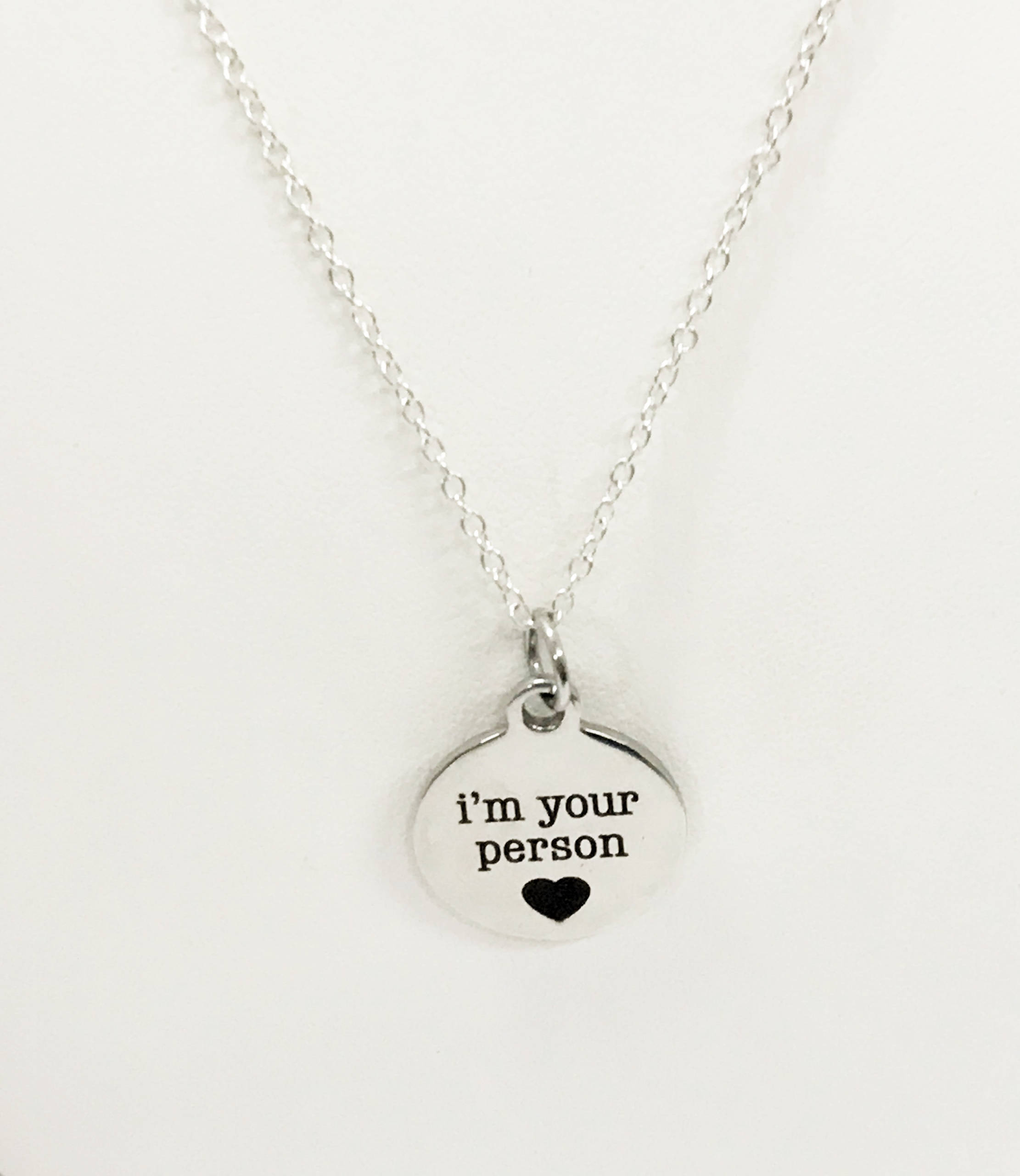 This necklace serves as a great encouragement. This is a stainless steel laser engraved pendant on a silver plated link chain. The pendant has "I'm your person" on it. This pendant is available on your choice of 16, 18, 20, 22, 24, 26, 28 or 30 inch chain. The pendant is also available for individual purchase if you have another chain on which you would like to wear it.