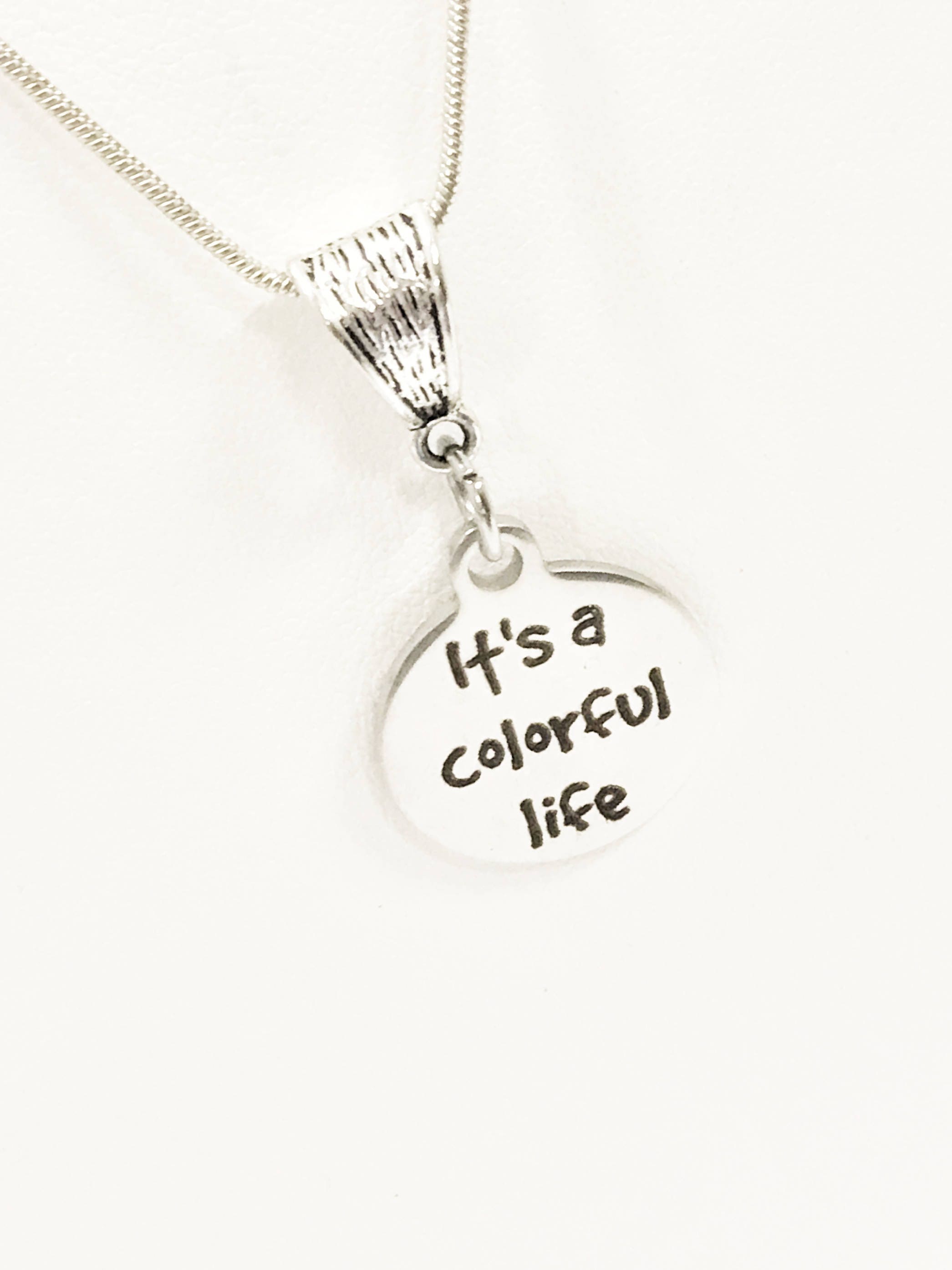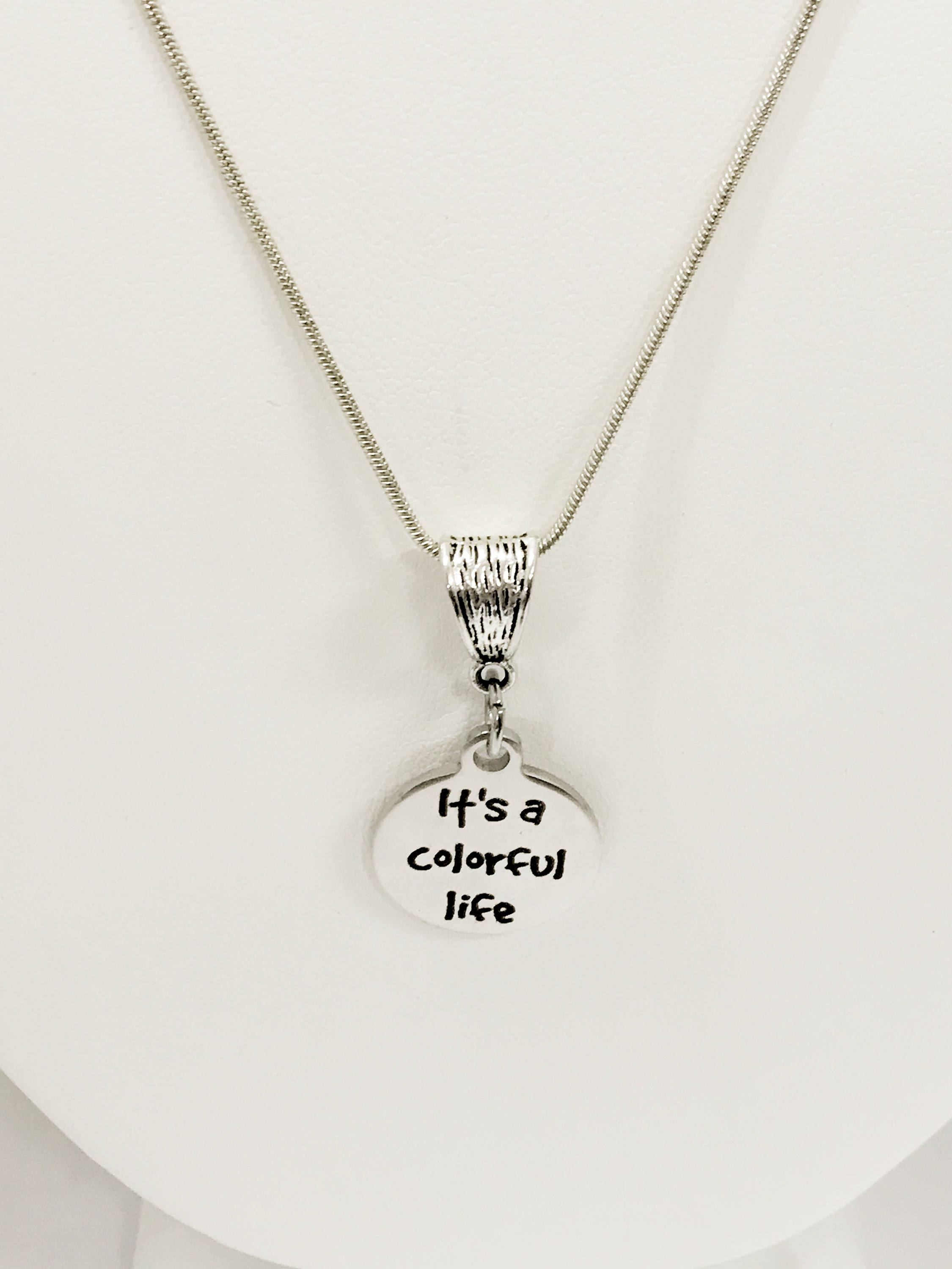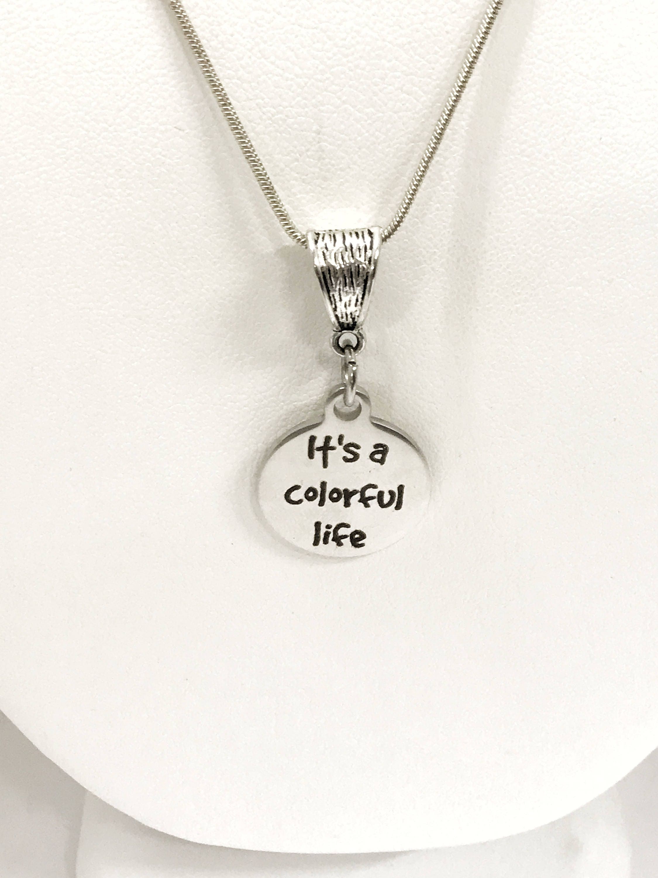 Looking for a gift to give a special person in your life? This necklace has a stainless steel laser engraved pendant with "It's a colorful life" on it to remind the wearer that it is the color of our life that makes it wonderful.