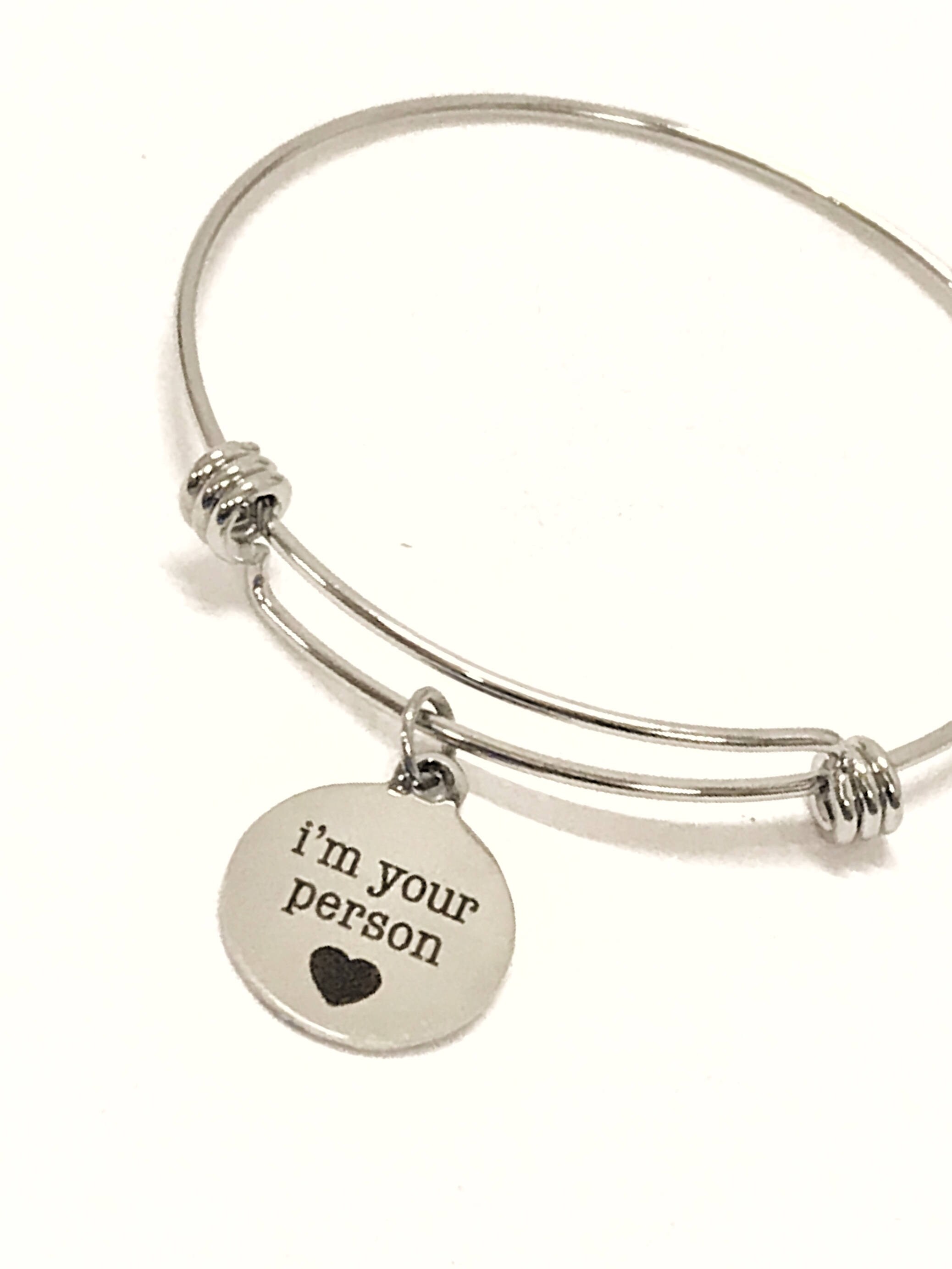This is a beautiful bangle bracelet with a laser engraved stainless steel charm that has the saying "I'm your person" on it to let someone know that you will always be there for them.