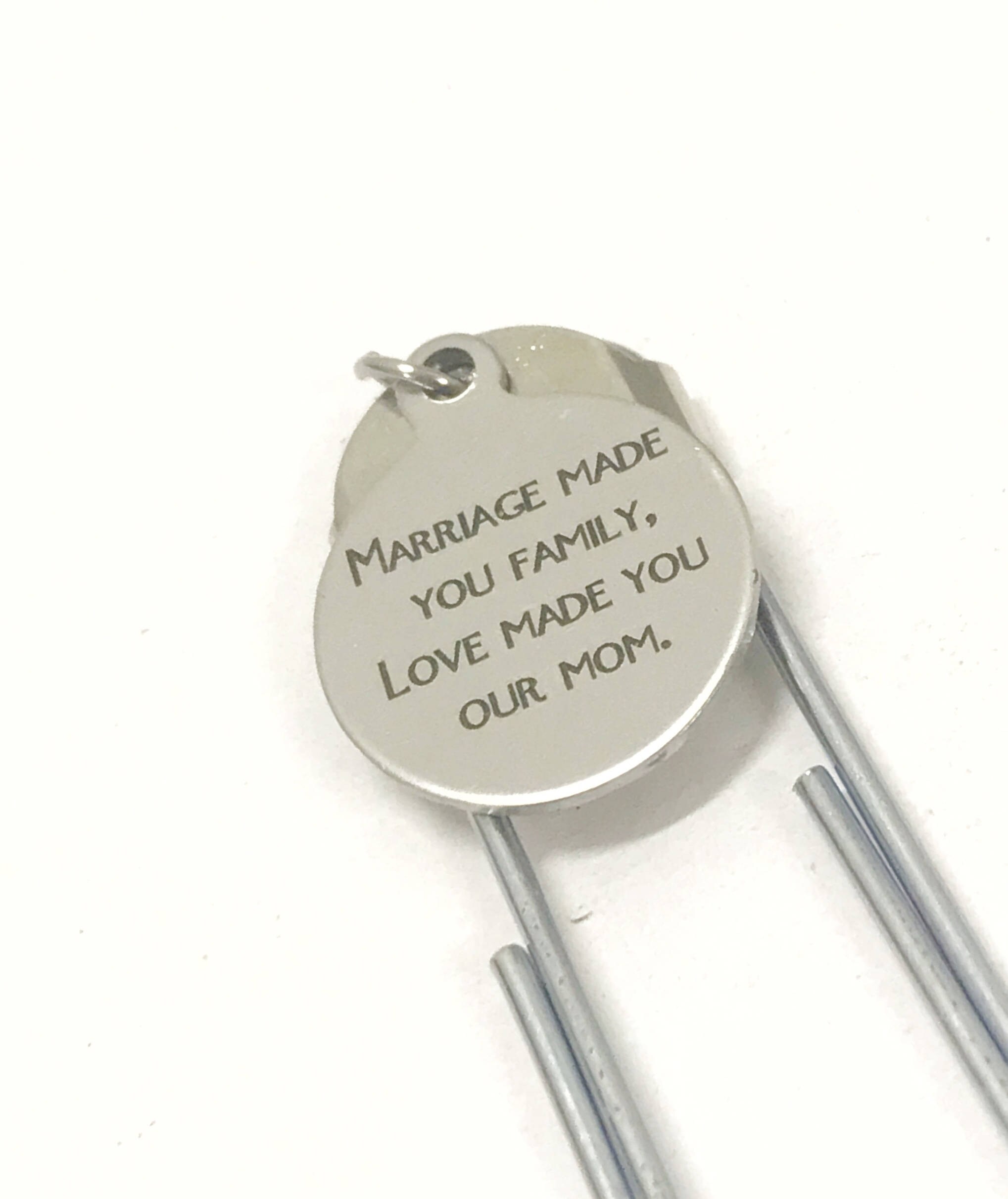 This bookmark has a stainless steel laser engraved charm with "Marriage made your family, love made you our mom" on it. It can be used as a bookmark, page marker, or planner book mark.