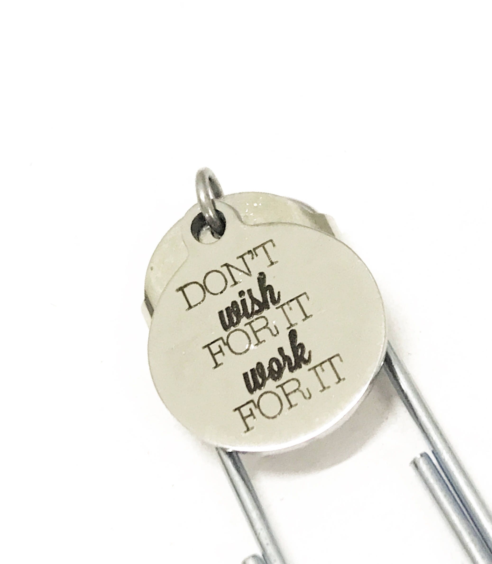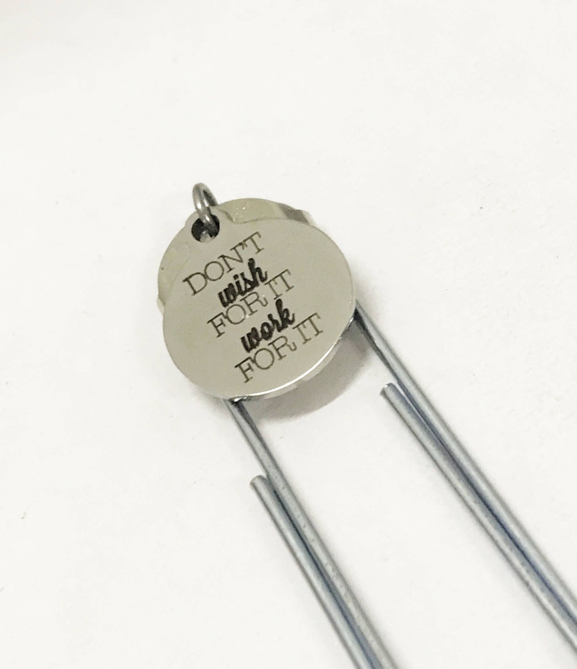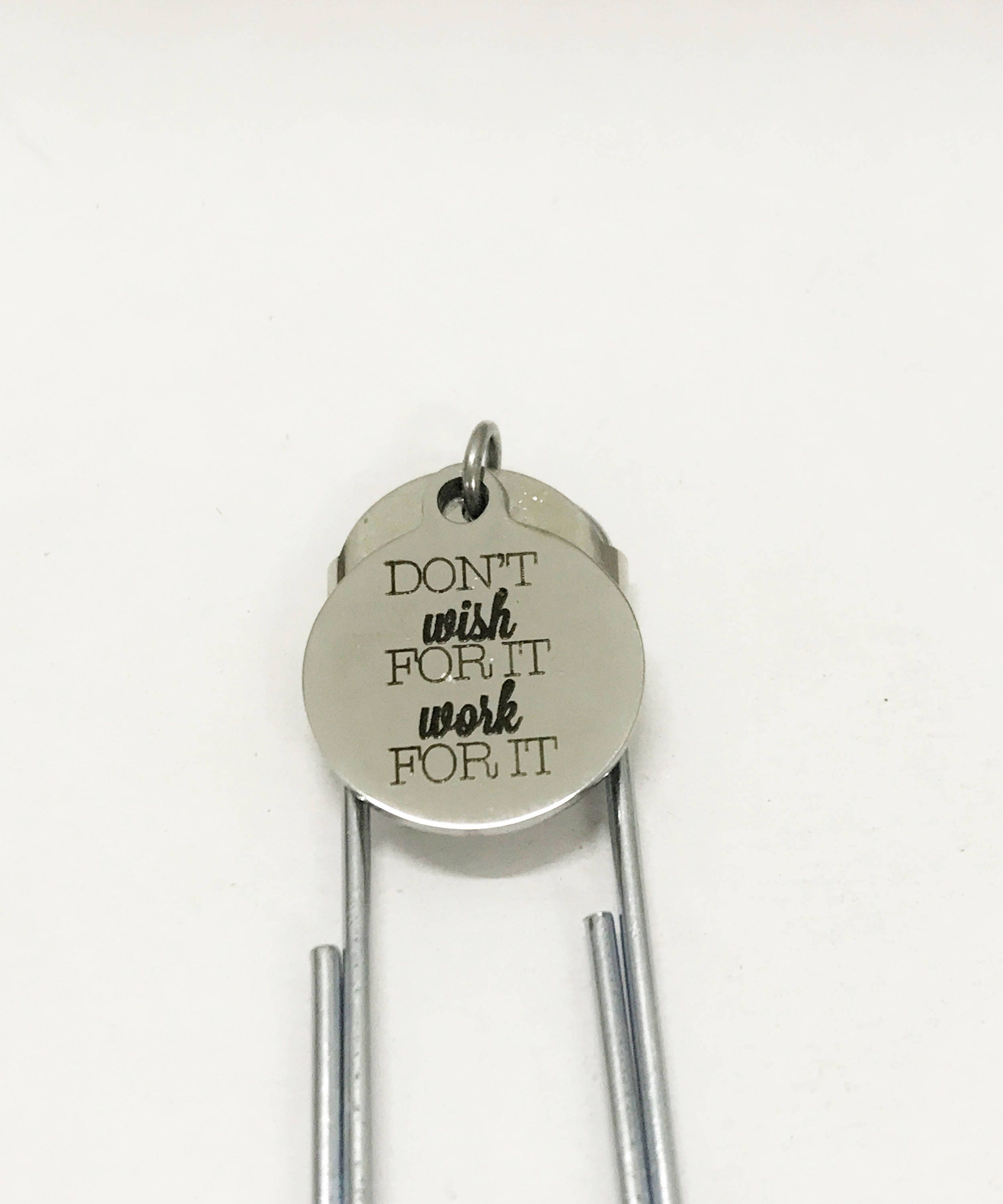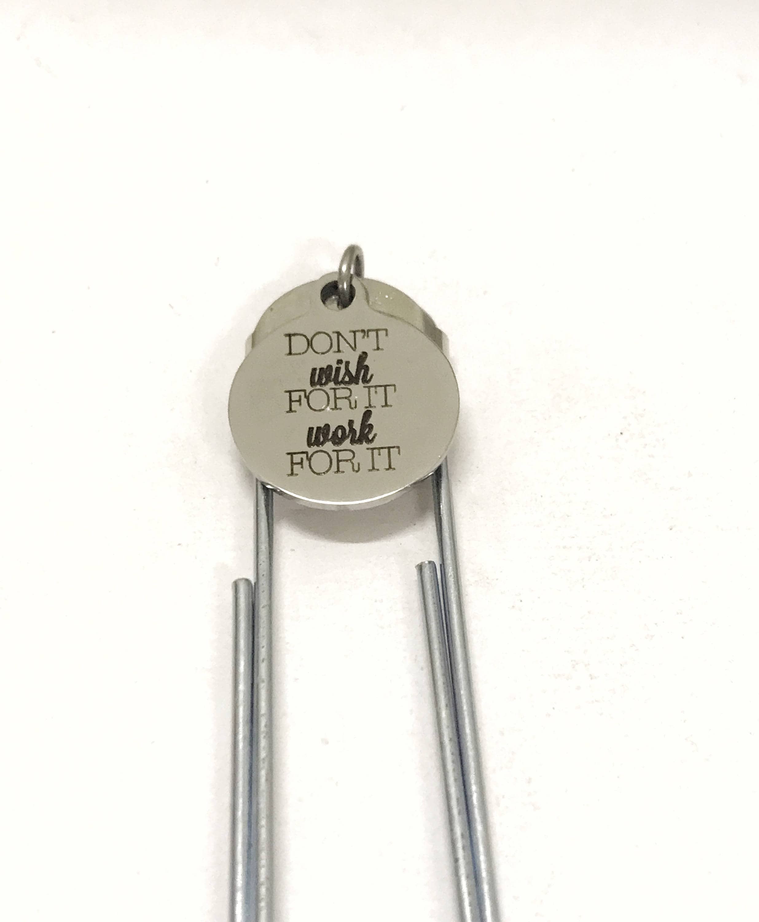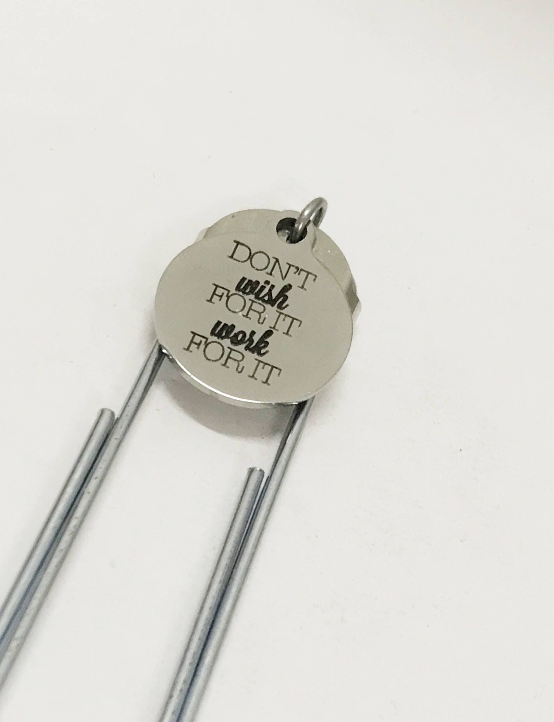 This bookmark has a stainless steel laser engraved charm with "Don't wish for it work for it" on it. It can be used as a bookmark, page marker, or planner book mark.