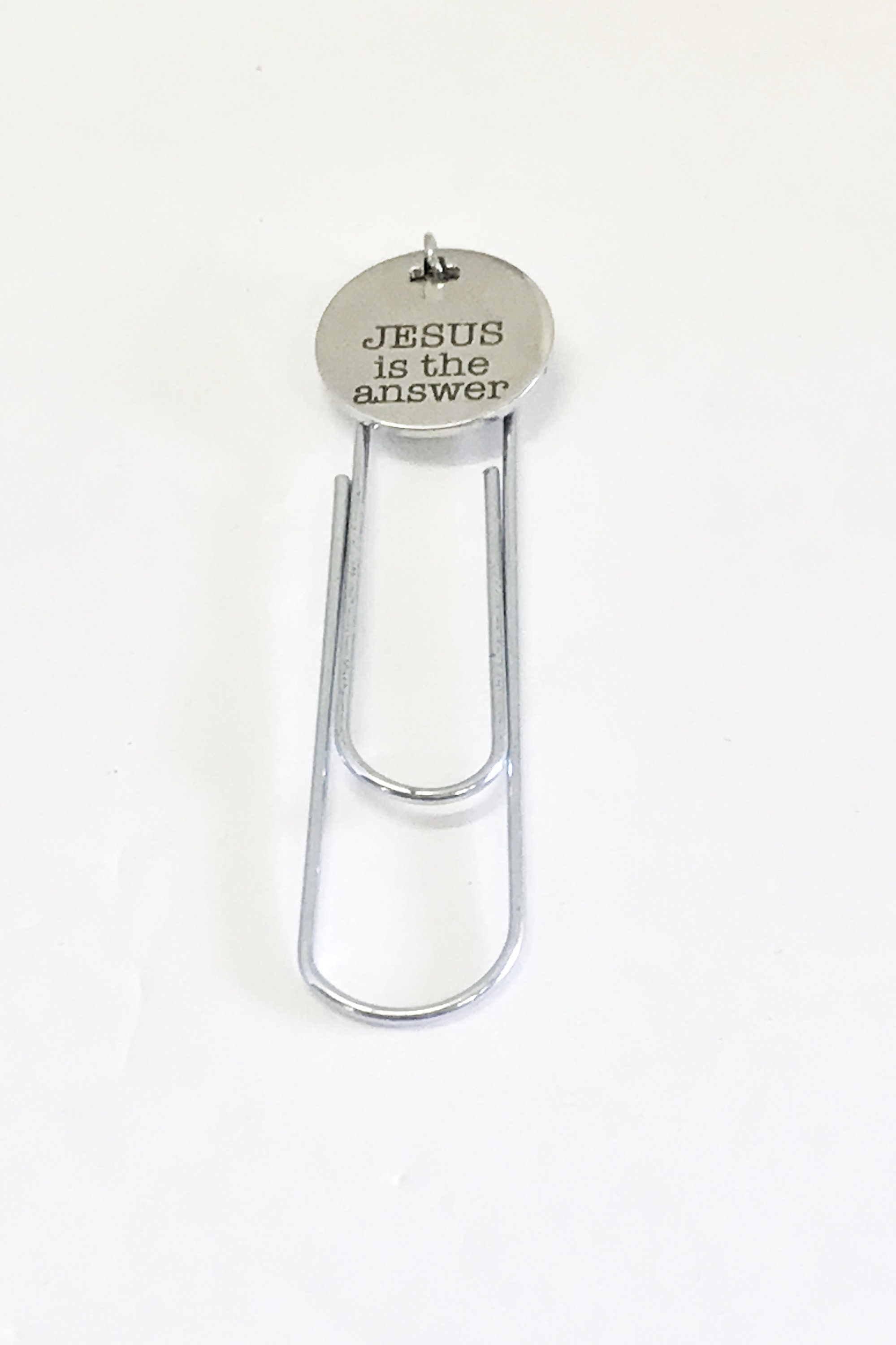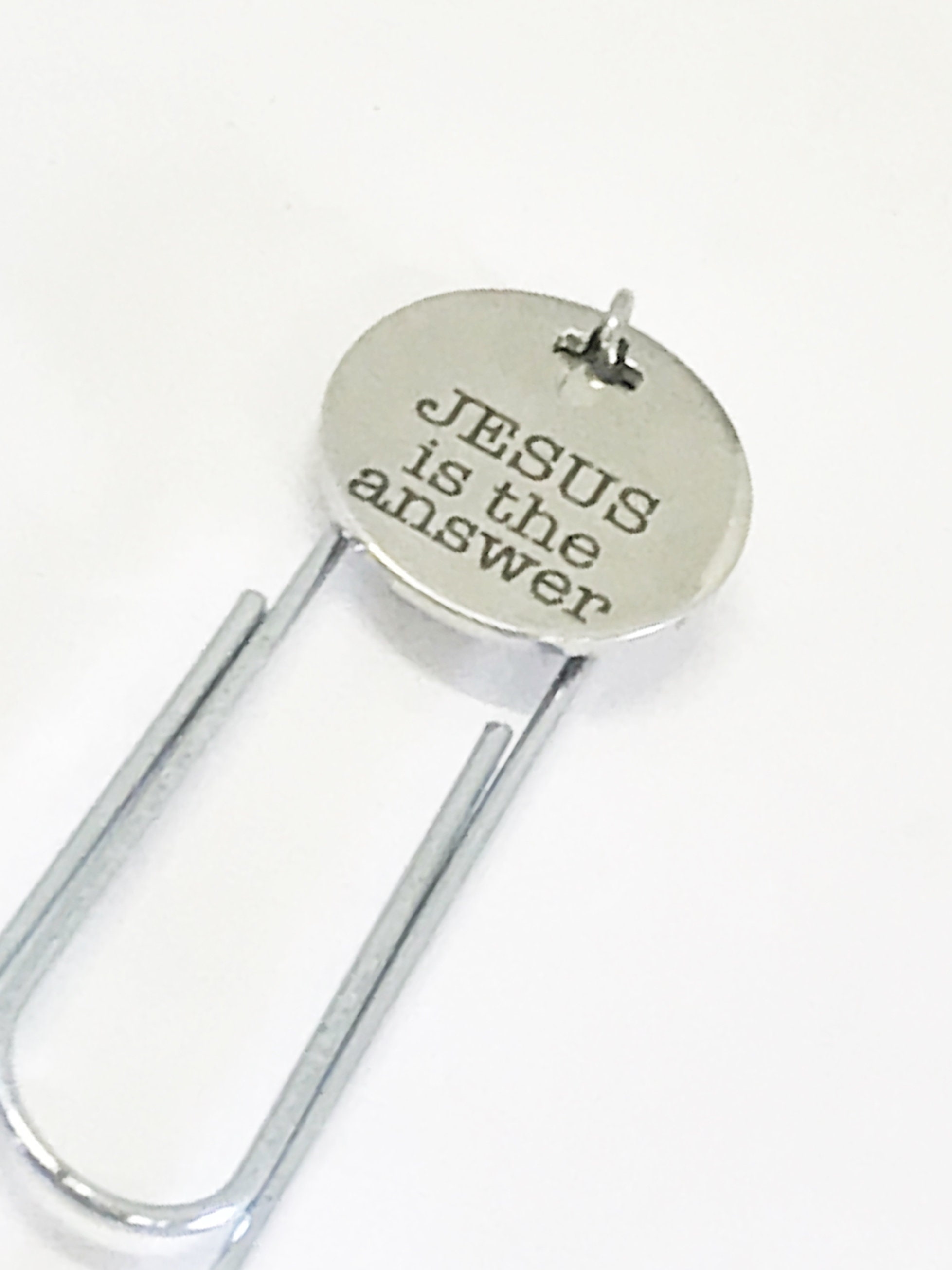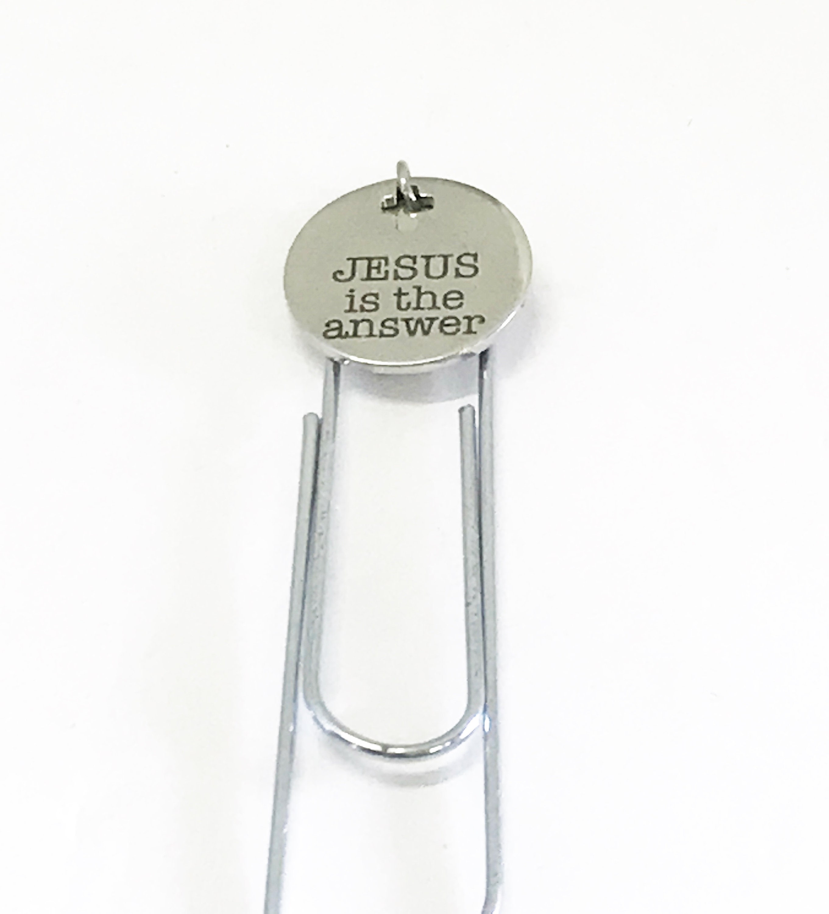 This is a great Christian bookmark gift. This paper clip bookmark has a stainless steel laser engraved charm with "Jesus is the answer" on it. It can be used as a bookmark, page marker, or planner book mark.