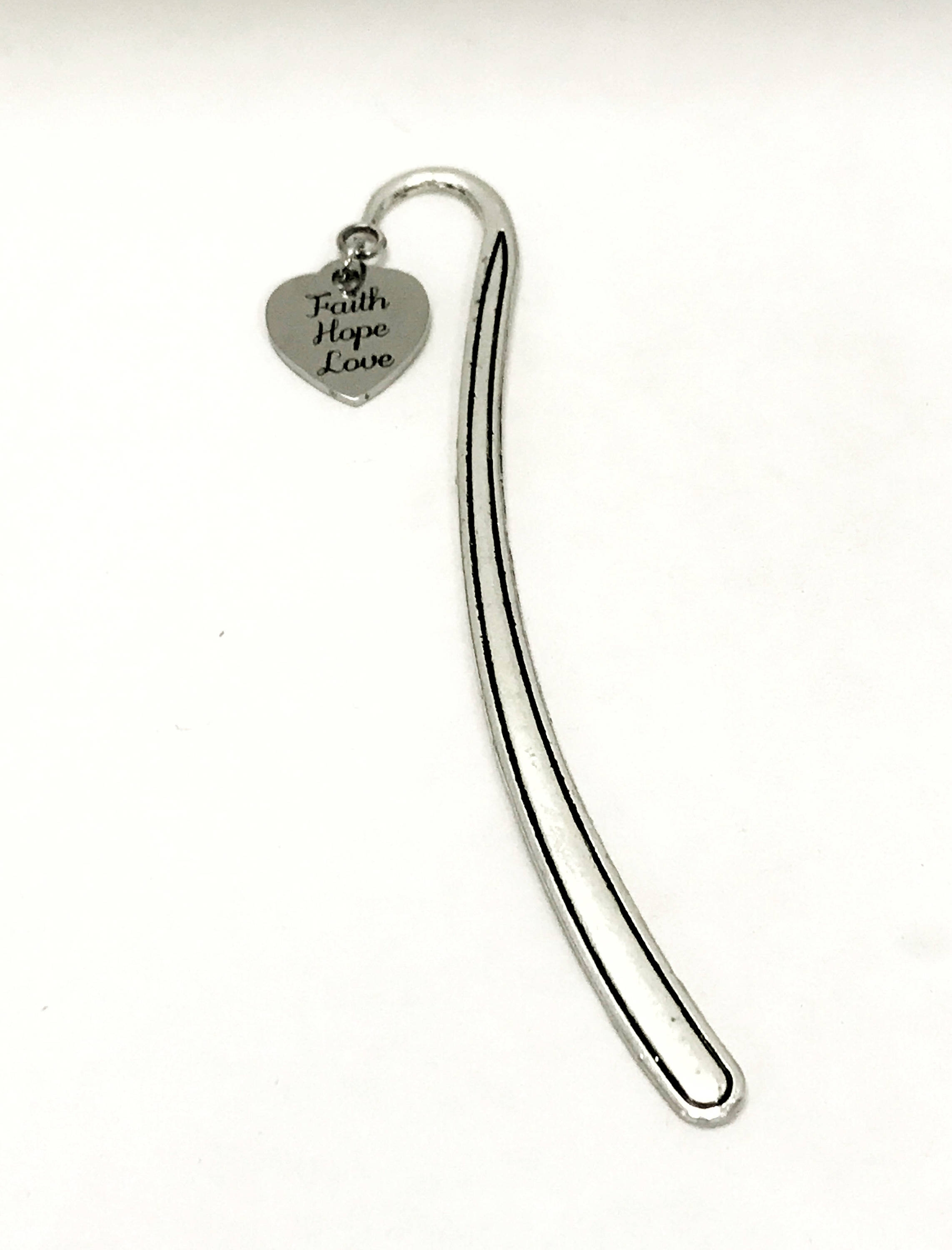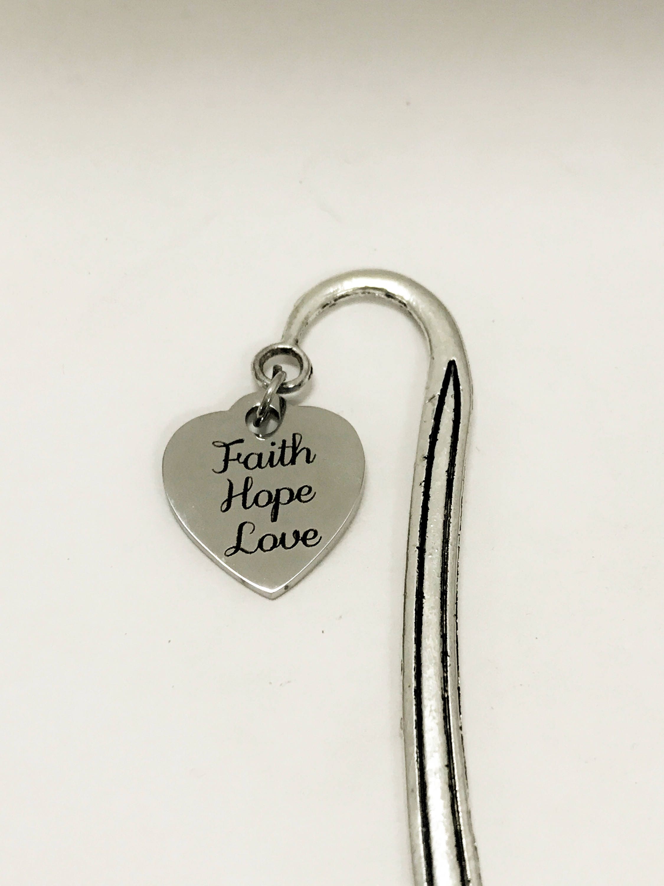 This bookmark would make a great reader gift or Bible bookmark. It has a stainless steel laser engraved charm with "Faith Hope Love" on it.