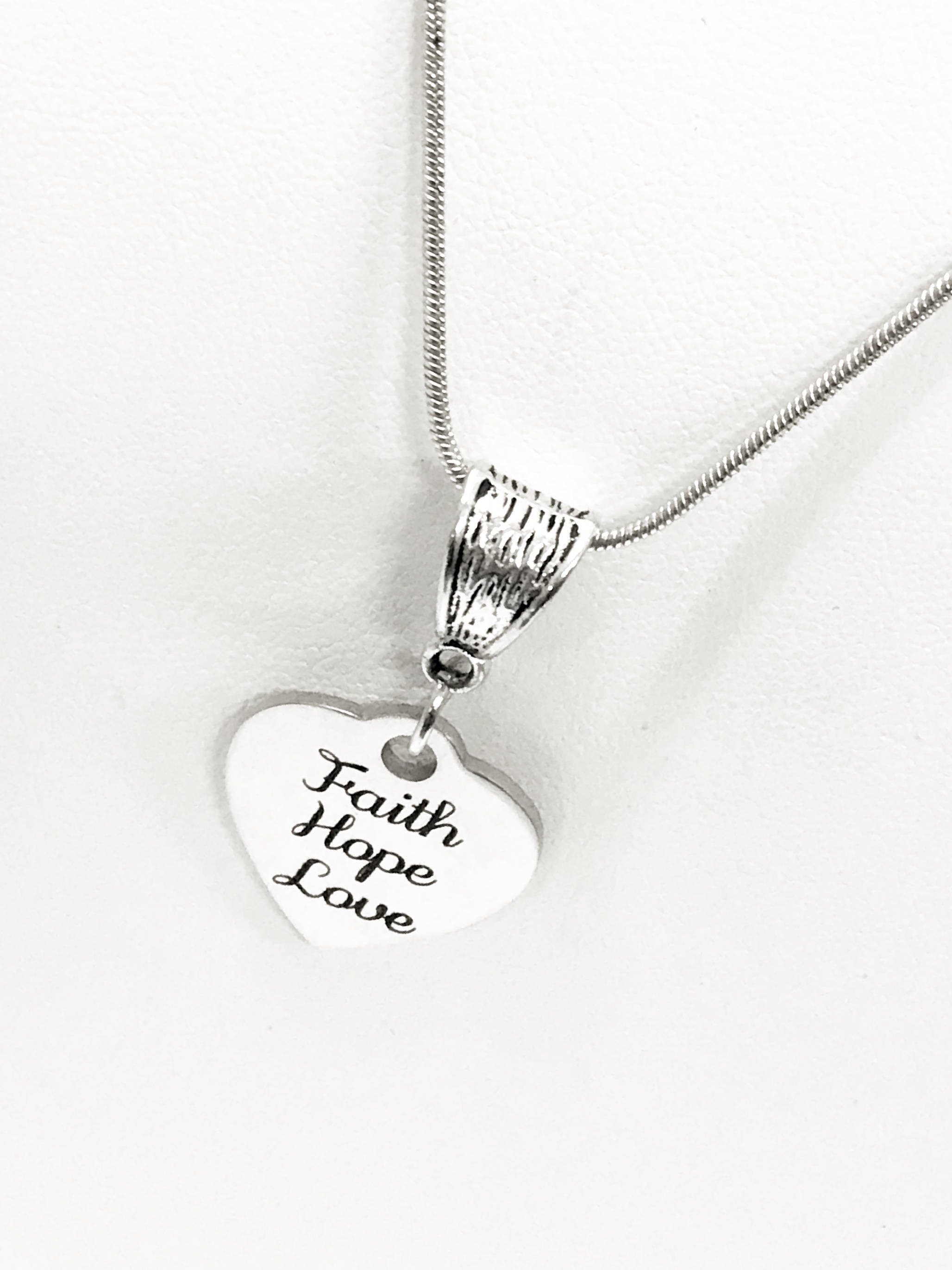 This is a nice gift to remind someone of the Bible scripture of 1 Cor 13. It has a stainless steel laser engraved charm with "Faith Hope Love" on it.