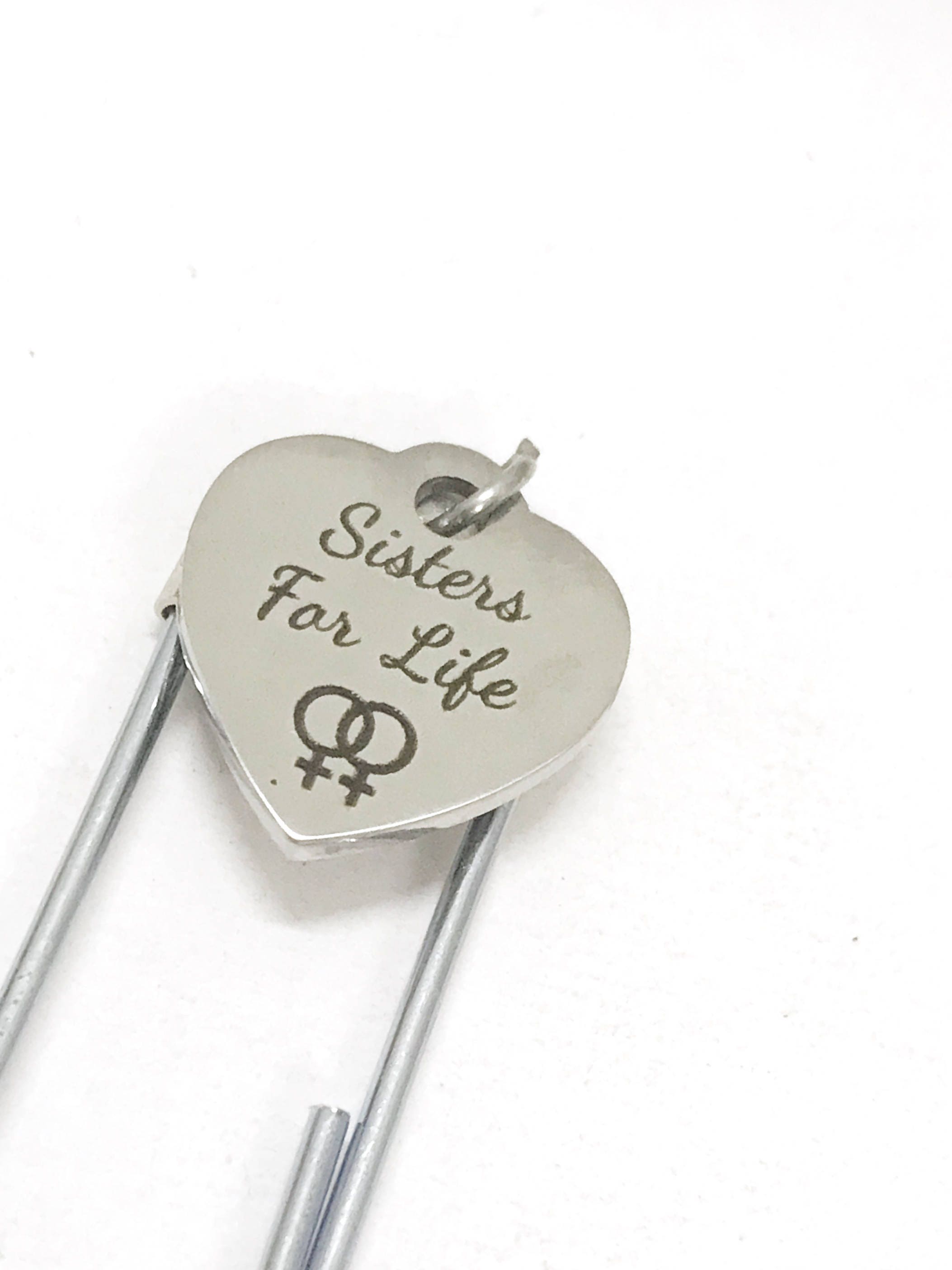 This bookmark has a stainless steel laser engraved charm with "Sisters For Life" on it. It can be used as a bookmark, page marker, or planner book mark.