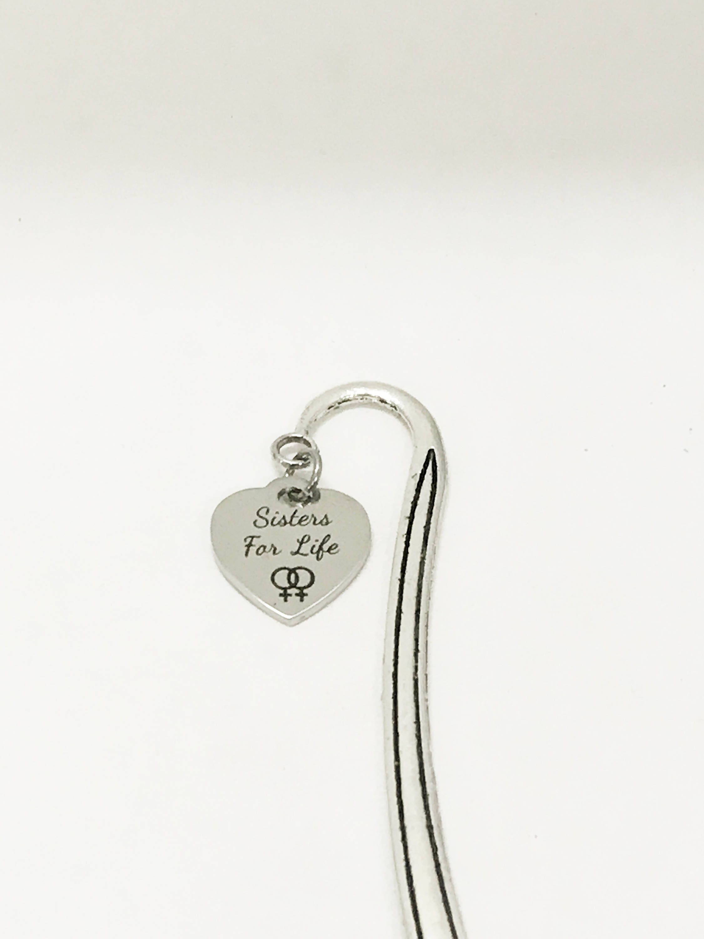 This bookmark would make a great reader gift or planner bookmark. It has a stainless steel laser engraved charm with "Sisters For Life" on it.