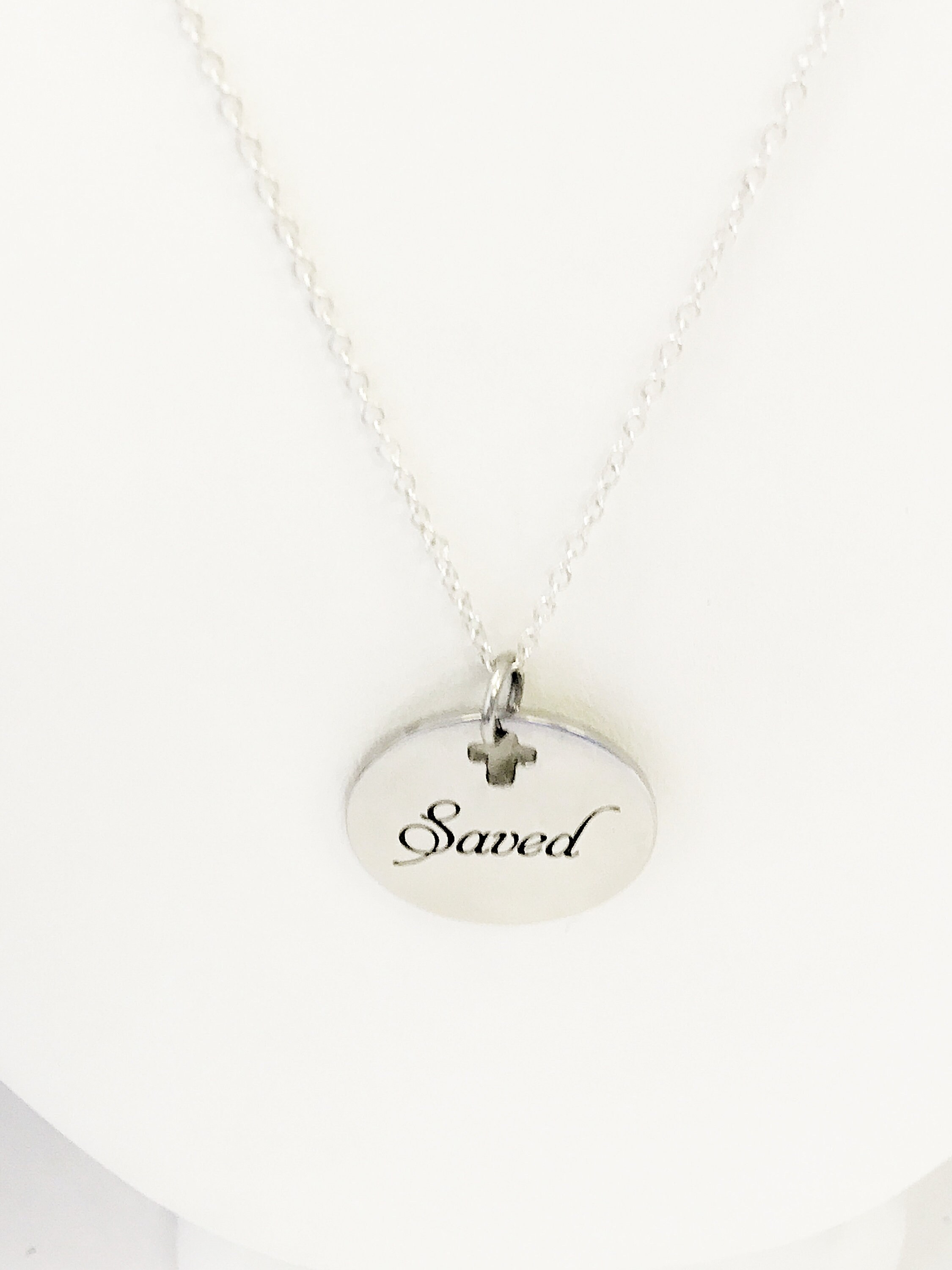 This Christian gift necklace is a beautiful stainless steel laser engraved pendant with "Saved" on it. This pendant is available on your choice of 16, 18, 20, 22, 24, 26, 28 or 30 silver-plated inch chain. The pendant is also available for individual purchase if you have another chain on which you would like to wear it.