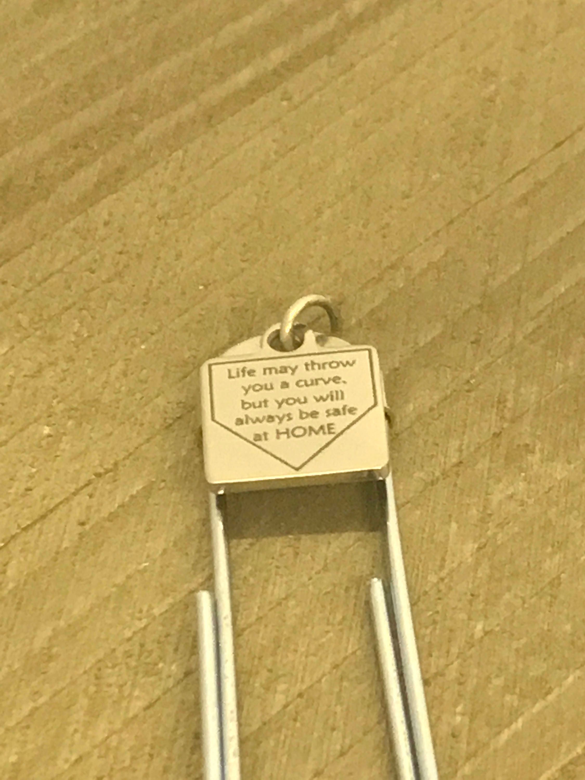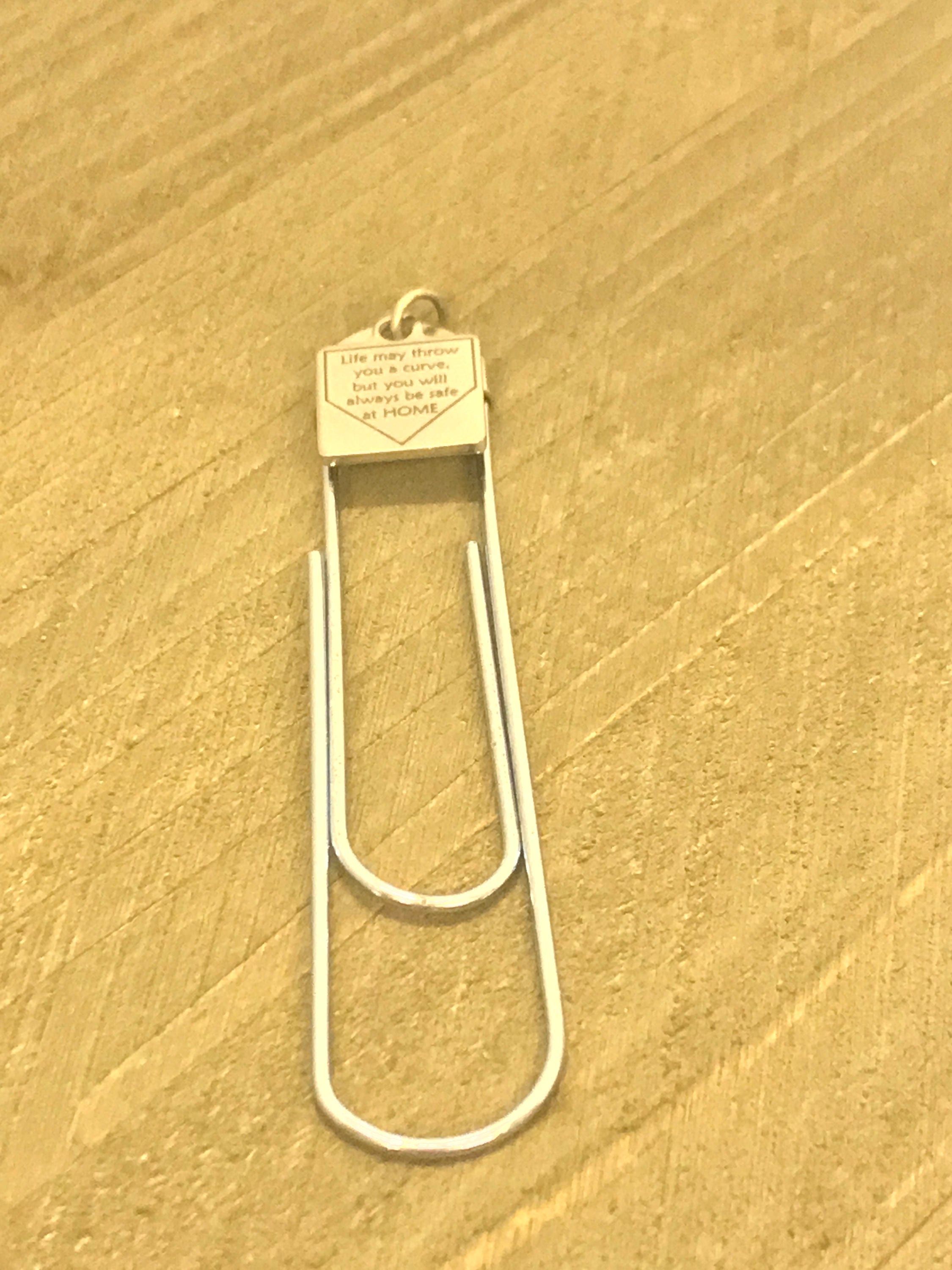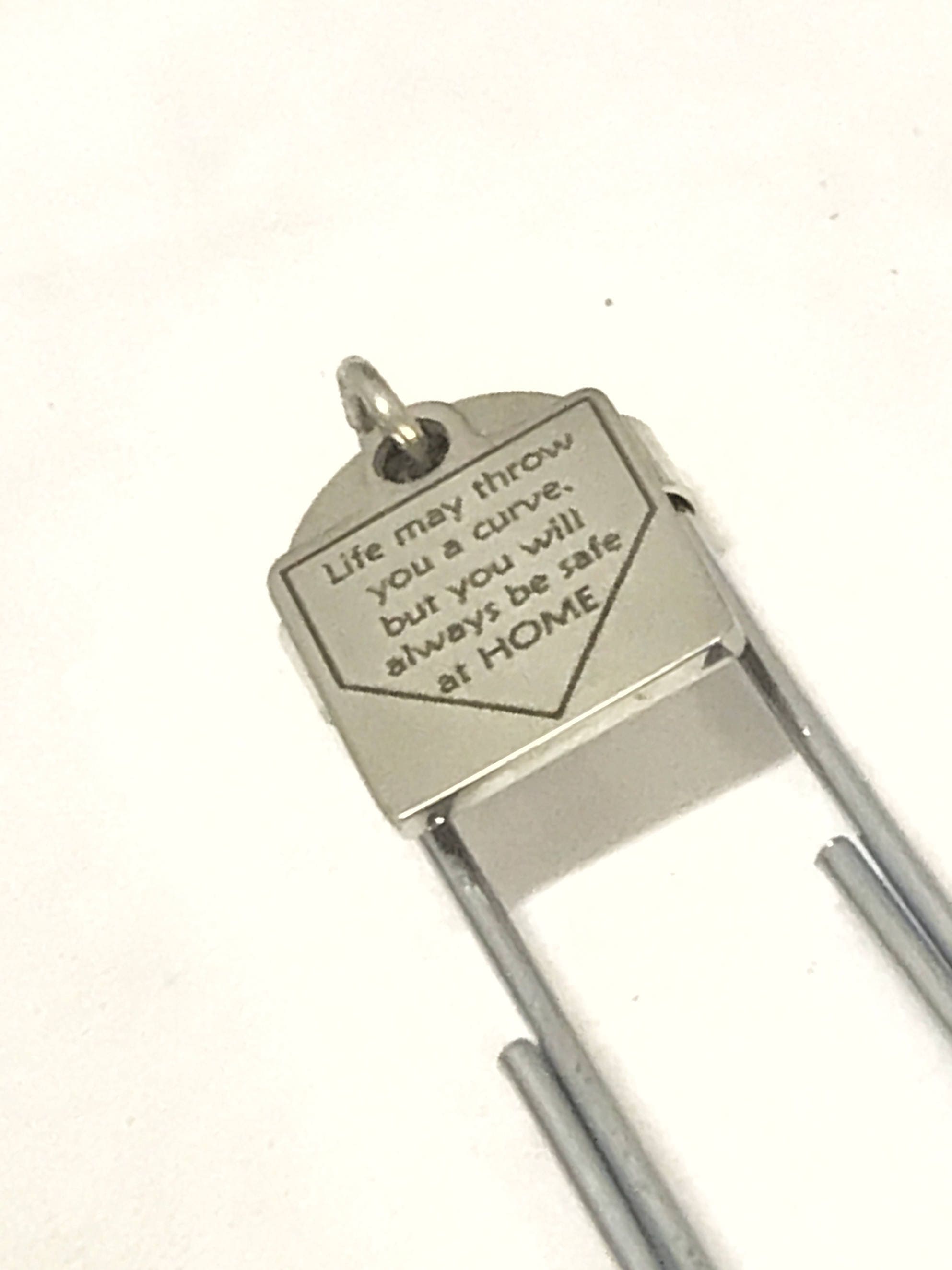 This is a great baseball or softball player encouragement bookmark. This paper clip bookmark has a stainless steel laser engraved charm with "Life may throw you a curve, but you will always be safe at HOME" on it. It can be used as a bookmark, page marker, or planner book mark.