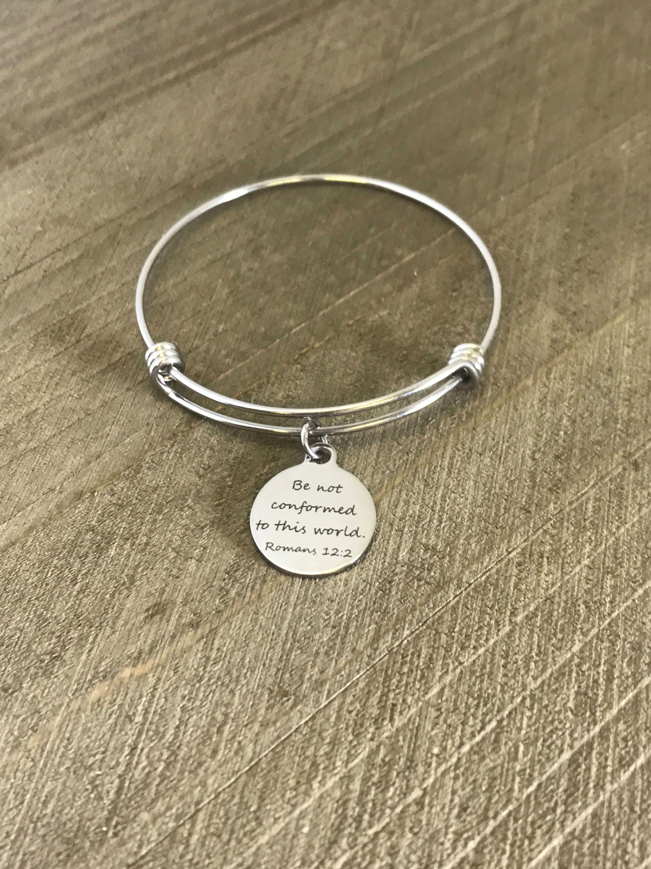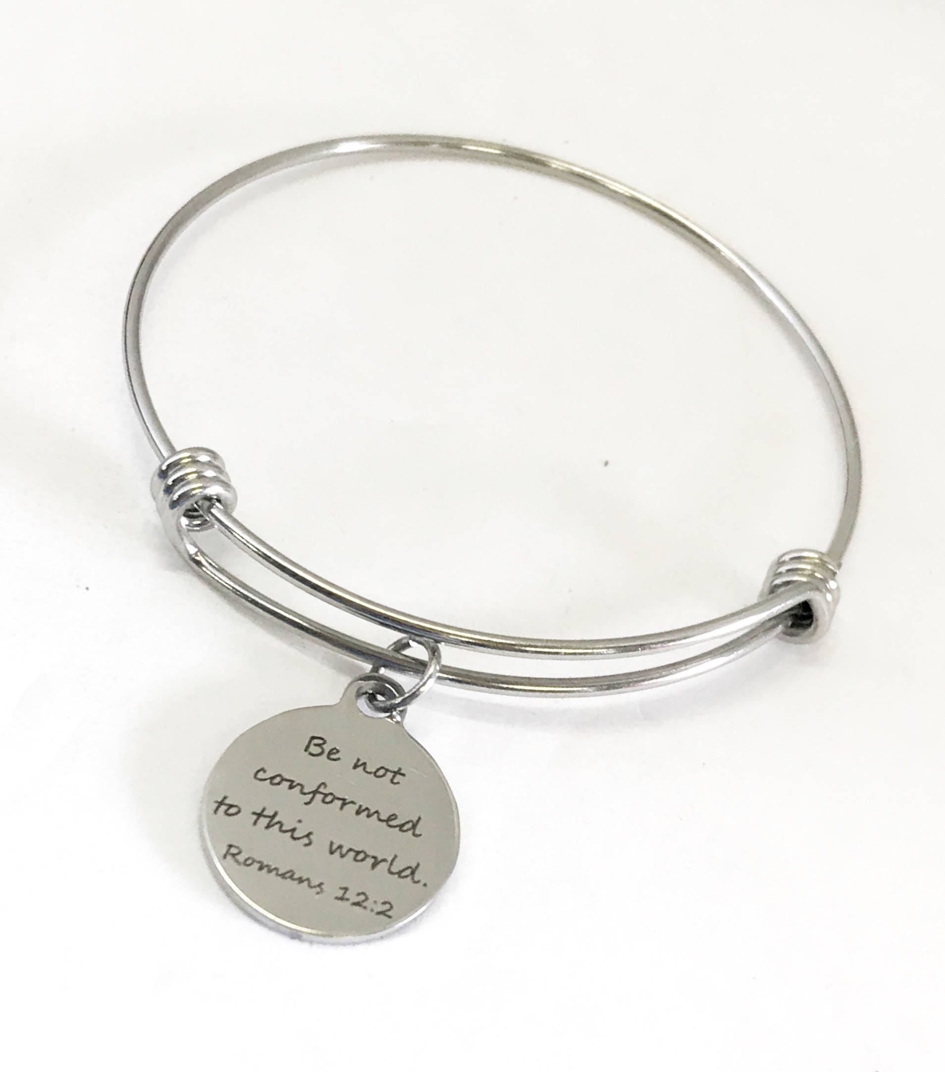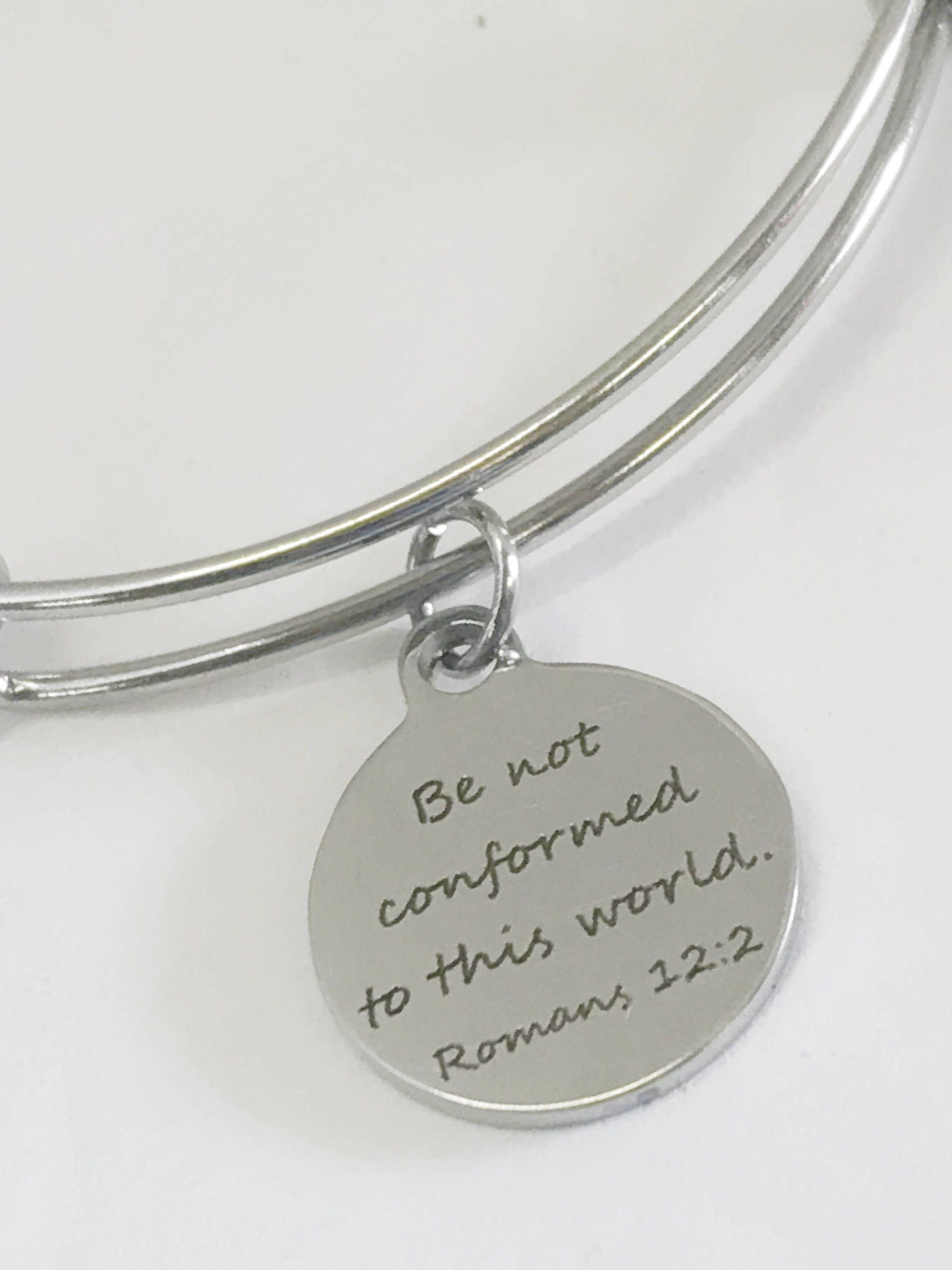This is a great Christian jewelry gift with a stainless steel laser engraved charm on it. The charm says "Be not conformed to the world" from Romans 12:2 on it.
