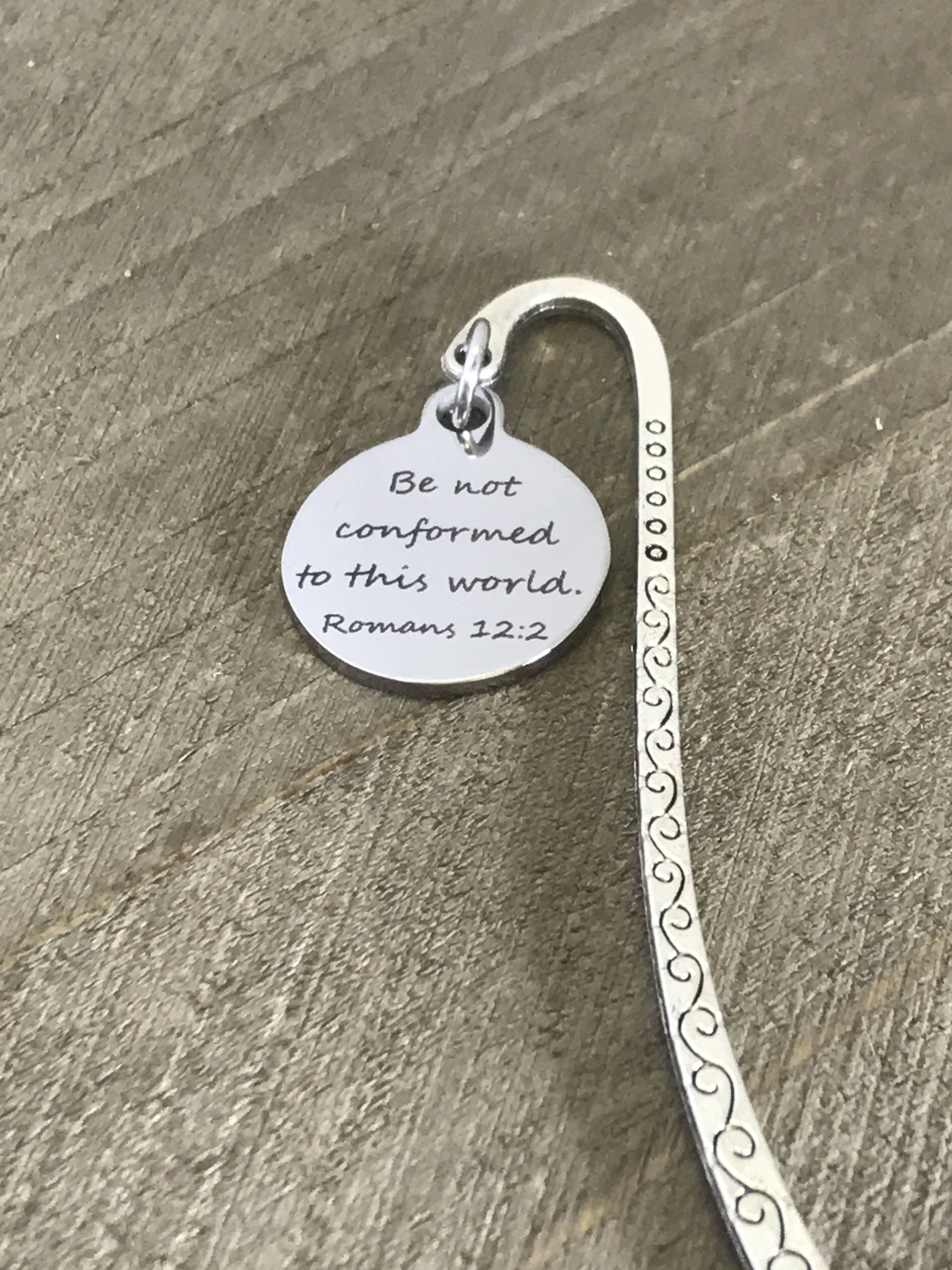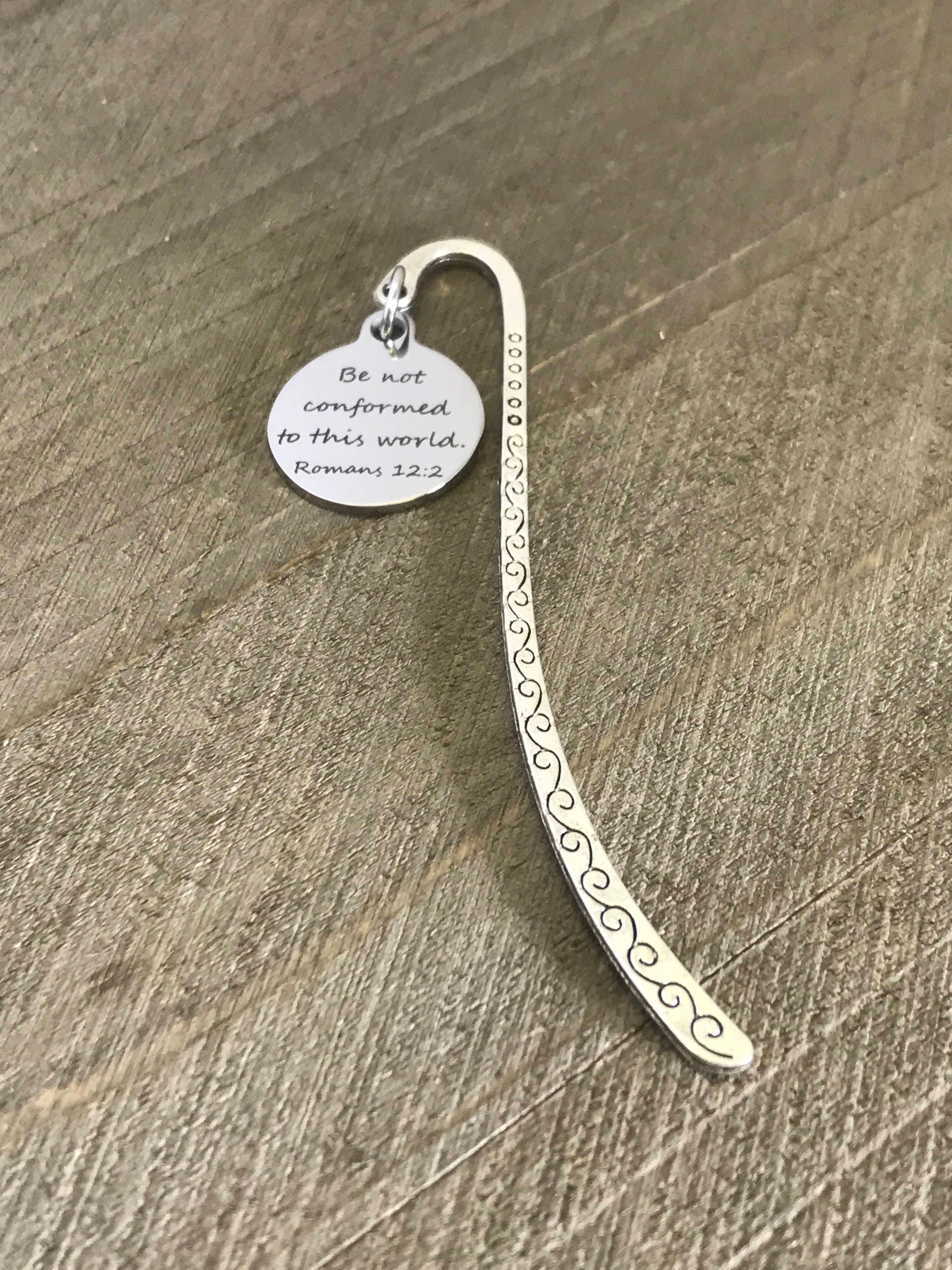 This is a great scripture gift. It is a bookmark with a stainless steel laser engraved charm that has "Be not conformed to this world" from the Bible verse of Romans 12:2 on it. The bookmark measures approx. 3.3 Inches in length and would be a great bookmark for smaller paperbacks or smaller, compact planners or bibles.