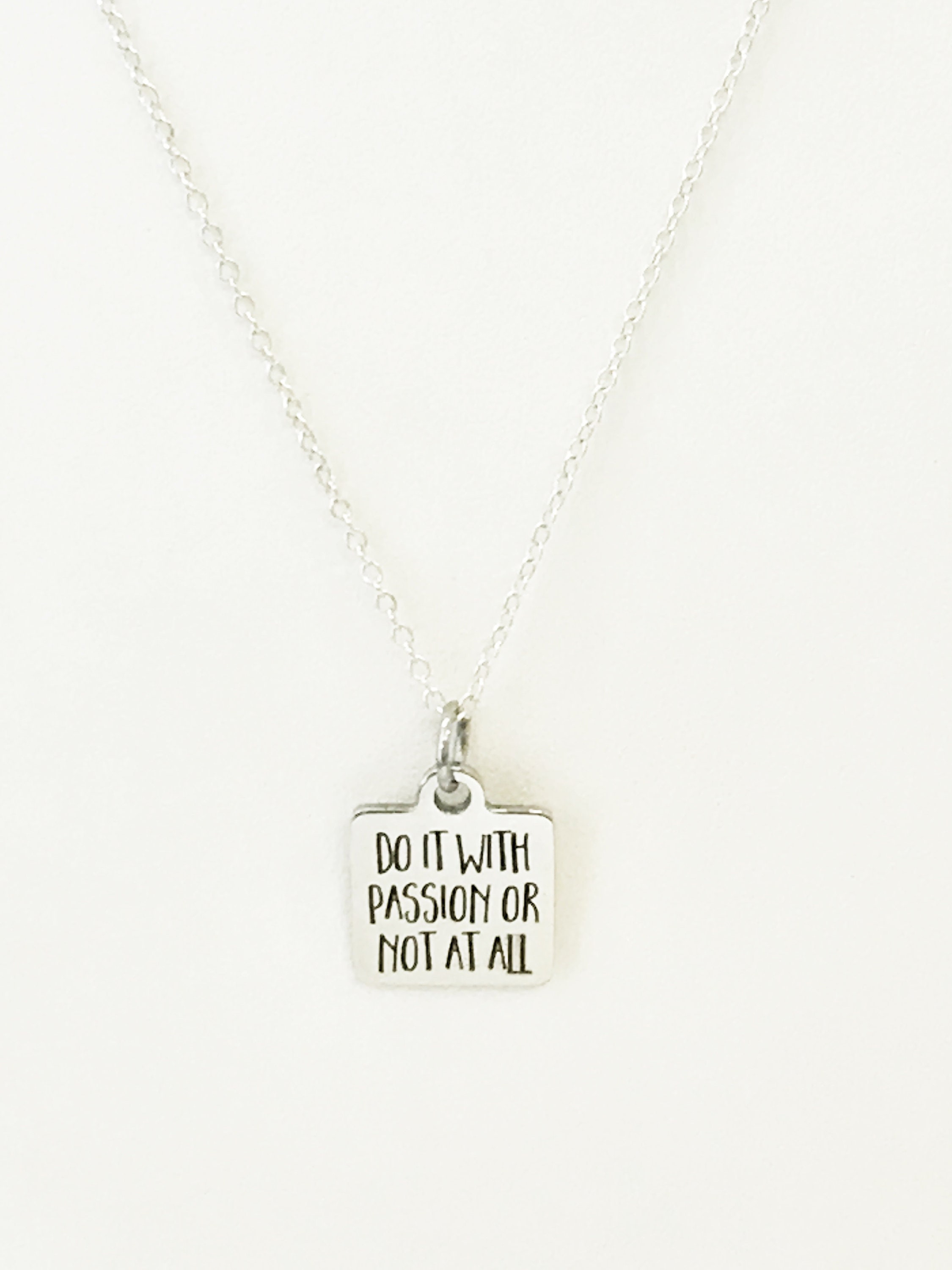 This motivation gift necklace is a beautiful stainless steel laser engraved pendant with the "Do it with passion or not at all" on it. This pendant is available on your choice of 16, 18, 20, 22, 24, 26, 28 or 30 silver-plated inch chain. The pendant is also available for individual purchase if you have another chain on which you would like to wear it.