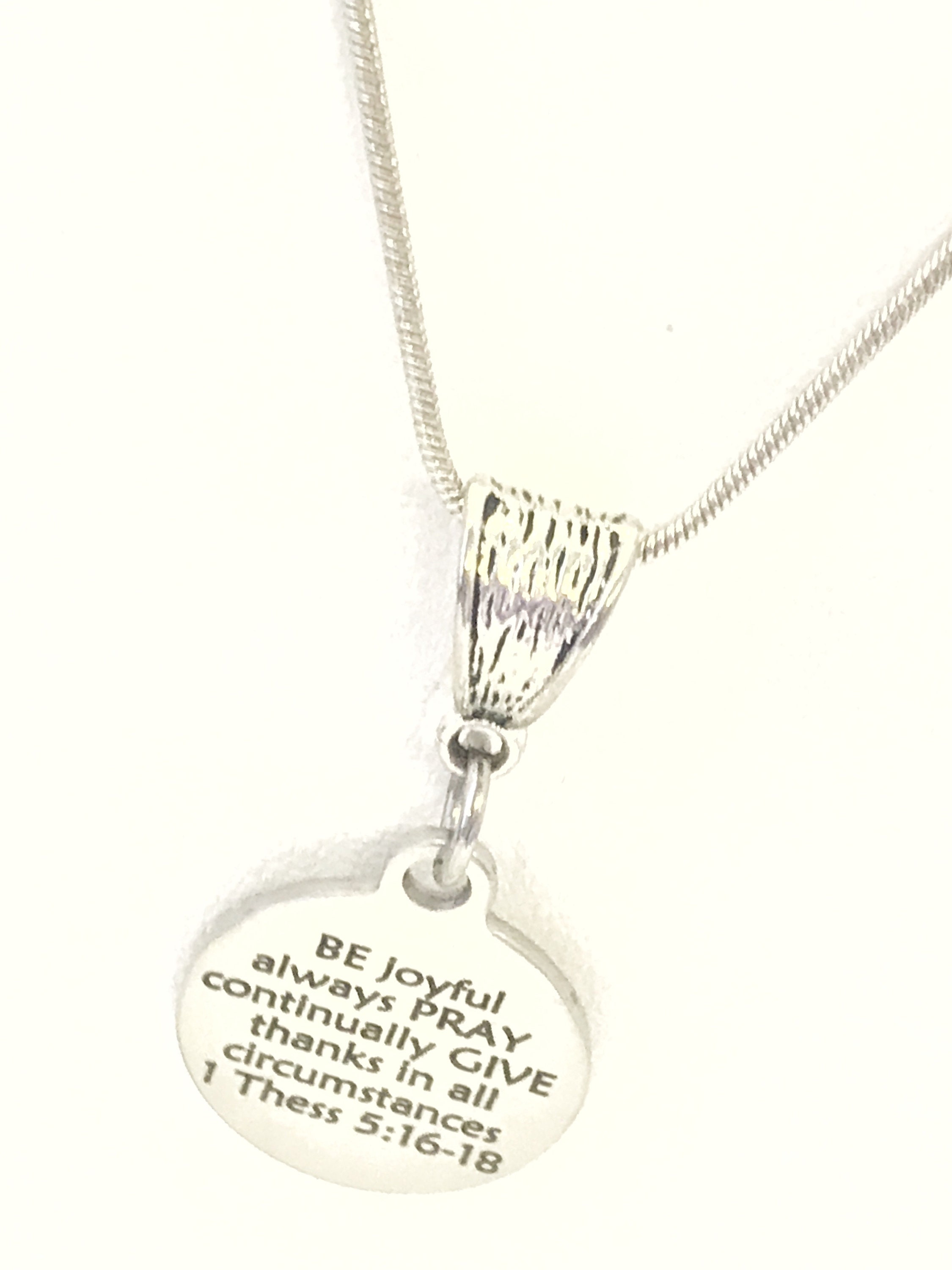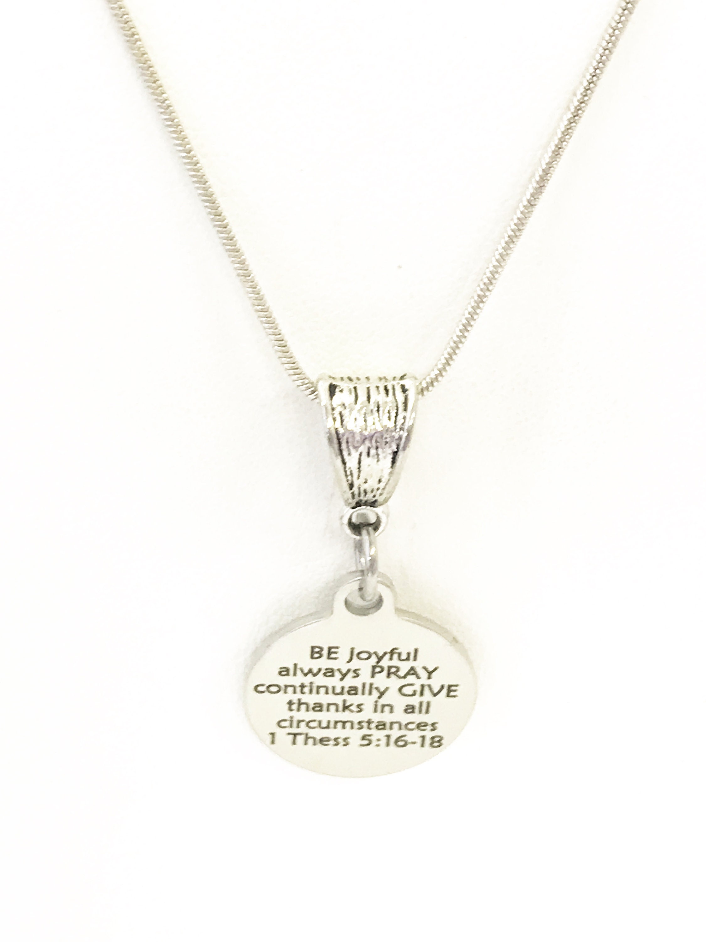 This is a beautiful Christian necklace jewelry gift. It has a stainless steel laser engraved charm with "BE joyful always PRAY continuously GIVE thanks in all circumstances" from 1 Thessalonians 5:16-18 on it.