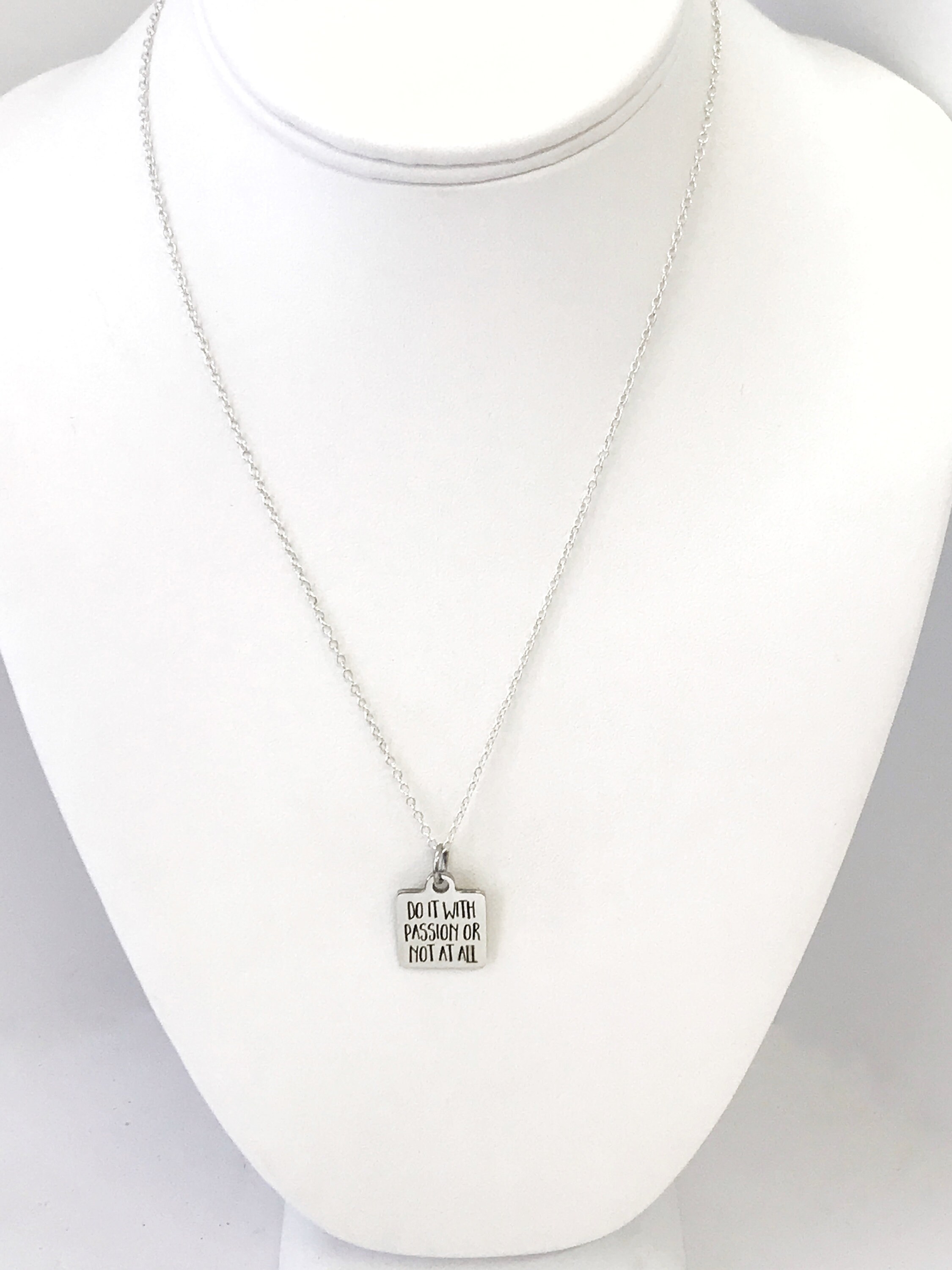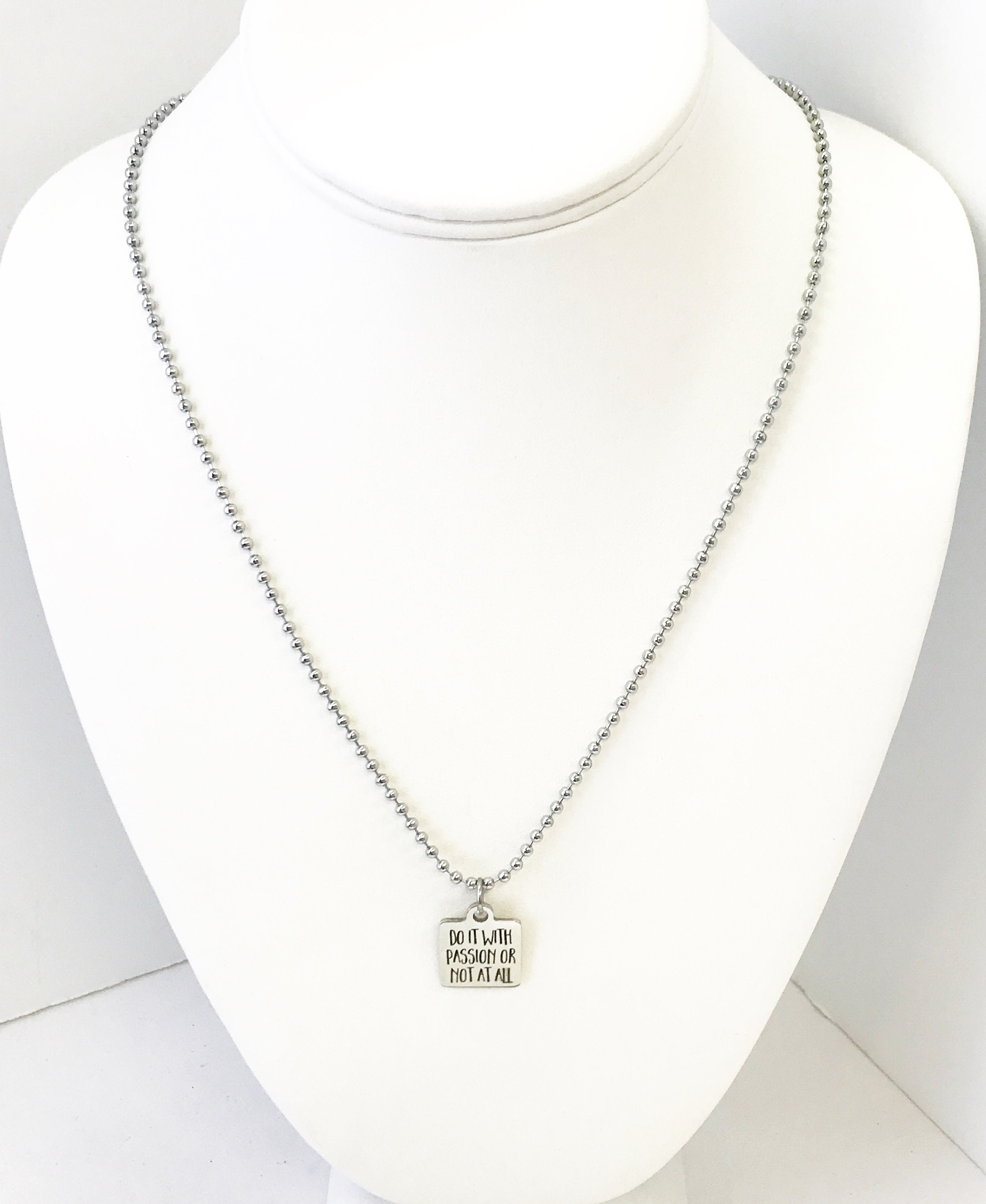 This necklace would make a great encouraging gift. The pendant is a laser engraved charm on a 24 inch stainless steel ball chain. The charm has "Do it with passion or not at all" on it.