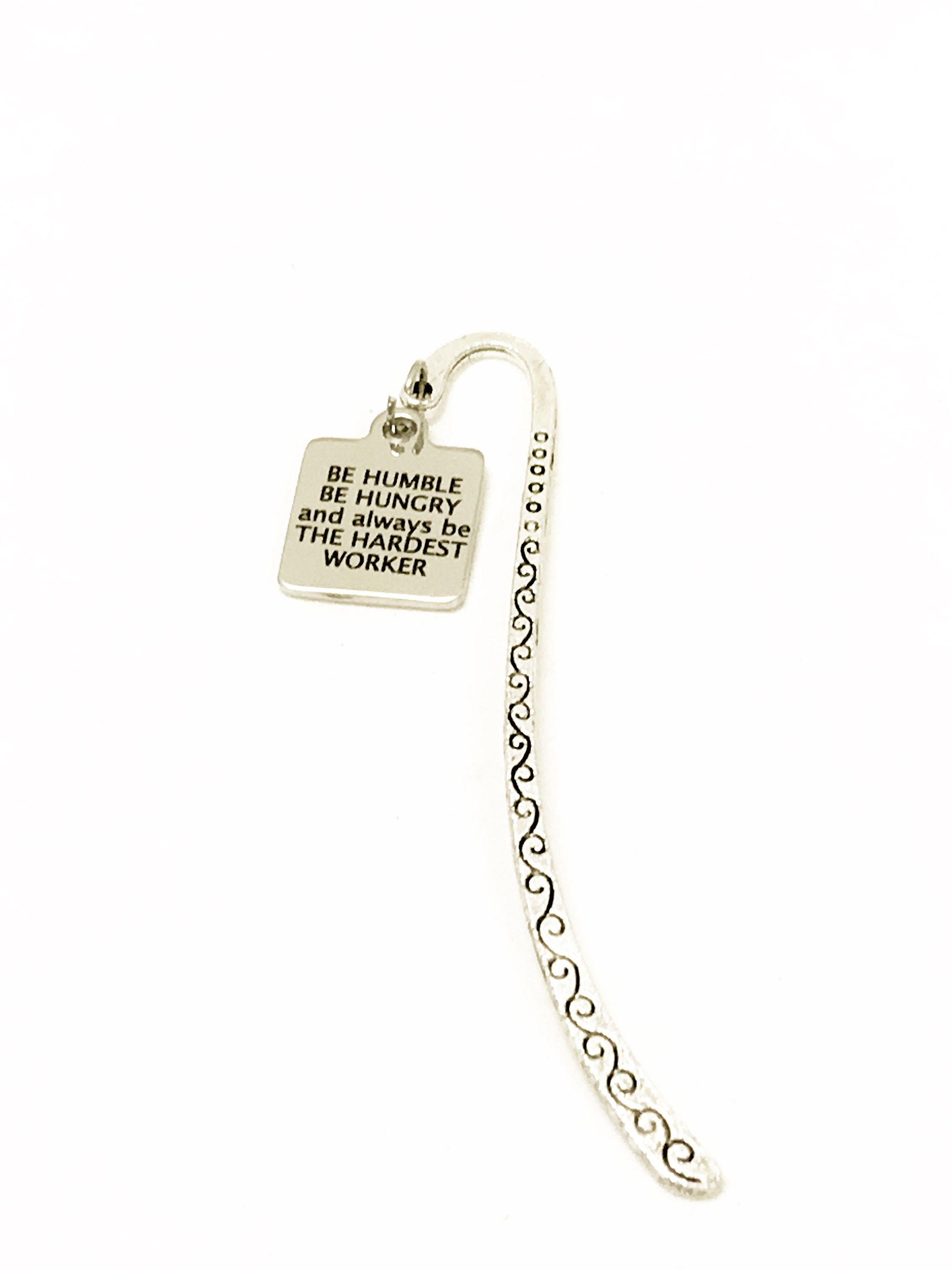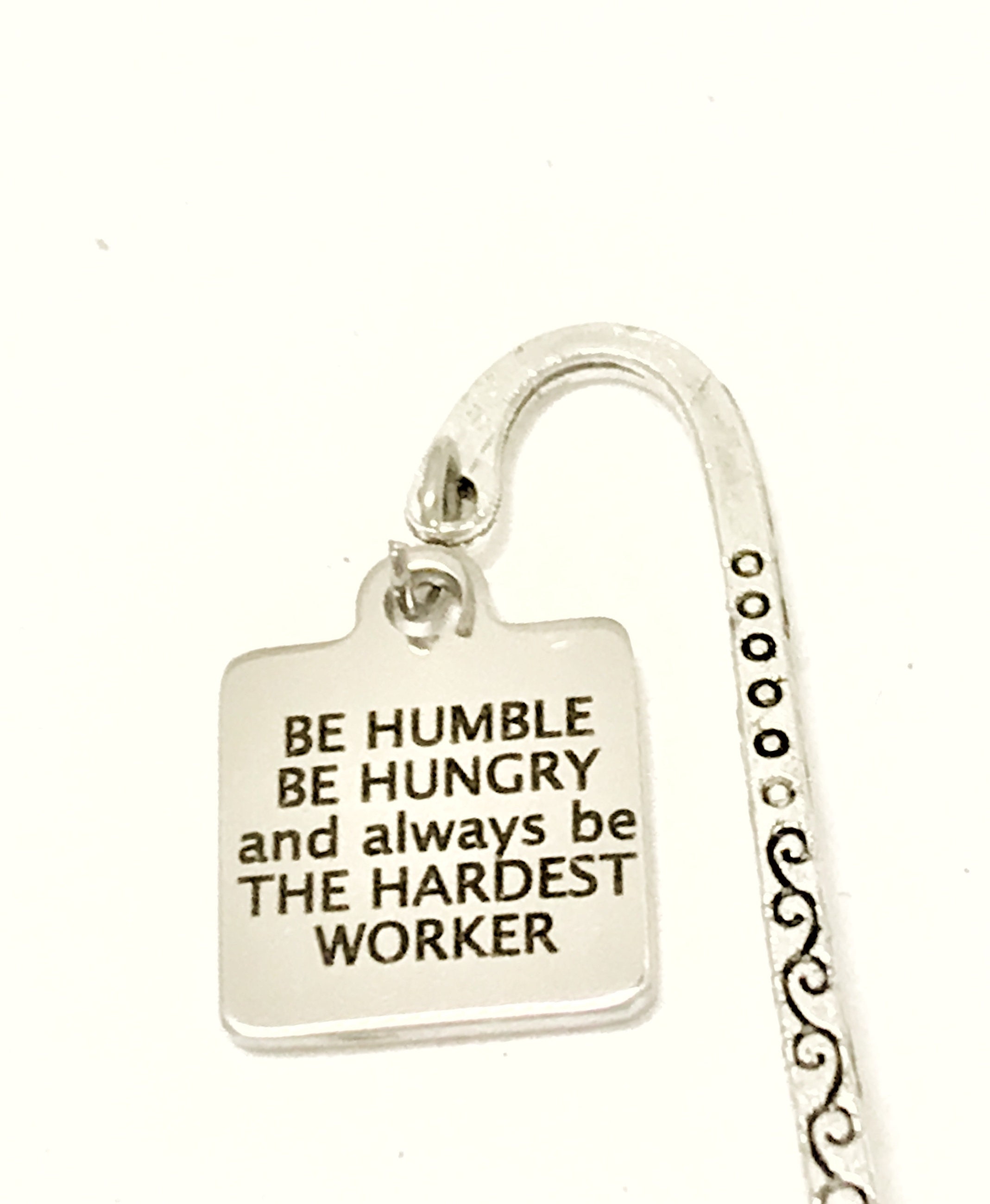 This is a great motivating bookmark reader gift. It has a "Be Humble Be Hungry and always be The Hardest Worker" stainless steel laser engraved charm on a metal bookmark. The bookmark measures approx. 3.3 Inches in length.