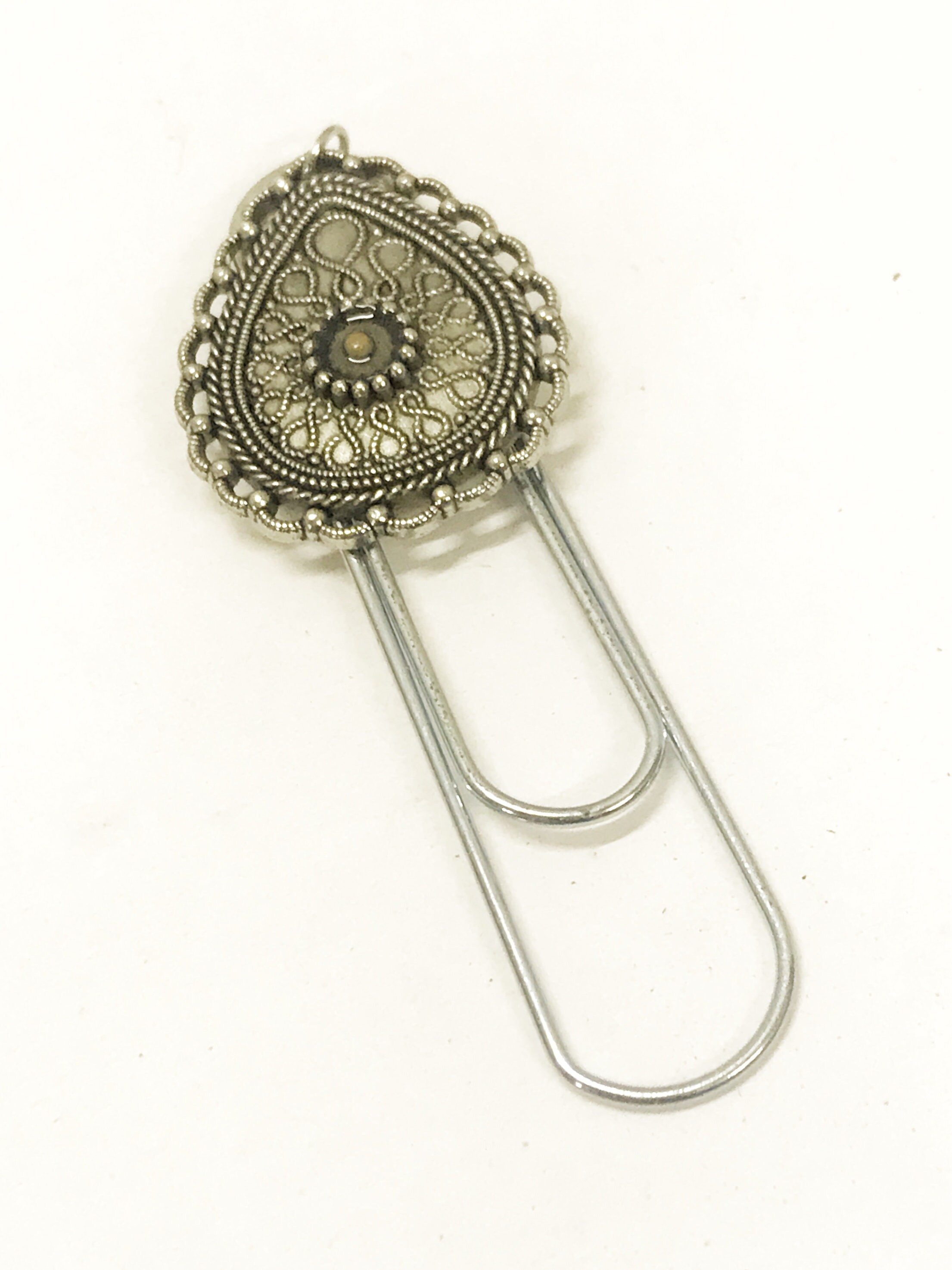 This is a great large paper clip style bookmark that has a ornate teardrop mustard seed charm on it to remind us of the Bible verse of Matthew 17:20 that tells us with the faith of a mustard seed we can move mountains. It can be used as a bookmark, page marker, or planner book mark.