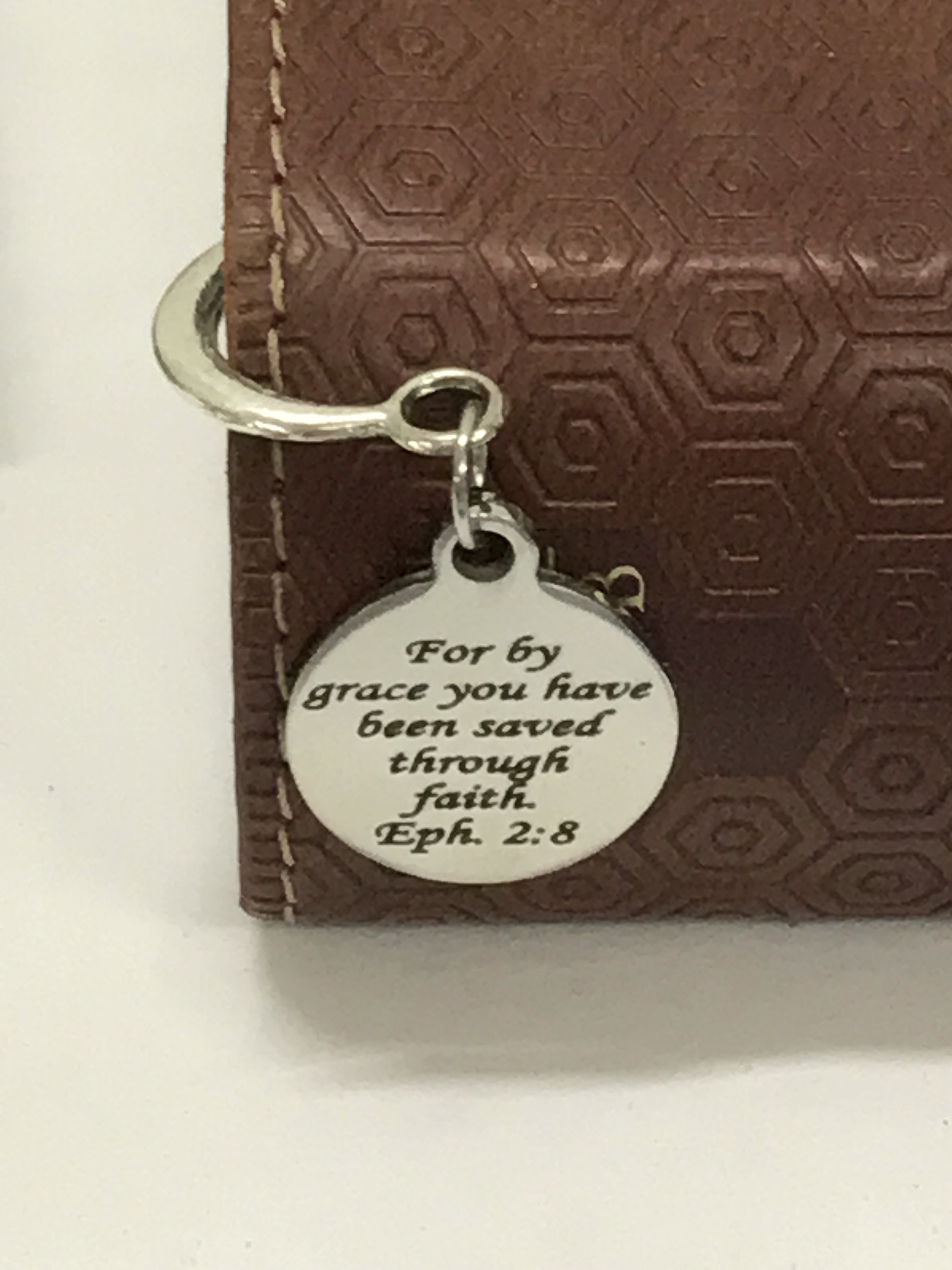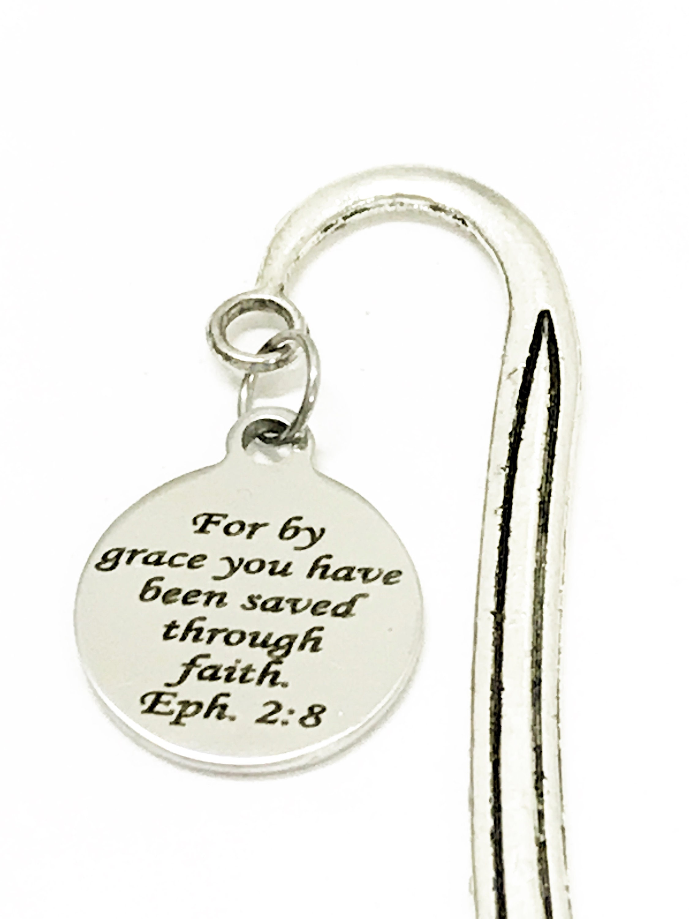 This Christian bookmark would make a great reader gift, Bible bookmark or planner bookmark. It has a charm that has a stainless steel laser engraved charm with "For by grace you have been saved through faith" from Ephesians 2:8 on it.