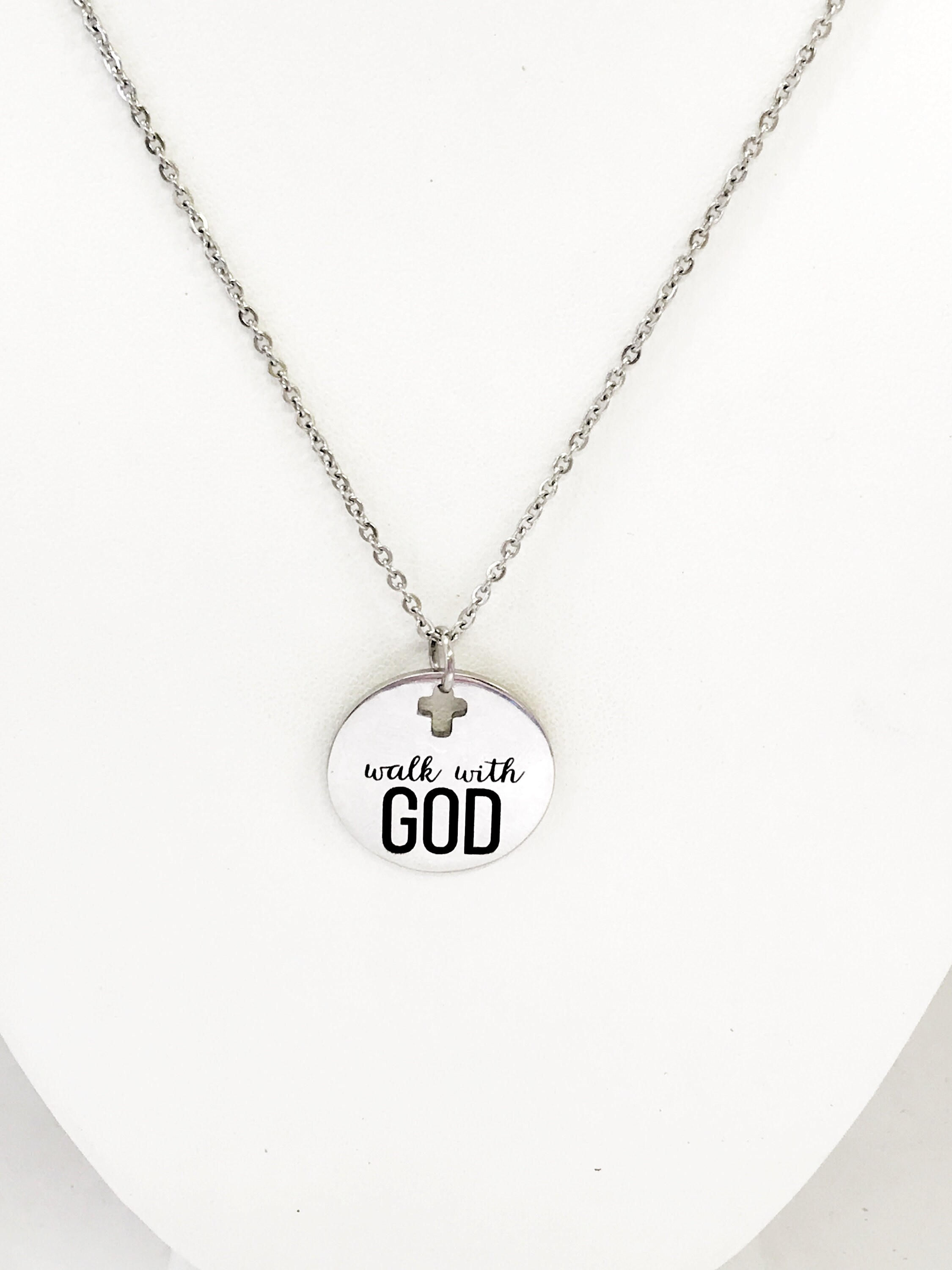 This is a simple but Christian gift pendant necklace. The pendant is a stainless steel laser engraved charm that has “walk with God” on it. This pendant is available on your choice of 16, 18, 20, 22, 24, 26, 28 or 30 inch chain. The pendant is also available for individual purchase if you have another chain on which you would like to wear it.