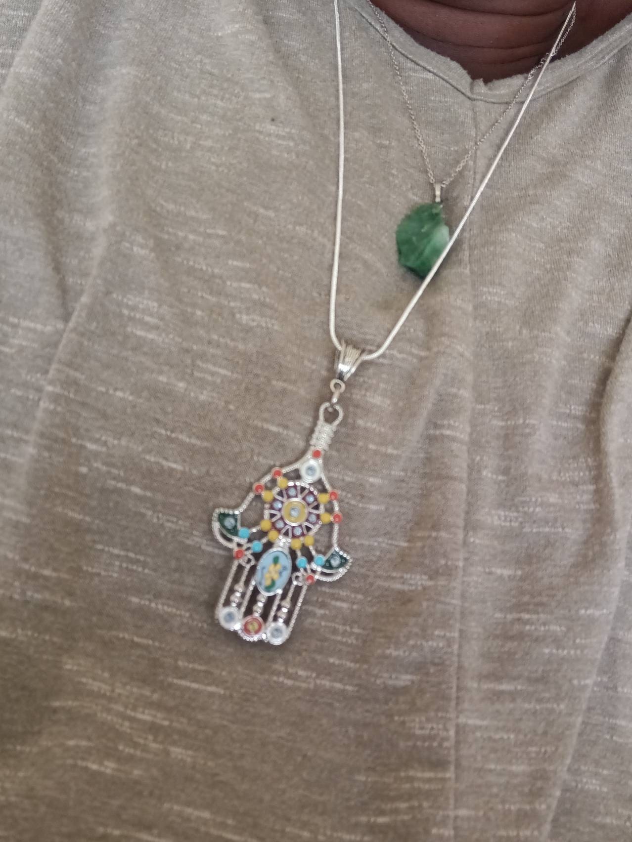This is a silver-tone hamsa pendant necklace. The hamsa or hand of Fatima is a protective symbol that is worn to bring protection or good luck to the wearer. This one has beautiful colors on it. The pendant measures approx. 2.25 iInches long by approx. 1.5 inches across (58mm x 37mm).