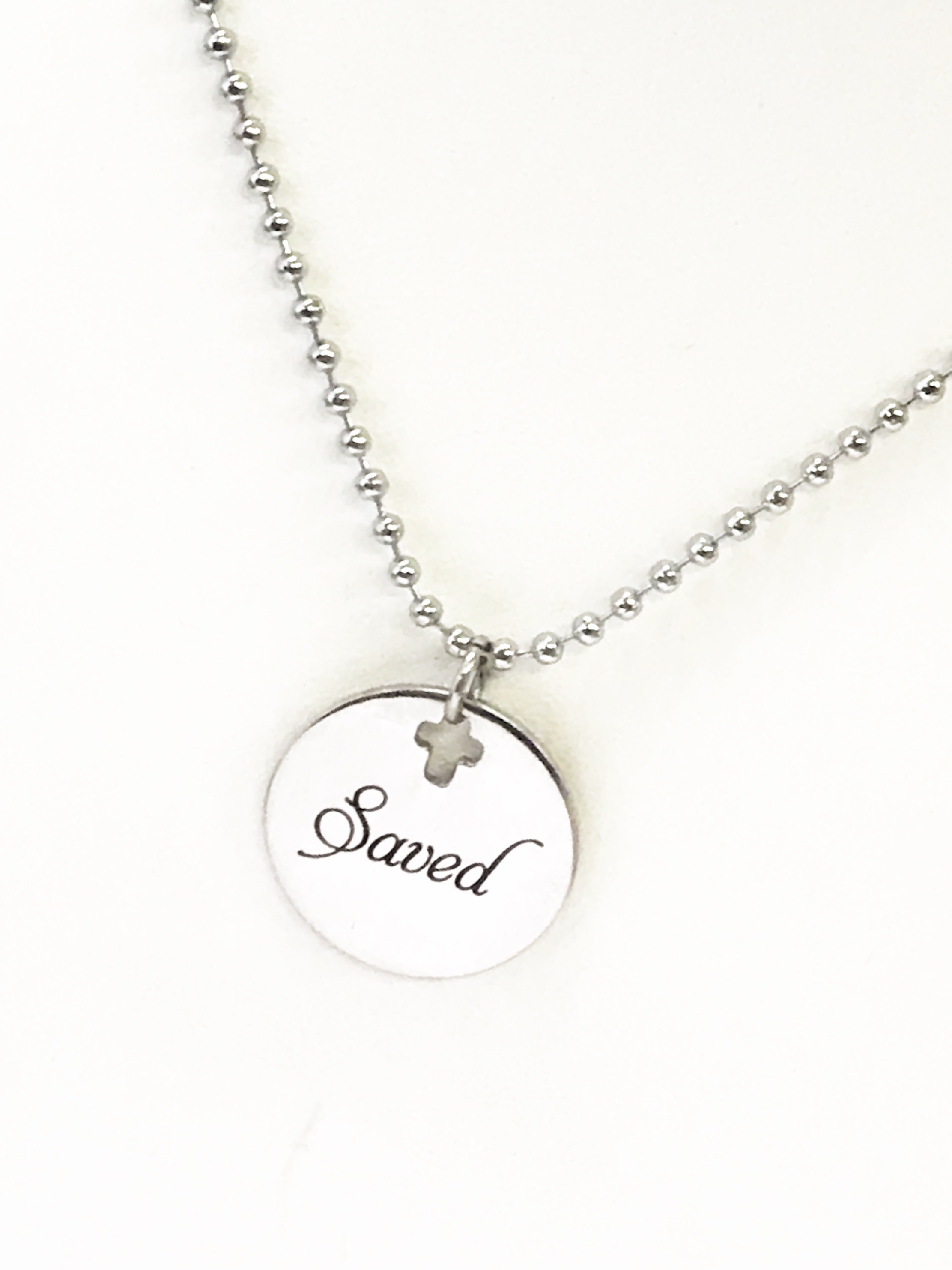 This necklace would make a great Christian necklace gift. The pendant is a laser engraved charm on a 24 inch stainless steel ball chain. The charm has "Saved" on it.