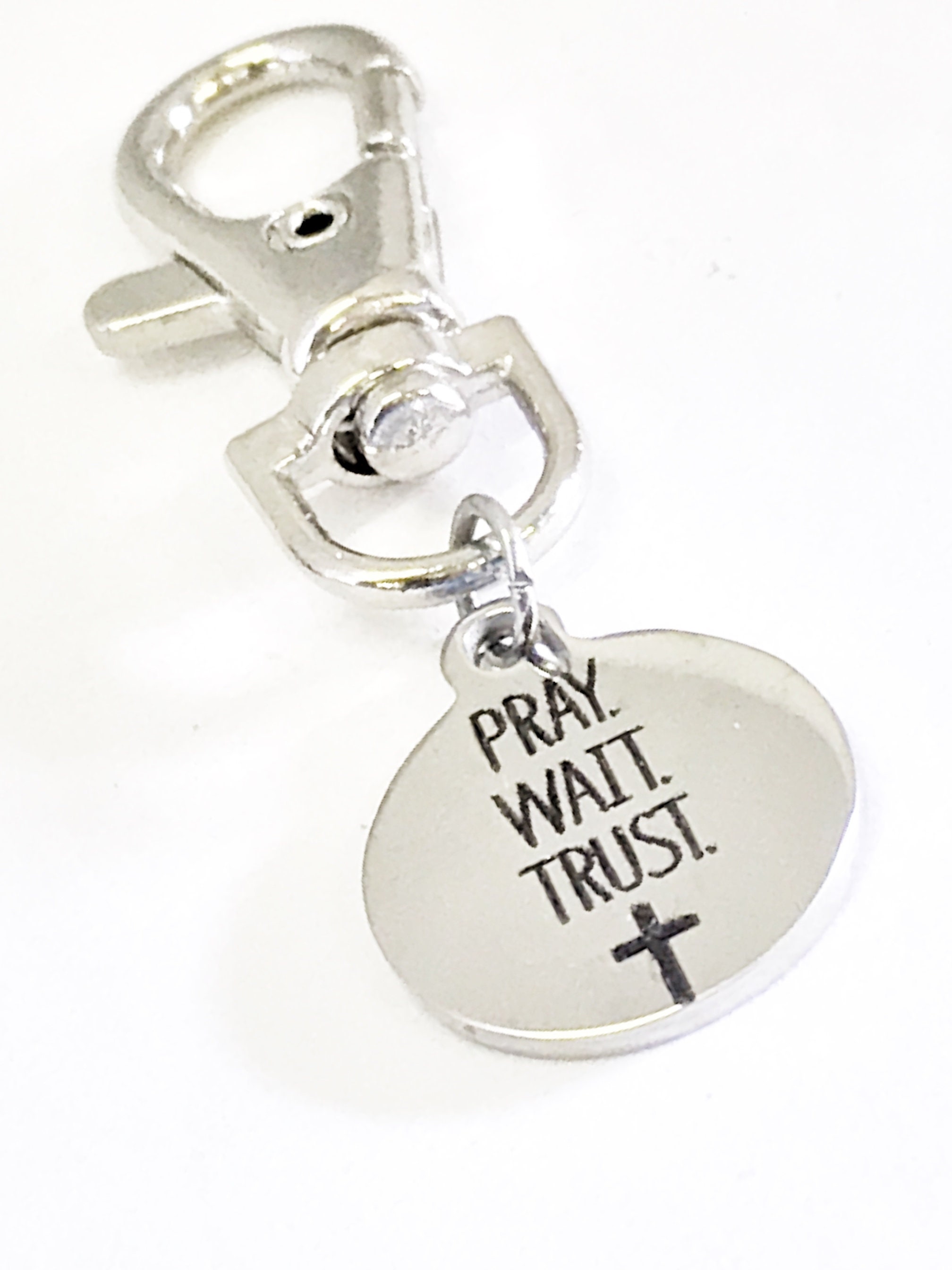 This is a great encouraging gift zipper pull or bag charm with “Pray Wait Trust” on it. This would be a great gift to remind someome that whatever you do in life, you should pray about it, wait on God, and trust in His timing.