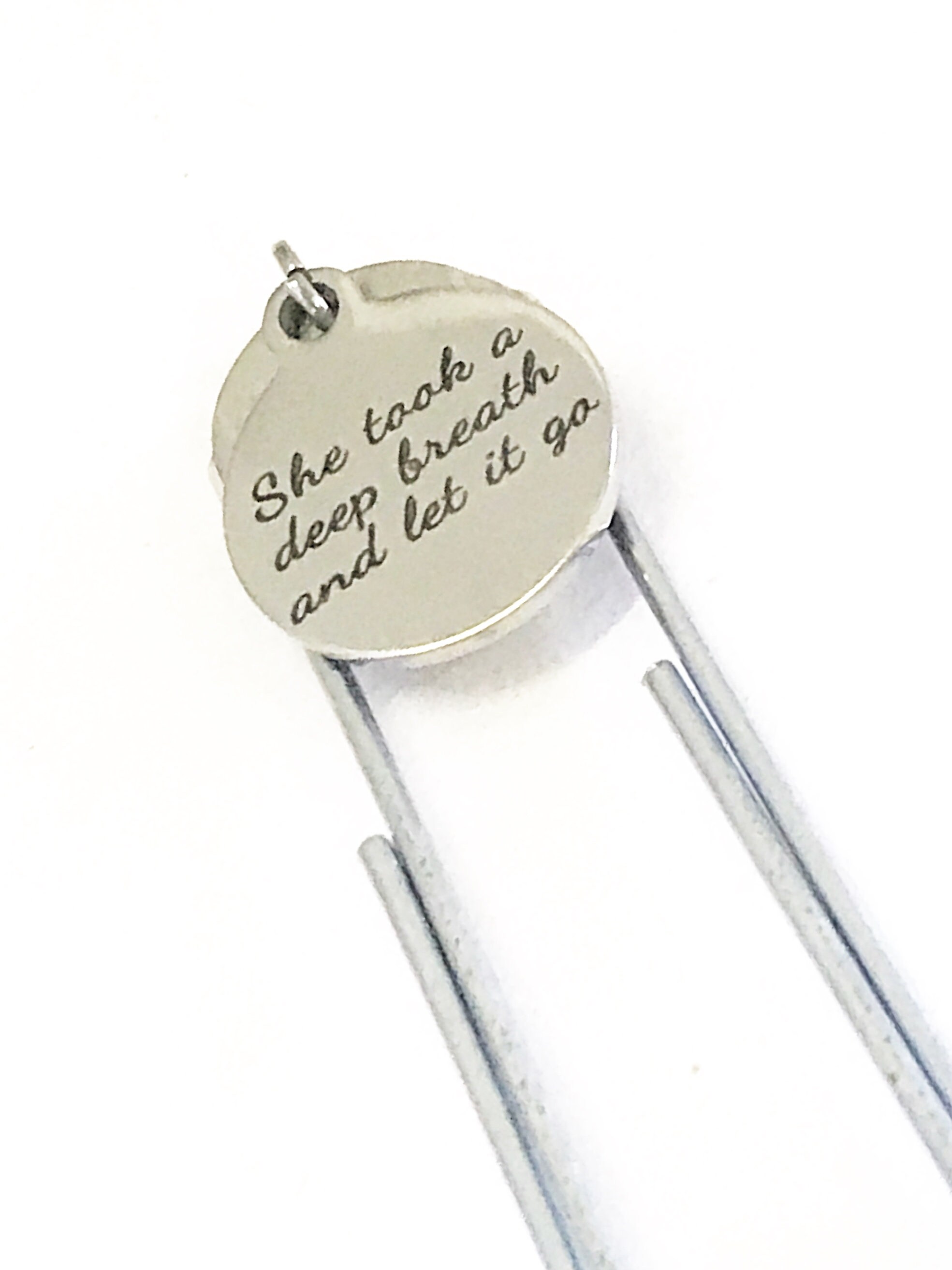 This is a great motivating gift bookmark. This paper clip bookmark has a stainless steel laser engraved charm with "She took a deep breath and let it go" on it. It can be used as a Bible bookmark, page marker, or planner book mark.