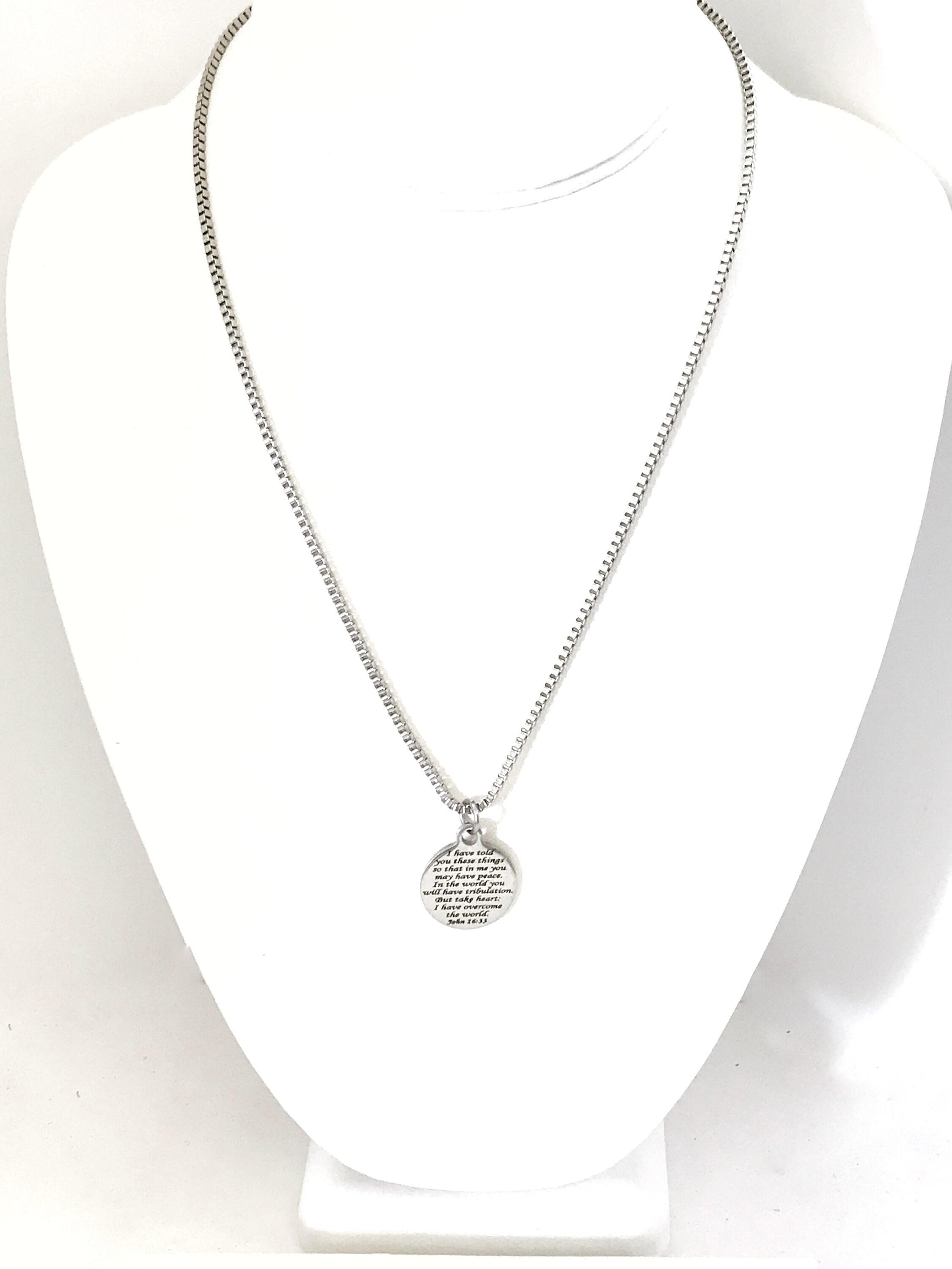 This is great Bible Verse Christian necklace gift. This necklace comes with a stainless steel laser engraved charm pendant on a 22 inch stainless steel box chain. The pendant has the following verse from John 16:33 on it: