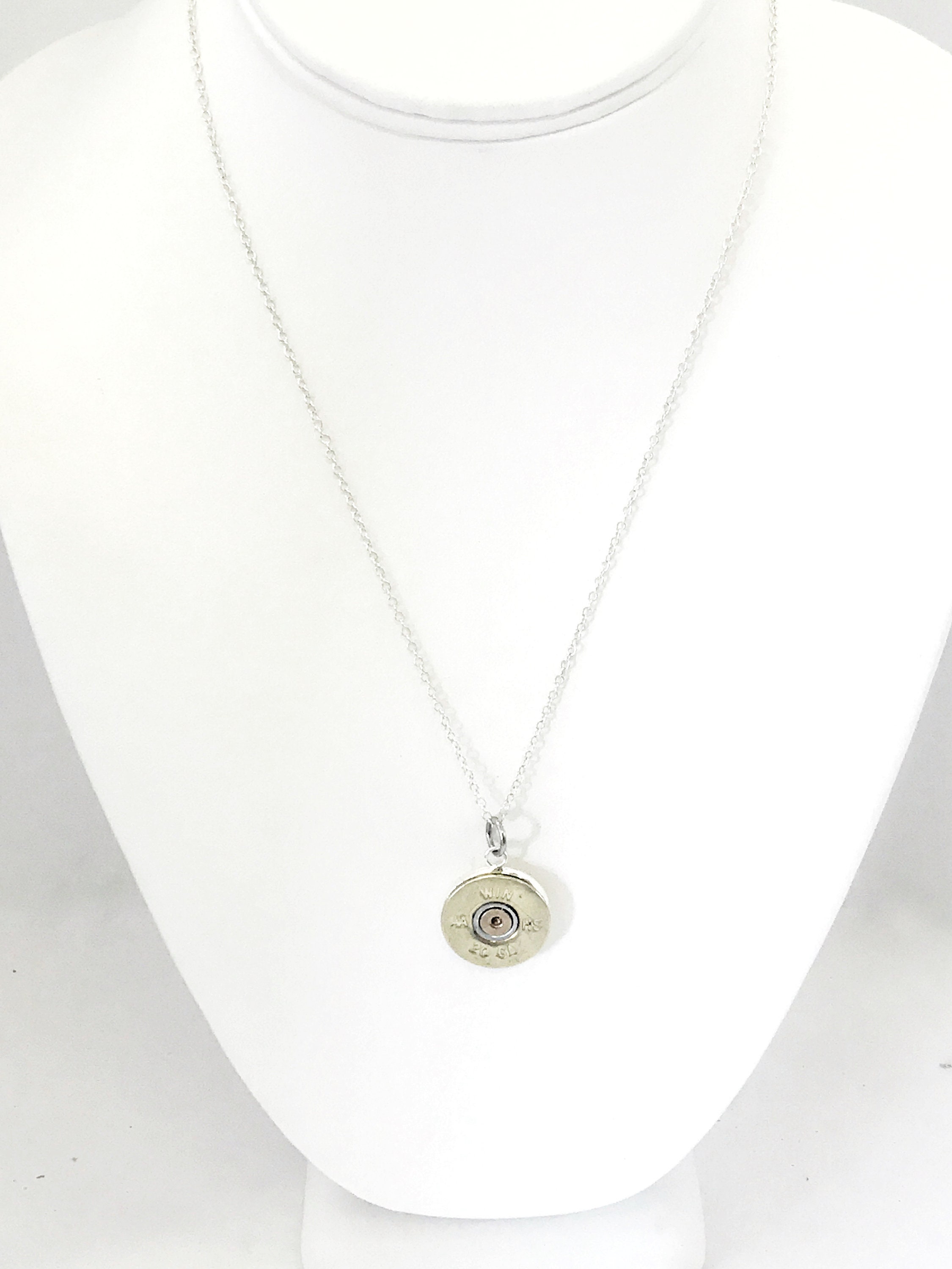 This shotgun shell pendant necklace makes a great gift to remind someone to shoot for the stars. It would also be a great gift for someone that loves the shooting sports. The pendant comes on a silver-plated link chain. This pendant is available on your choice of 16, 18, 20, 22, 24, 26, 28 or 30 inch chain. The pendant is also available for individual purchase if you have another chain on which you would like to wear it.