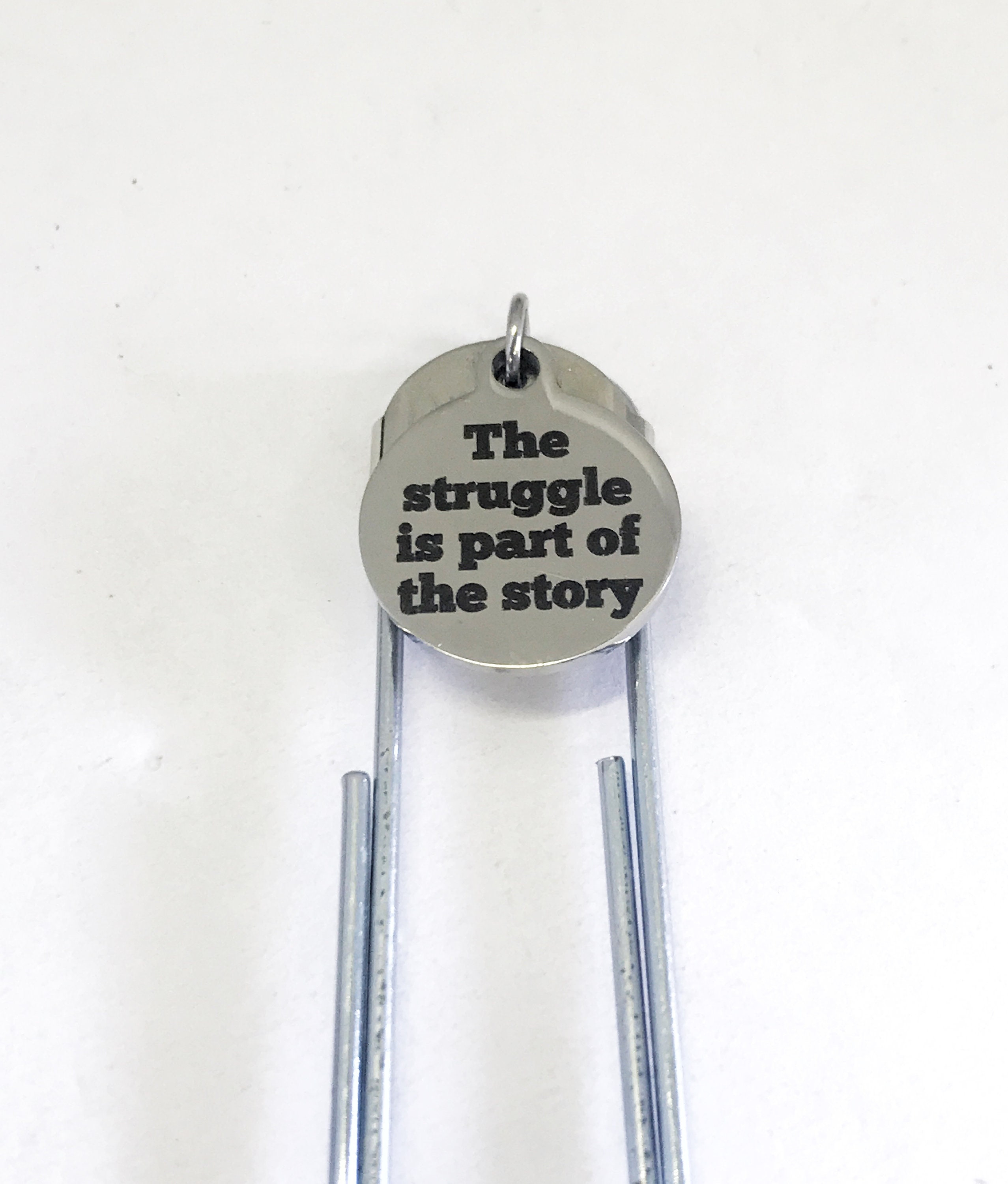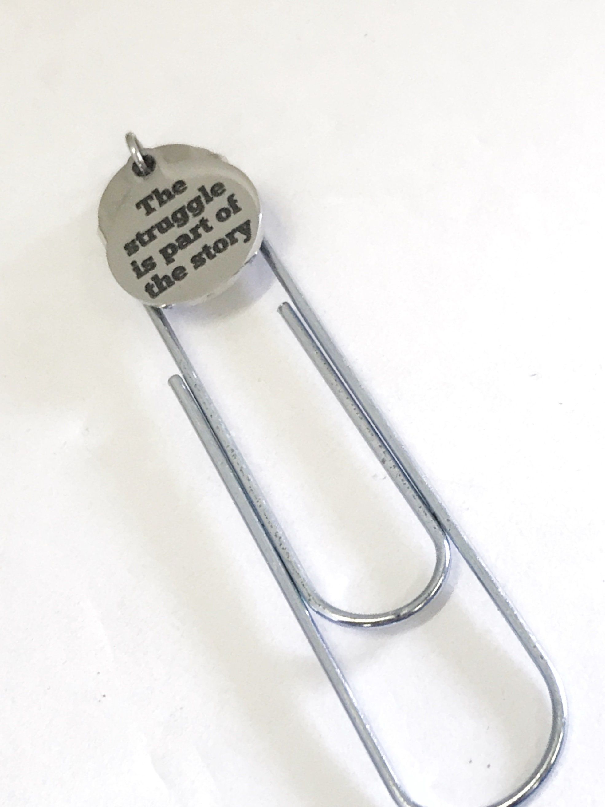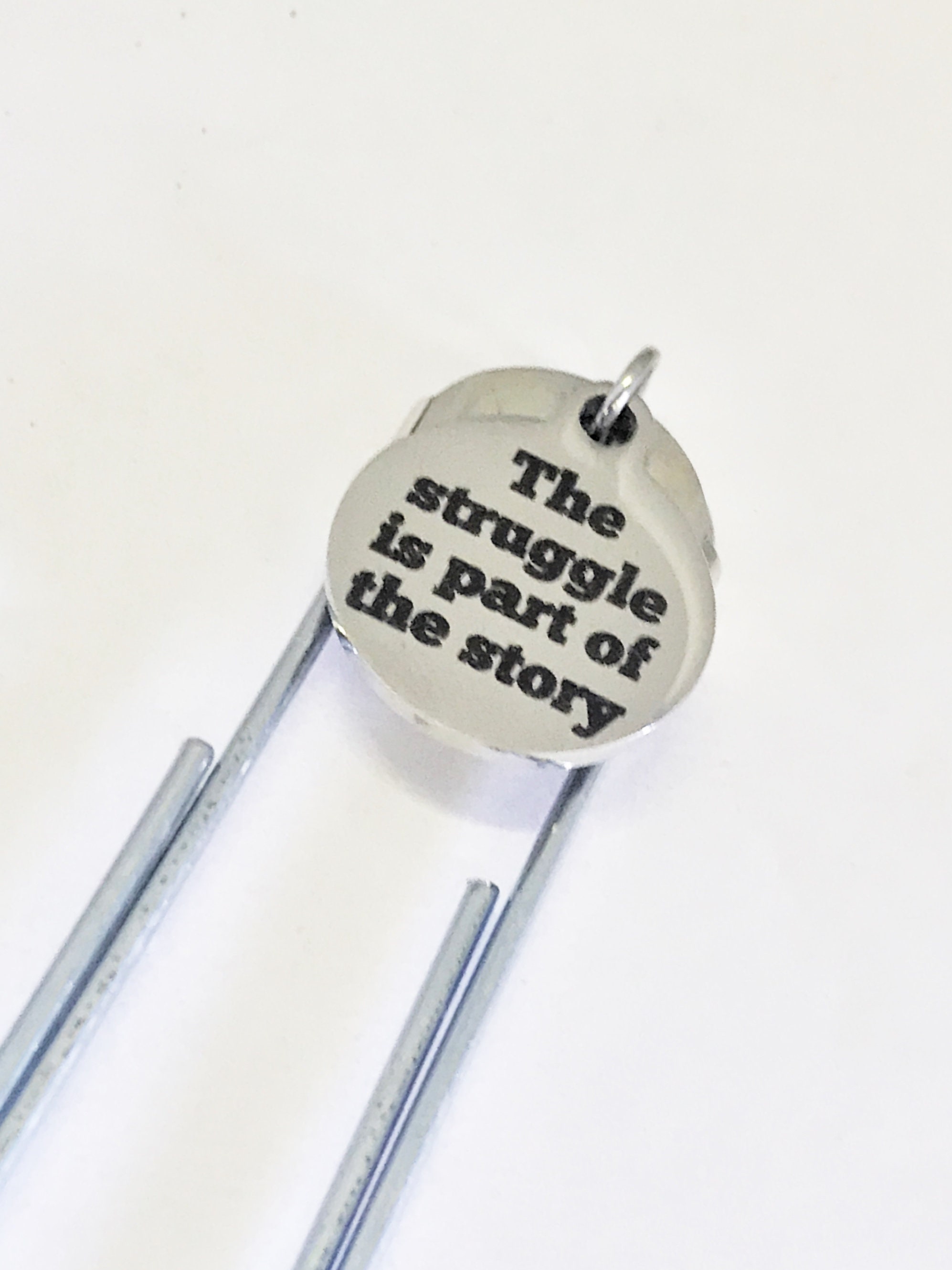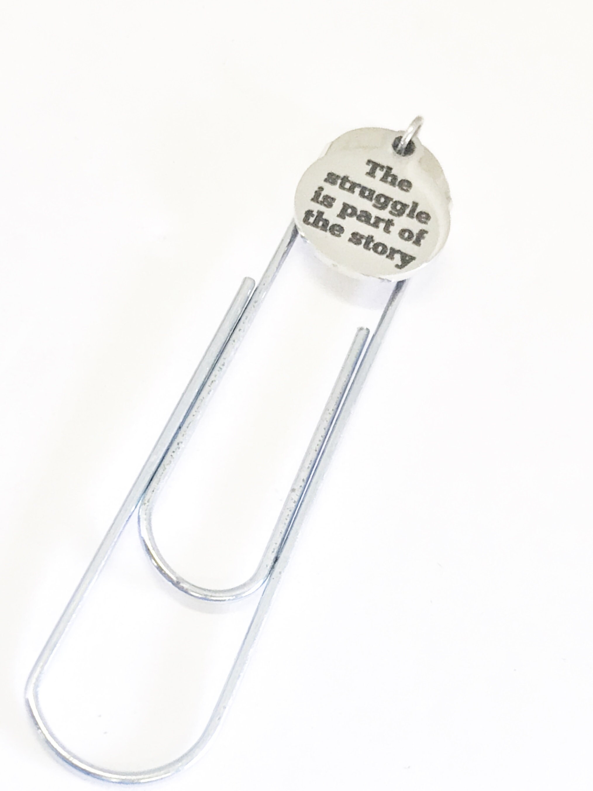 This is a great planner paper clip bookmark. This paper clip bookmark has a stainless steel laser engraved charm with “The struggle is part of the story”. It can be used as a Bible bookmark, page marker, or planner book mark.