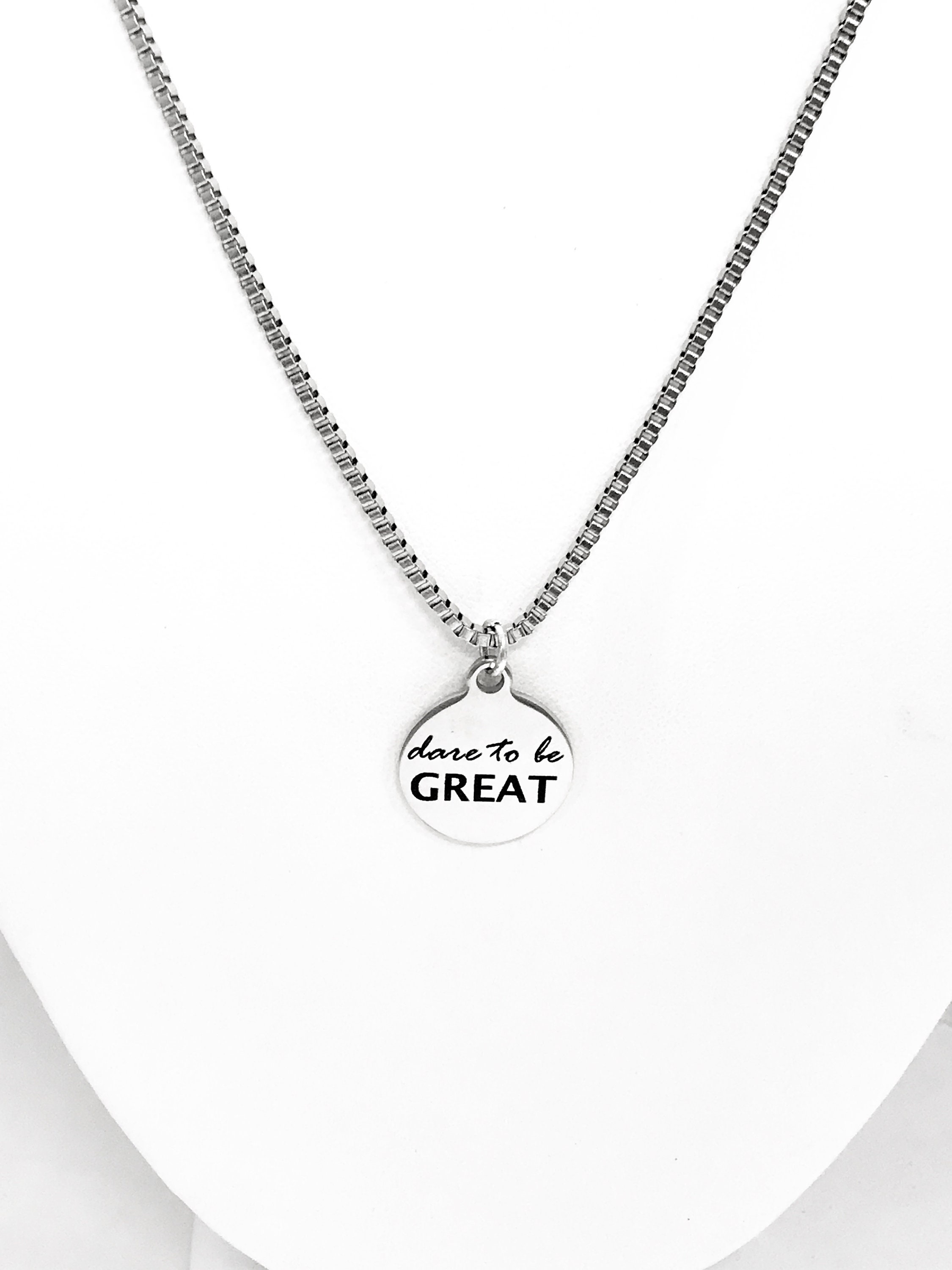 This is great motivating gift necklace. This necklace comes with a stainless steel laser engraved charm pendant on a 20 inch stainless steel box chain. The pendant has “dare to be GREAT” on it. The pendant is also available for individual purchase if you have another chain on which you would like to wear it.