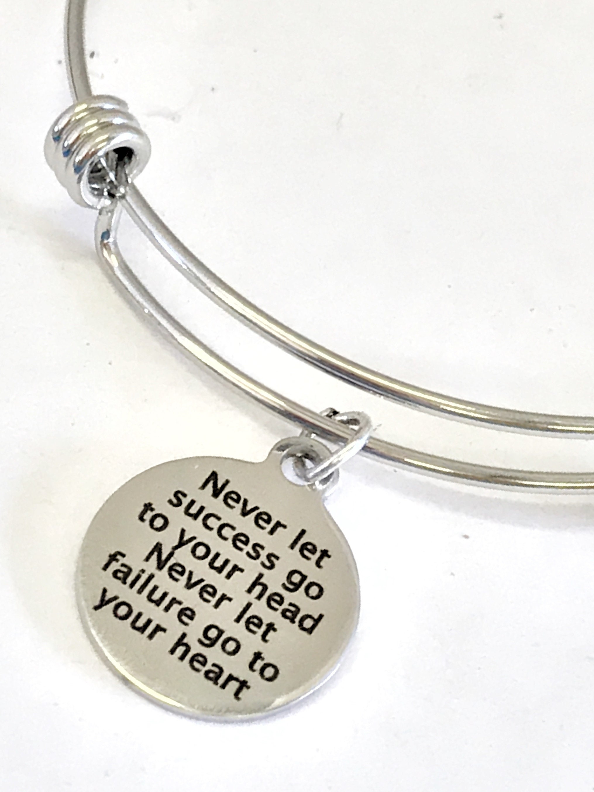 This is a beautiful encouragement gift bangle bracelet with a laser engraved stainless steel charm that has “Never let success go to your head never let failure go to your heart" on it.