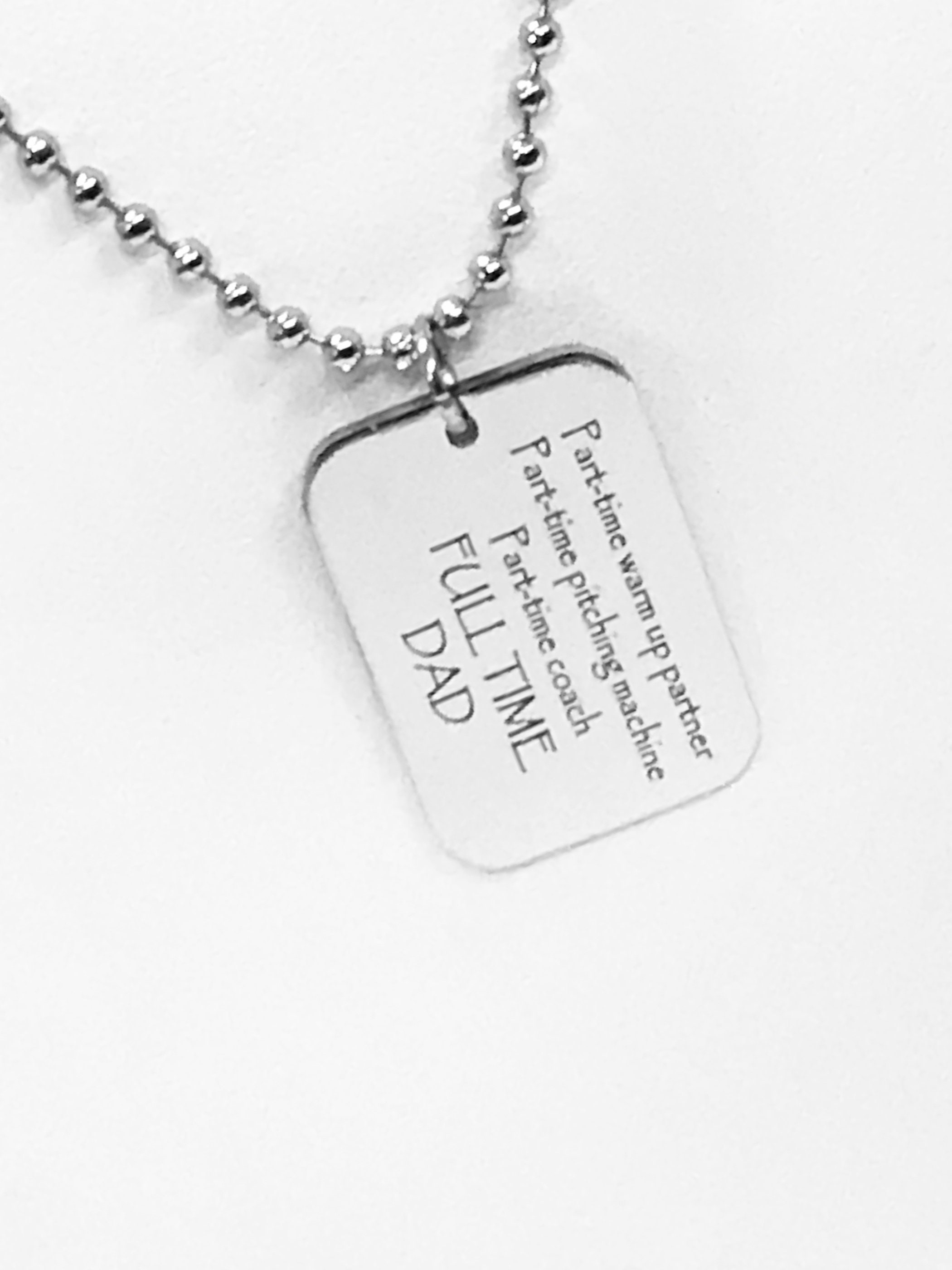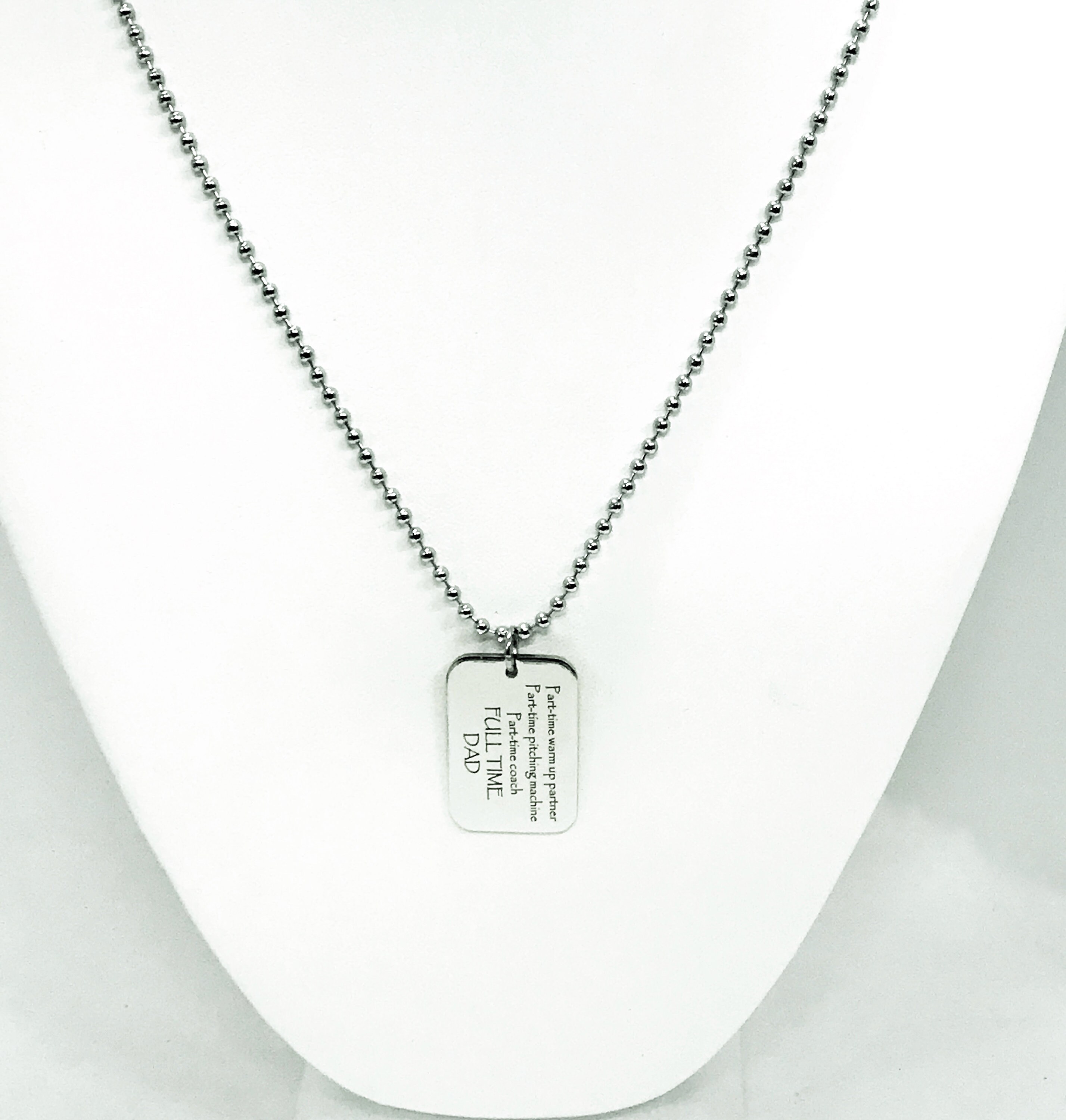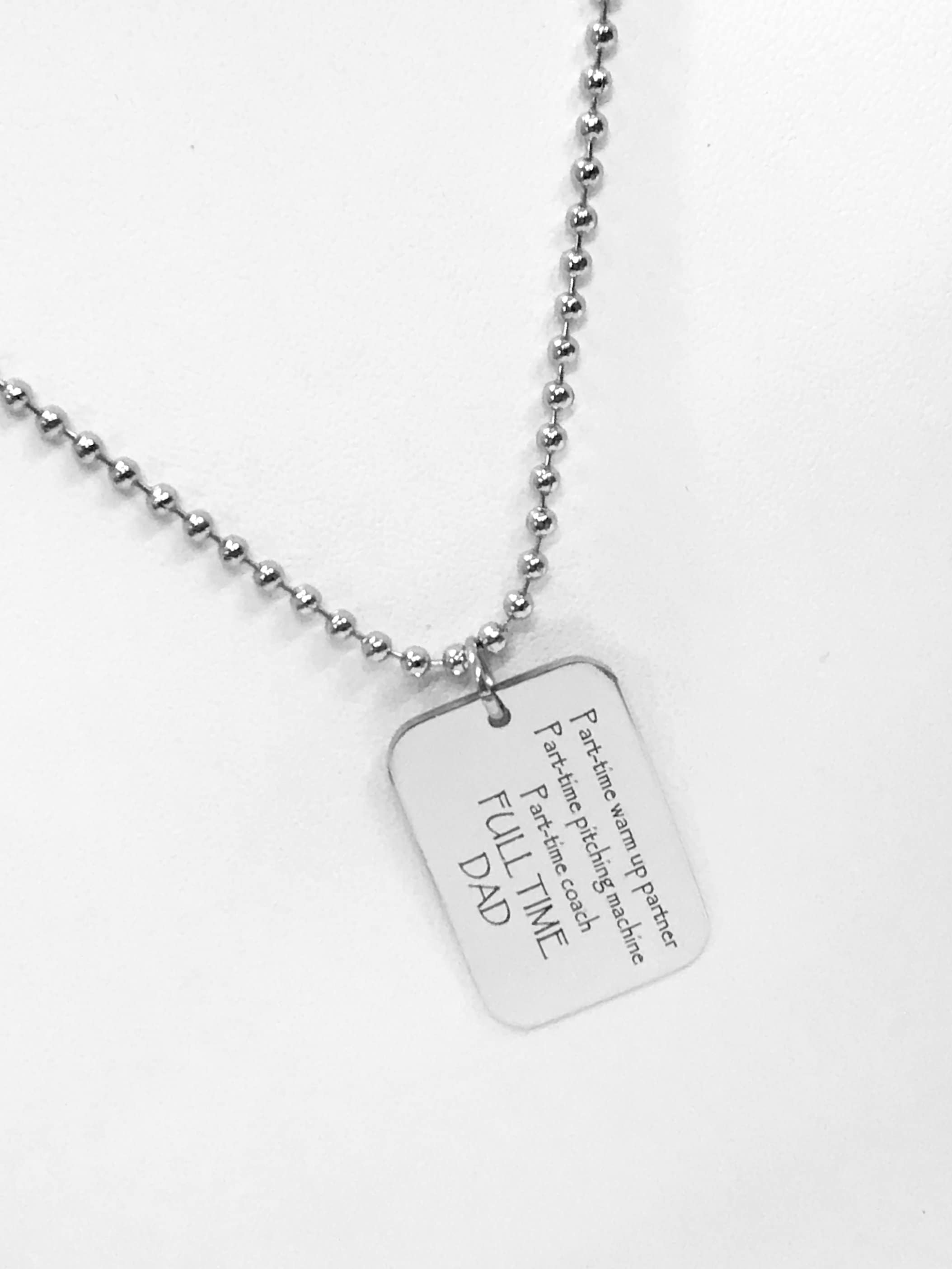 This necklace would make a great Father’s Day or end of baseball season Dad coach gift. The pendant is a laser engraved charm on a 24 inch stainless steel ball chain. The charm has the following on it: