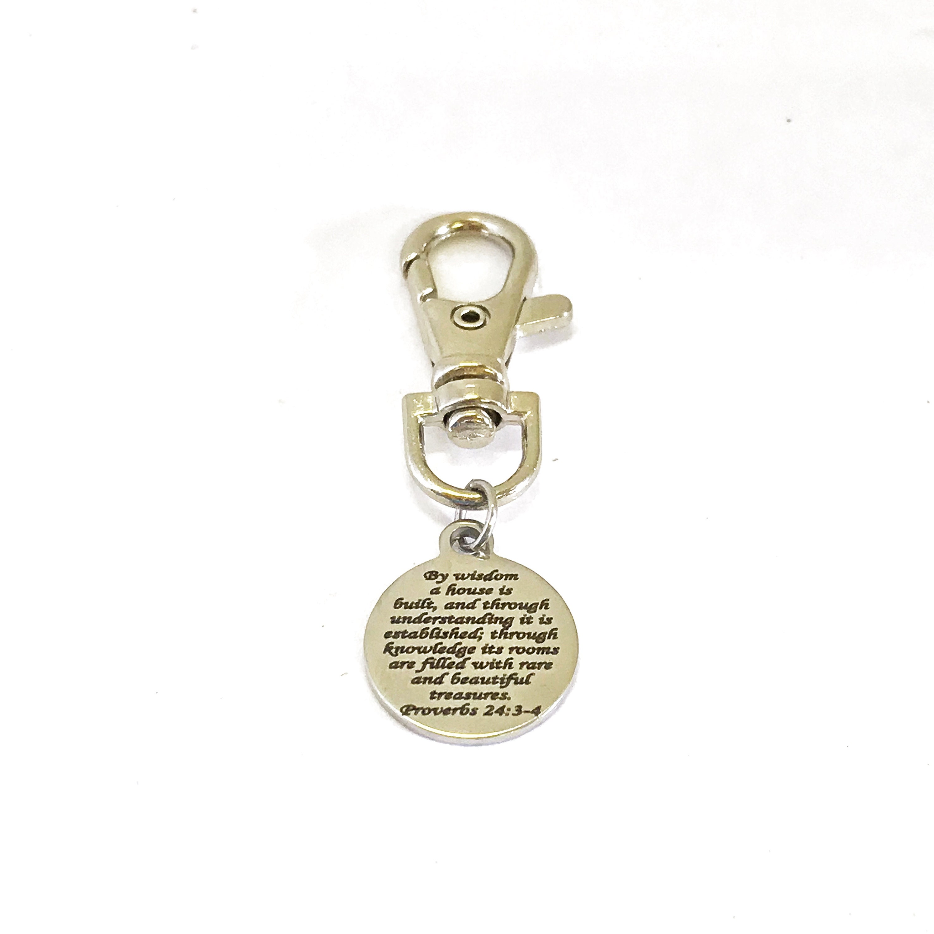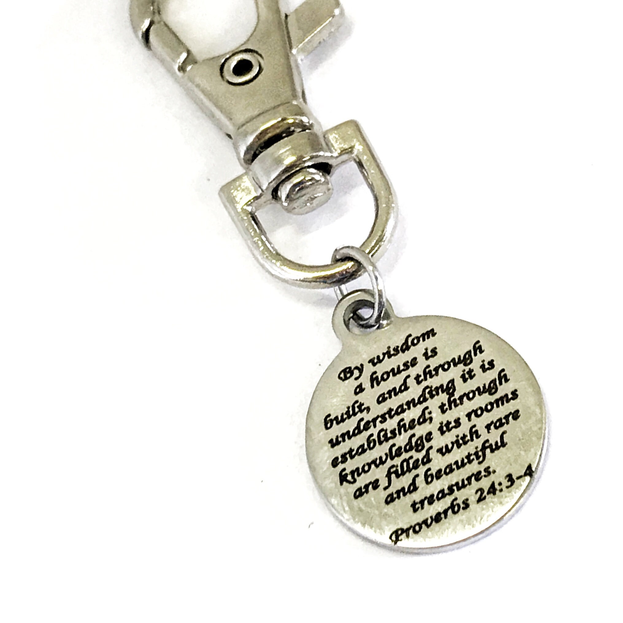 This is a great zipper pull or bag charm gift that would be perfect for a newlywed couple or someone establishing a Christian home. It has “By wisdom a house is built and through understanding it is established; through knowledge its rooms are filled with rare and beautiful treasures” from Proverbs 24 verses 3 and 4 on it.